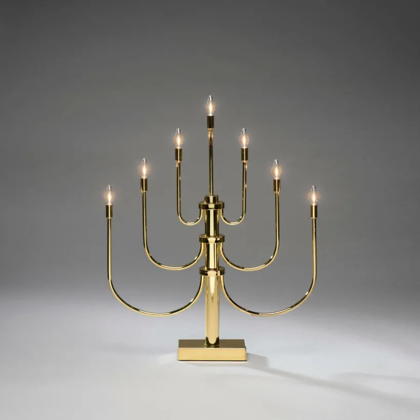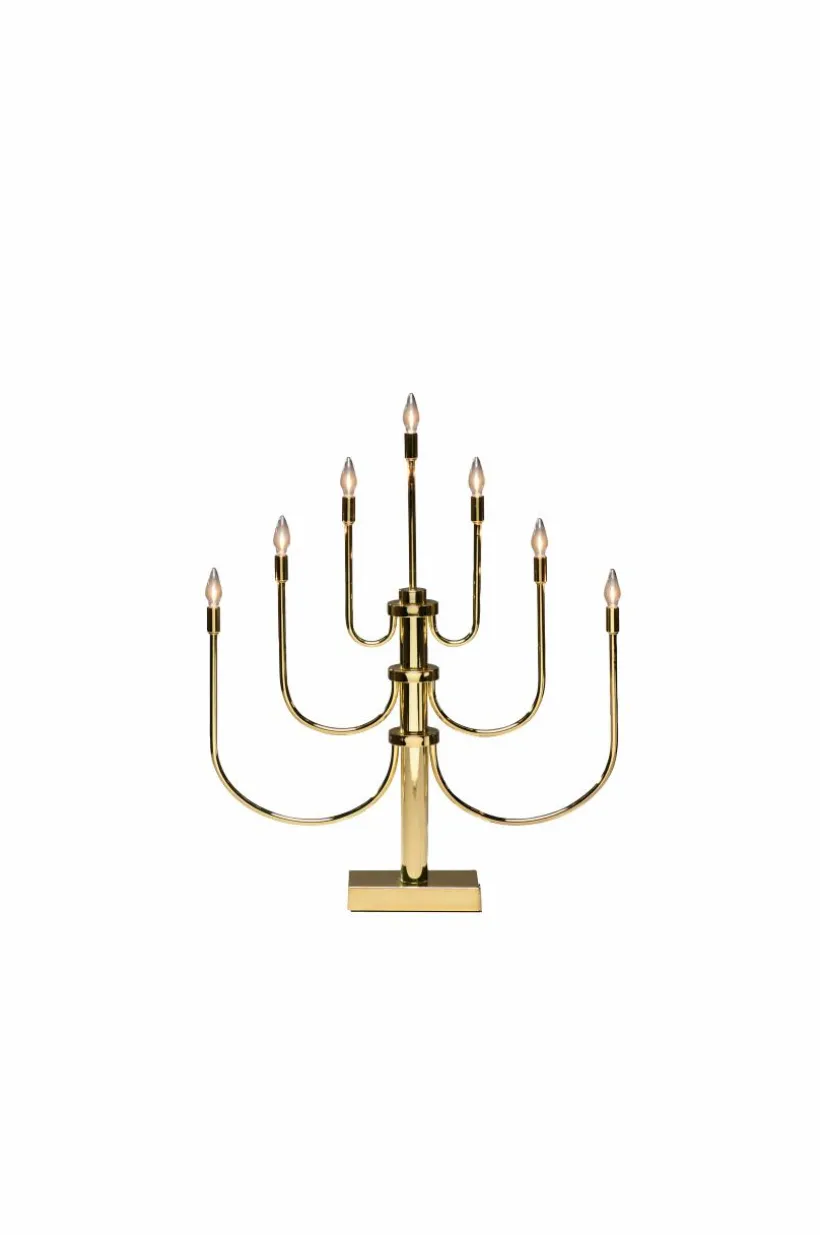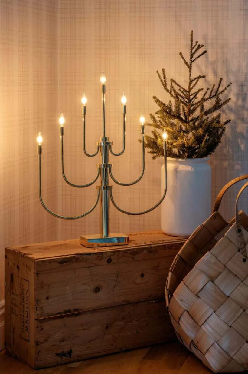 En 7-armad elljusstake i stål. Drivs med en 24v transformator. Anslutningssladd på 2,4 meter med sladdströmbrytare för manuell avstängning/påslagning. Höjd 55,5 cm och bredd 44,5 cm