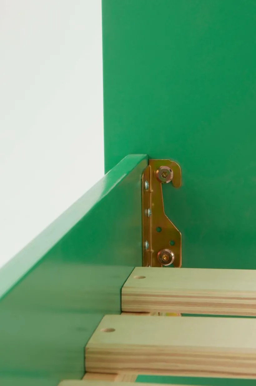 Barnsäng av FSC-märkt MDF. Sängramen har målad yta och färgen är vattenbaserad. Sängen är mysig och känns ombonad med gavlarna som ramar in. Praktisk ribbotten av plywood bidrar till ett behagligt sovklimat när luften kan cirkulera. Ribbotten vilar på FSC-märkt furulist. Kombinera med madrass i storlek 120×200 cm. Madrass medföljer ej. Viss montering krävs. Monteringsanvisning medföljer.