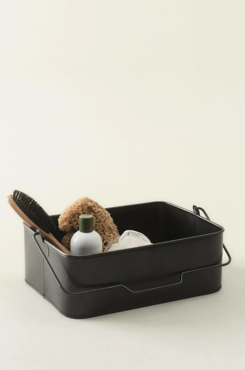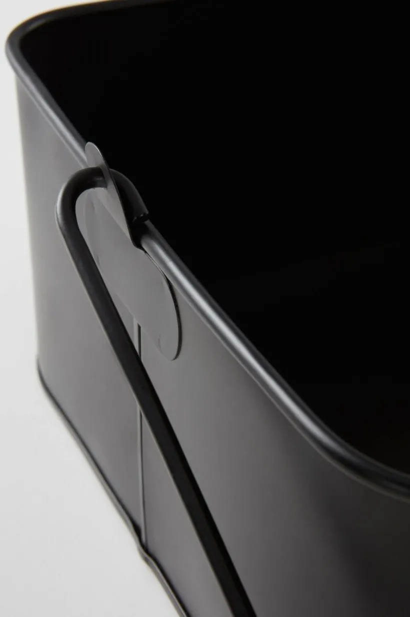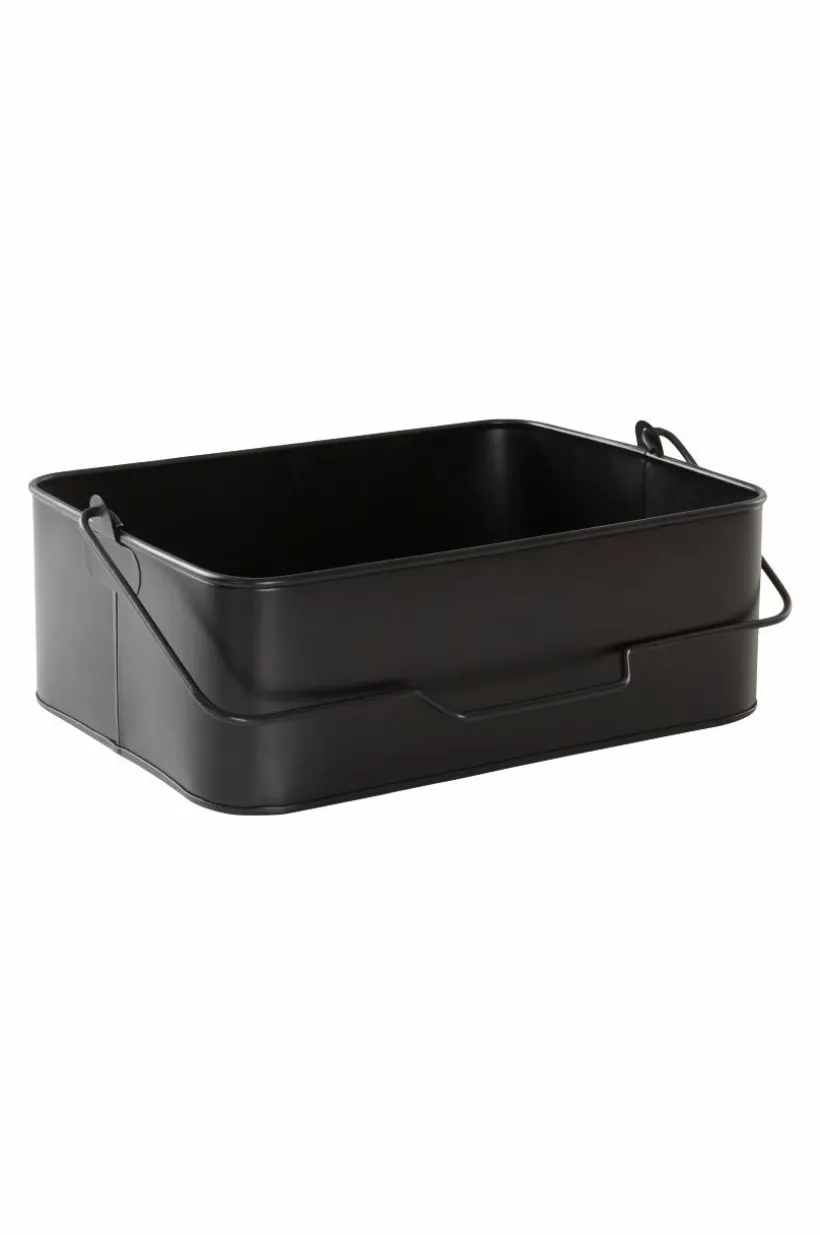 Förvaringslåda med handtag, tillverkad av järn med svart finish. Lådan har rundade hörn och ett stort fack. Perfekt att samla småsaker i, kanske tvättstugan eller barnkammaren? Handtaget gör den praktisk att bära med sig. Tänk på att om lacken repas så kan järn rosta i fuktiga miljöer.