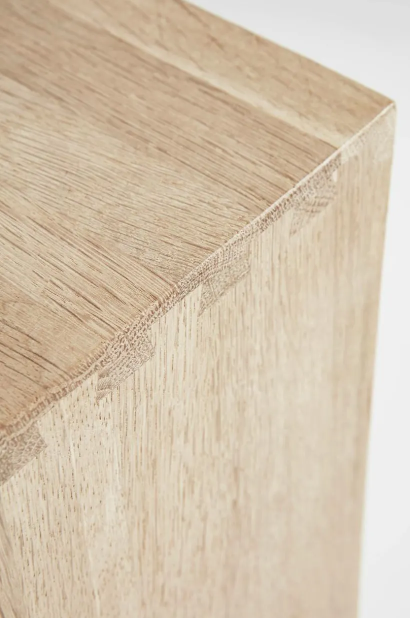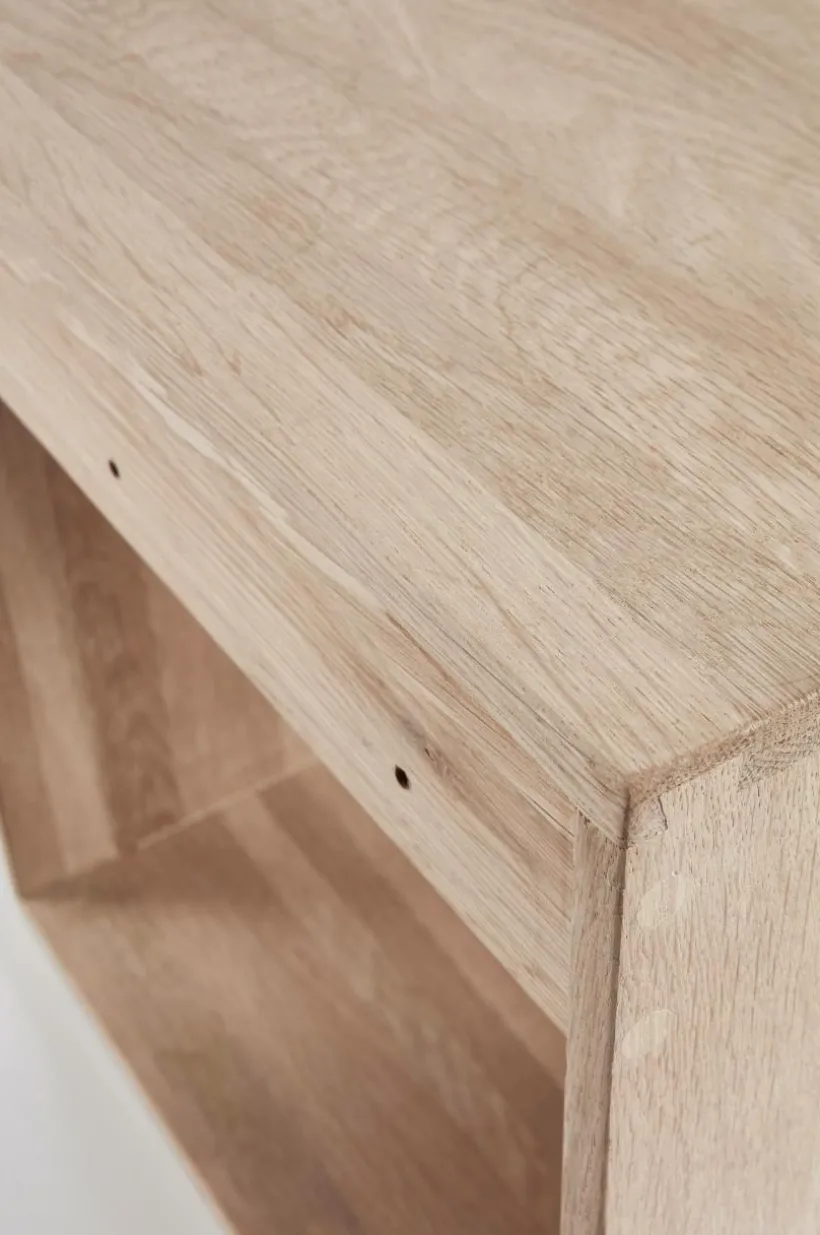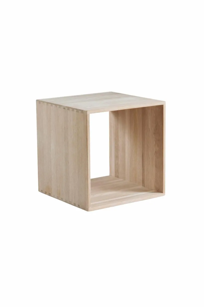 Vägghylla/sängbord av såpad ek. Den kubformade möblen är mycket flexibel och kan placeras bredvid sängen. Praktiskt då det blir enkelt att städa under. Du kan också placera en eller flera tillsammans på väggen och få en snygg hylla i den form du väljer själv.