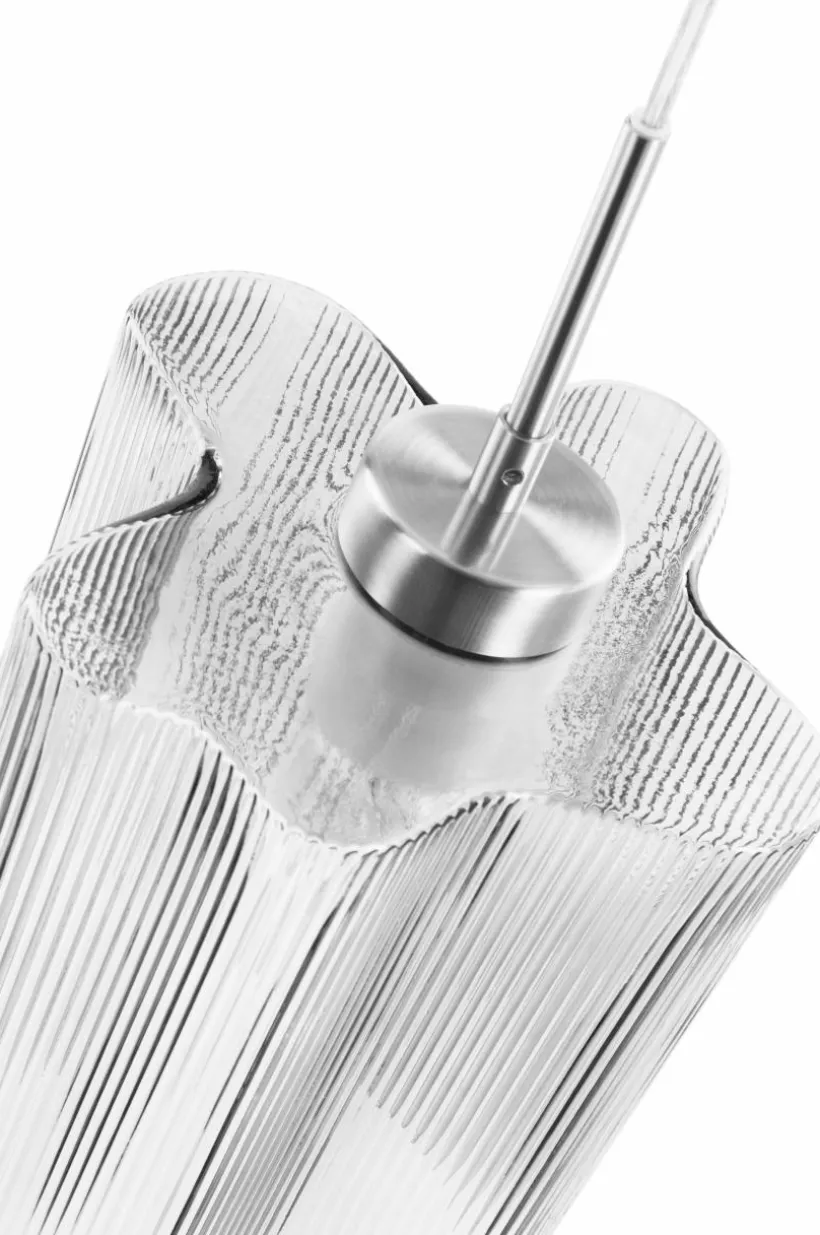 Taklampa av glas och formen är som en blomma, när naturen får inspirera blir det fint. Lampan har nedåtriktat ljus kombinerat med belysning genom glaset. Glaset har strukturränder som dämpar ljuset och ger vackert sken. EUROPA är mycket dekorativ över ett matbord, eller varför inte två eller tre på rad om matbordet är lite längre? Lampans fäste är av metall och sladden är transparent.