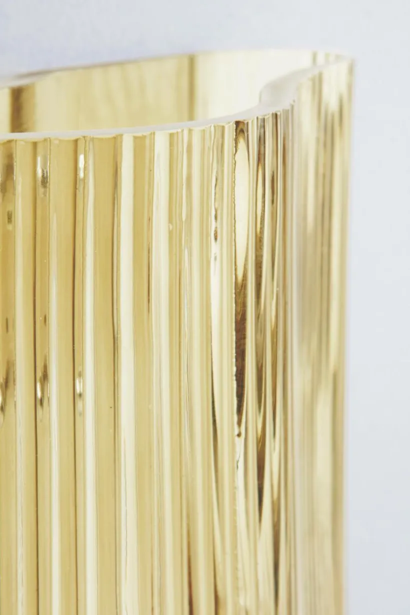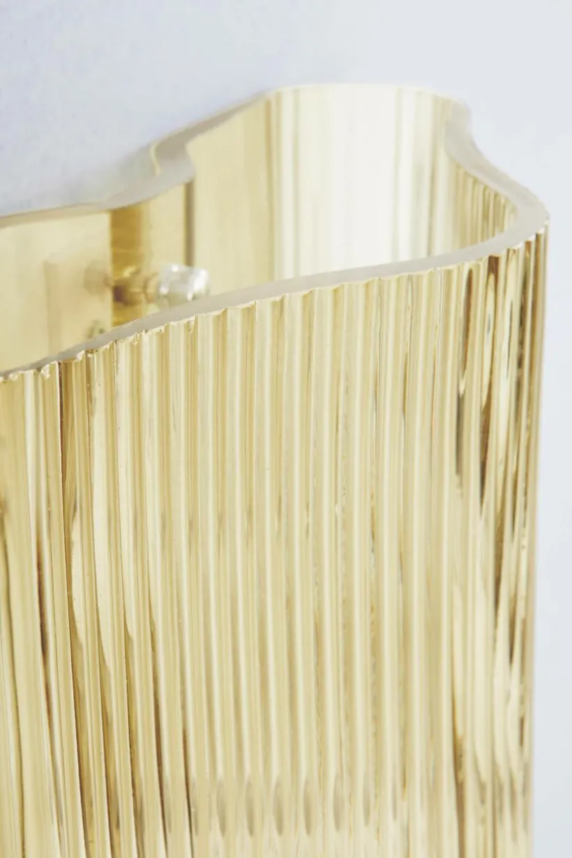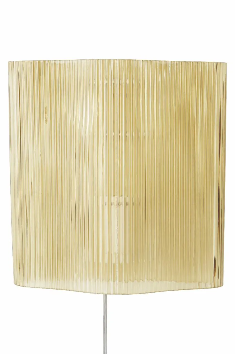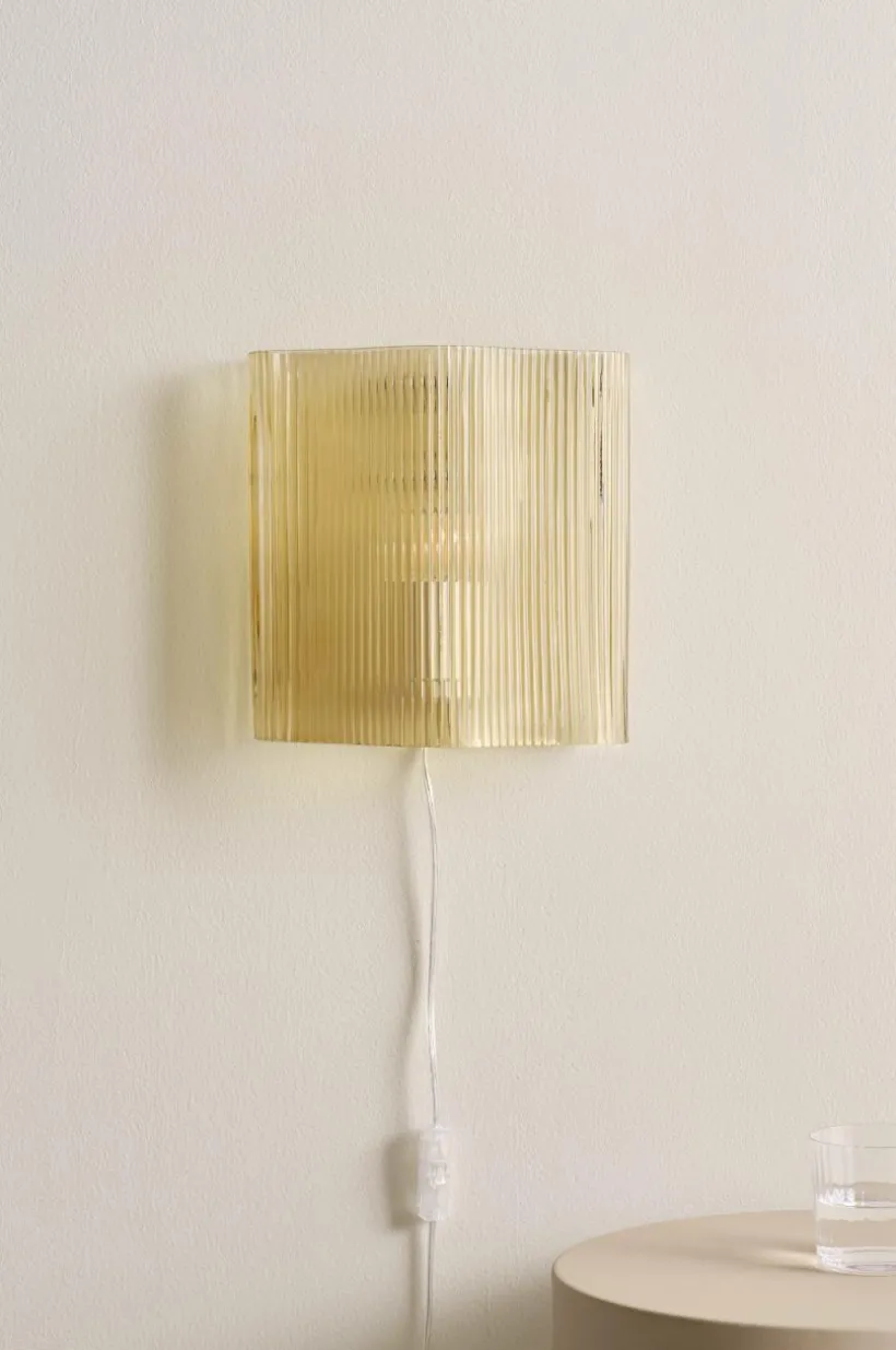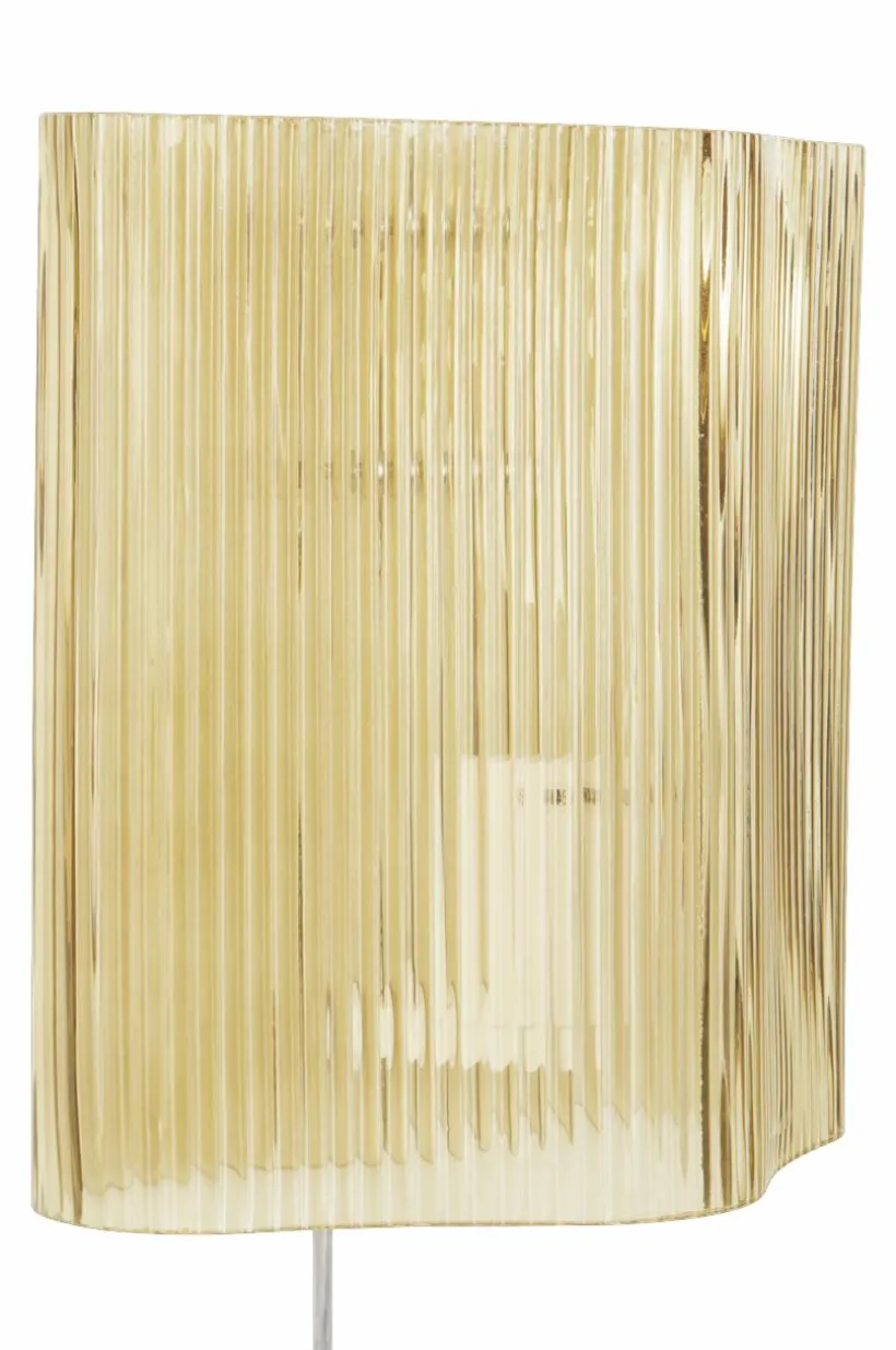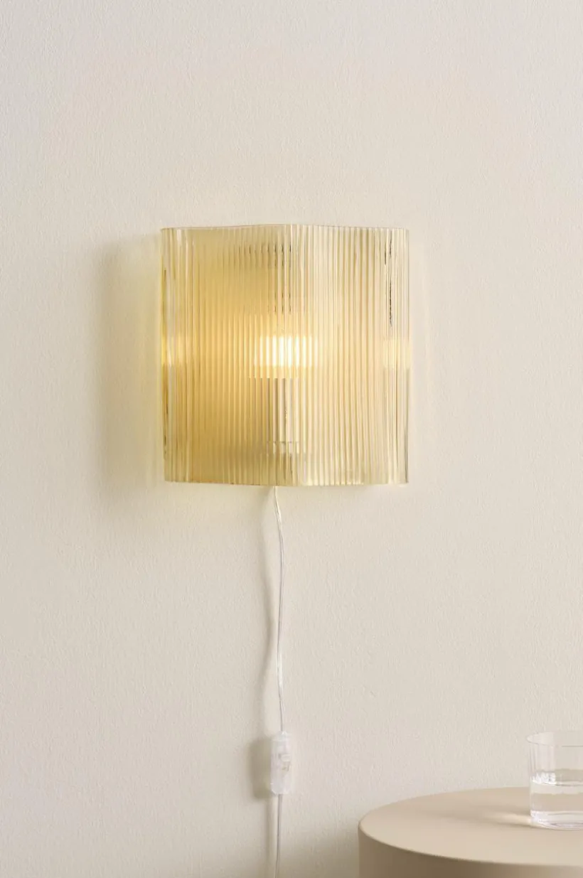 Vägglampa av glas, kupan är mjukt formad och ger viss retrokänsla. Lampan har uppåtriktat och nedåtriktat ljus kombinerat med belysning genom glaset. Glaset har strukturränder som dämpar ljuset och ger vackert sken. Lampans fäste är av metall och sladden är transparent. Strömbrytaren sitter på sladden. Lampan är ojordad, klass 2.