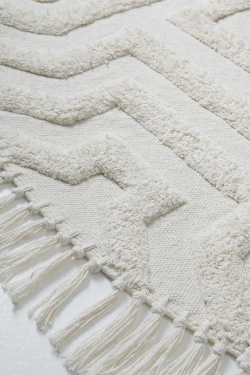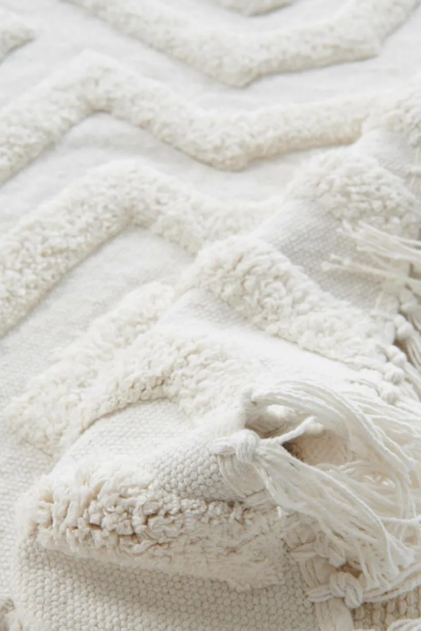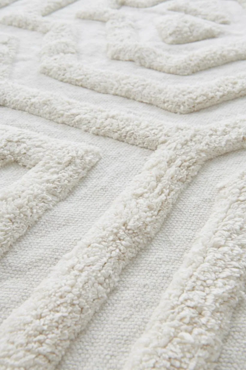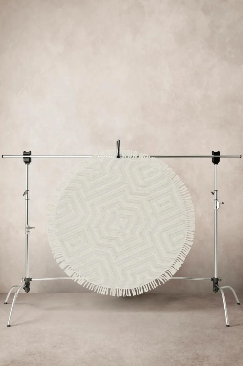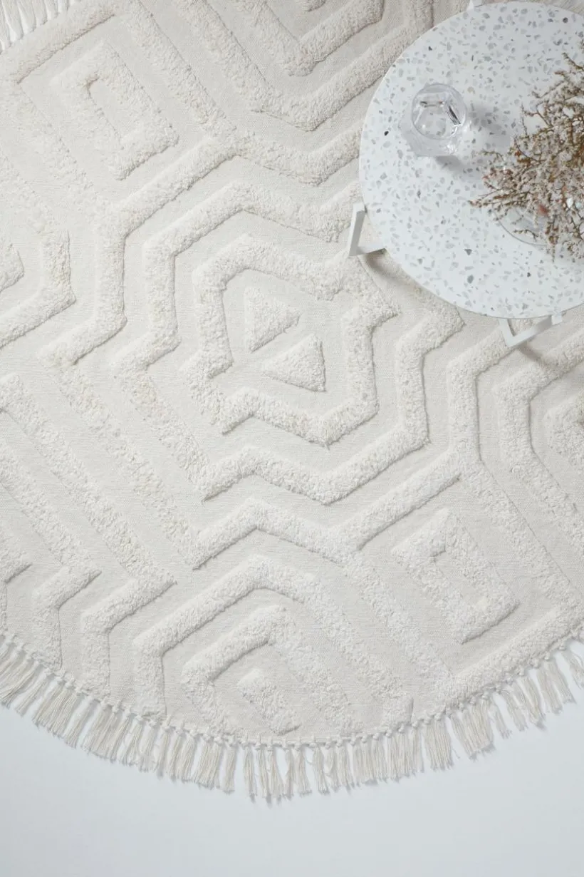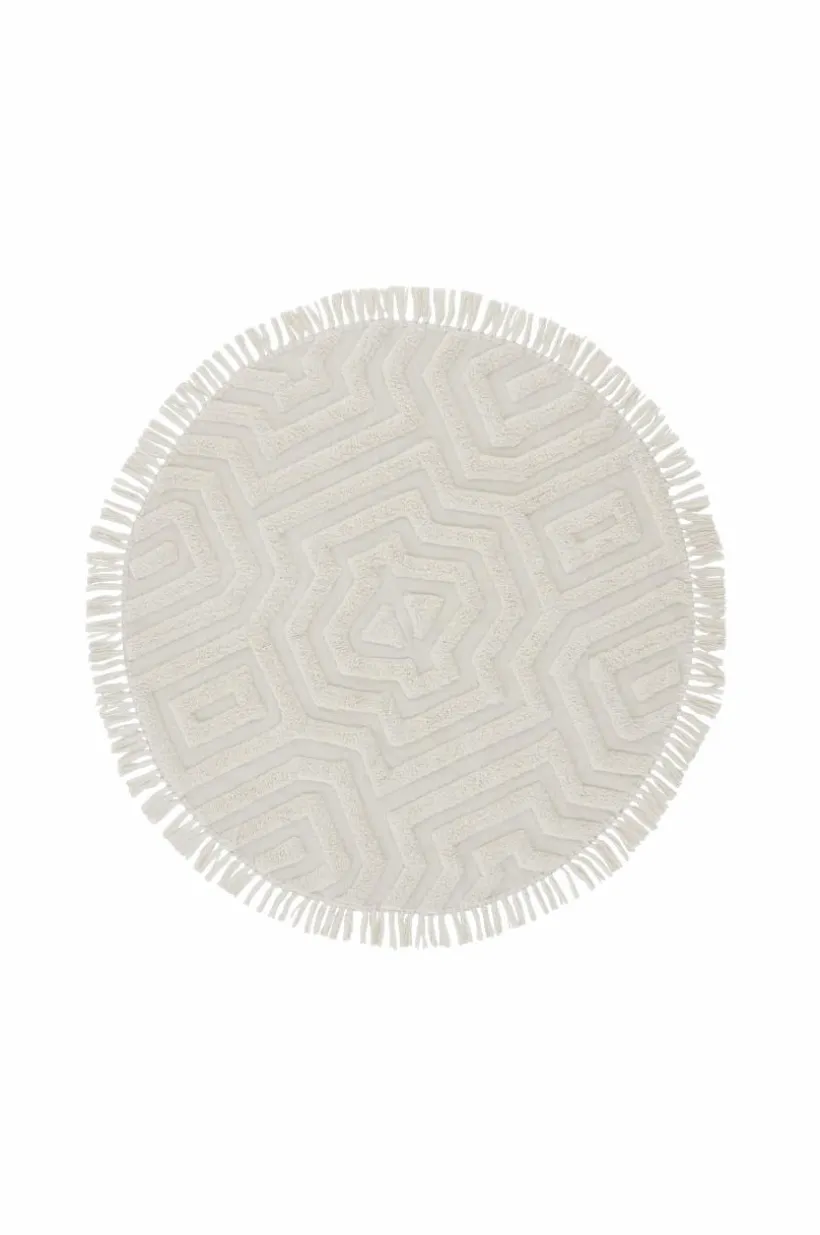 Rund, enfärgad matta av bomull med fransar runt om. FILTON har reliefmönster ton i ton, tuftade partier på vävd botten skapar spännande effekt. Franslängd 9 cm. Tjocklek 1 cm. 1400 g/m².