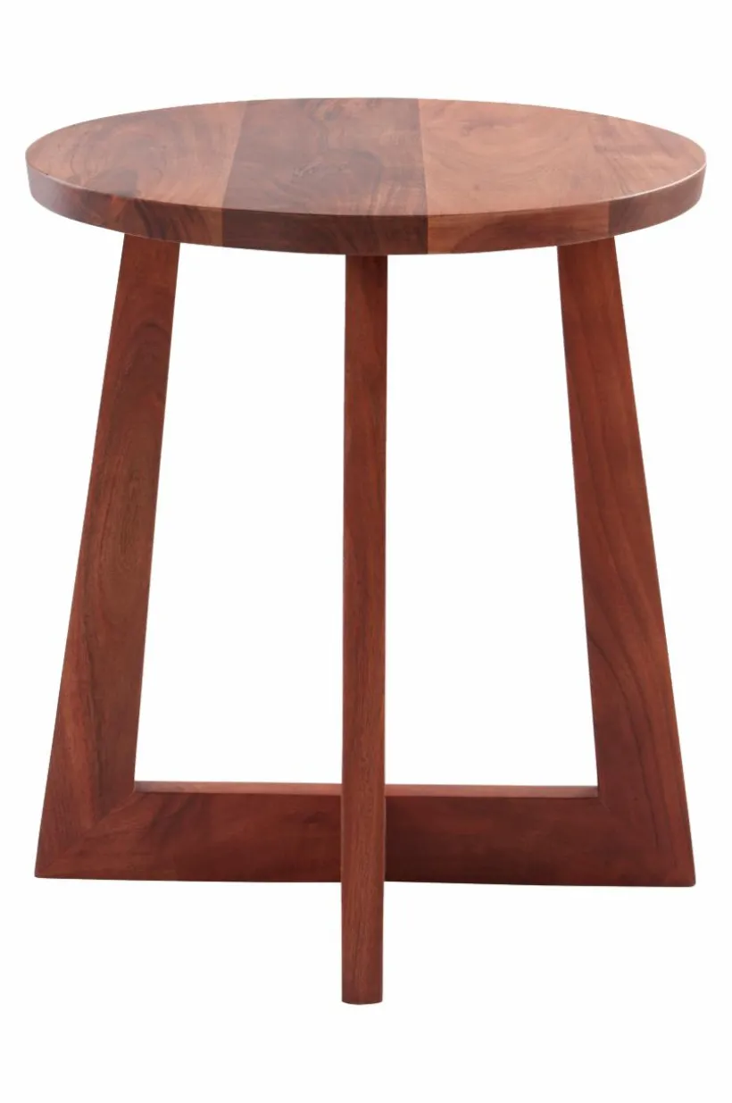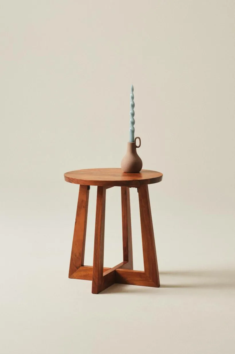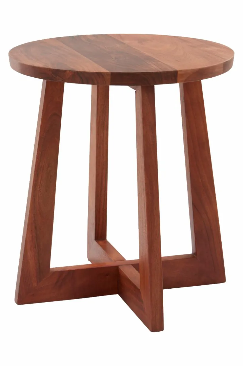 Rustikt sidobord av massivt mangoträ med ytbehandling som ger träet vacker färgton och som gör att den fina ådringen bibehålls. Det runda bordet har fyra ben som skapar ett kryss mot golvet och gör bordet extra stabilt. Bordet passar lika fint vid soffan som bredvid sängen. Viss montering krävs. Monteringsanvisning medföljer.