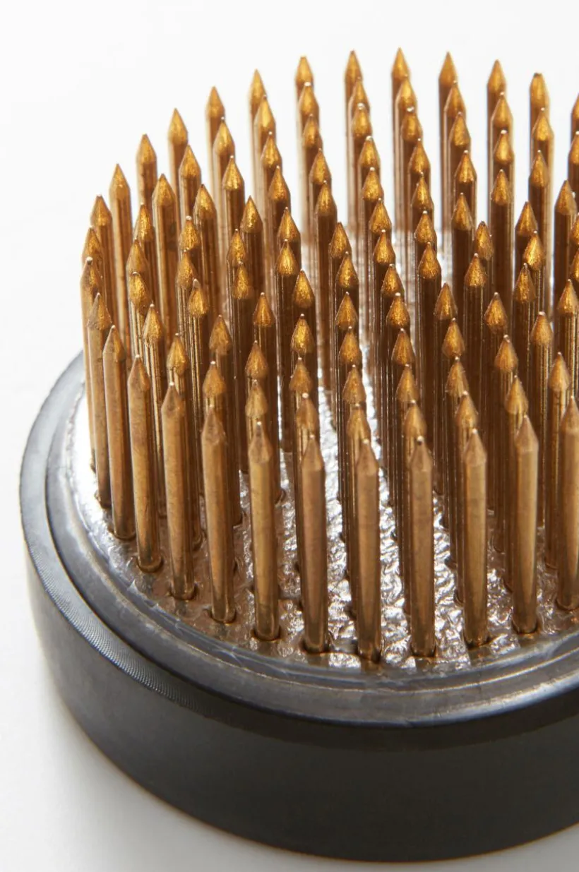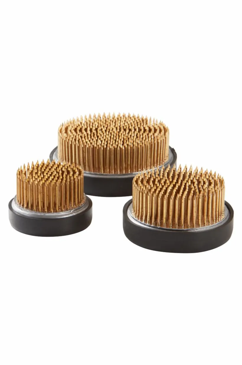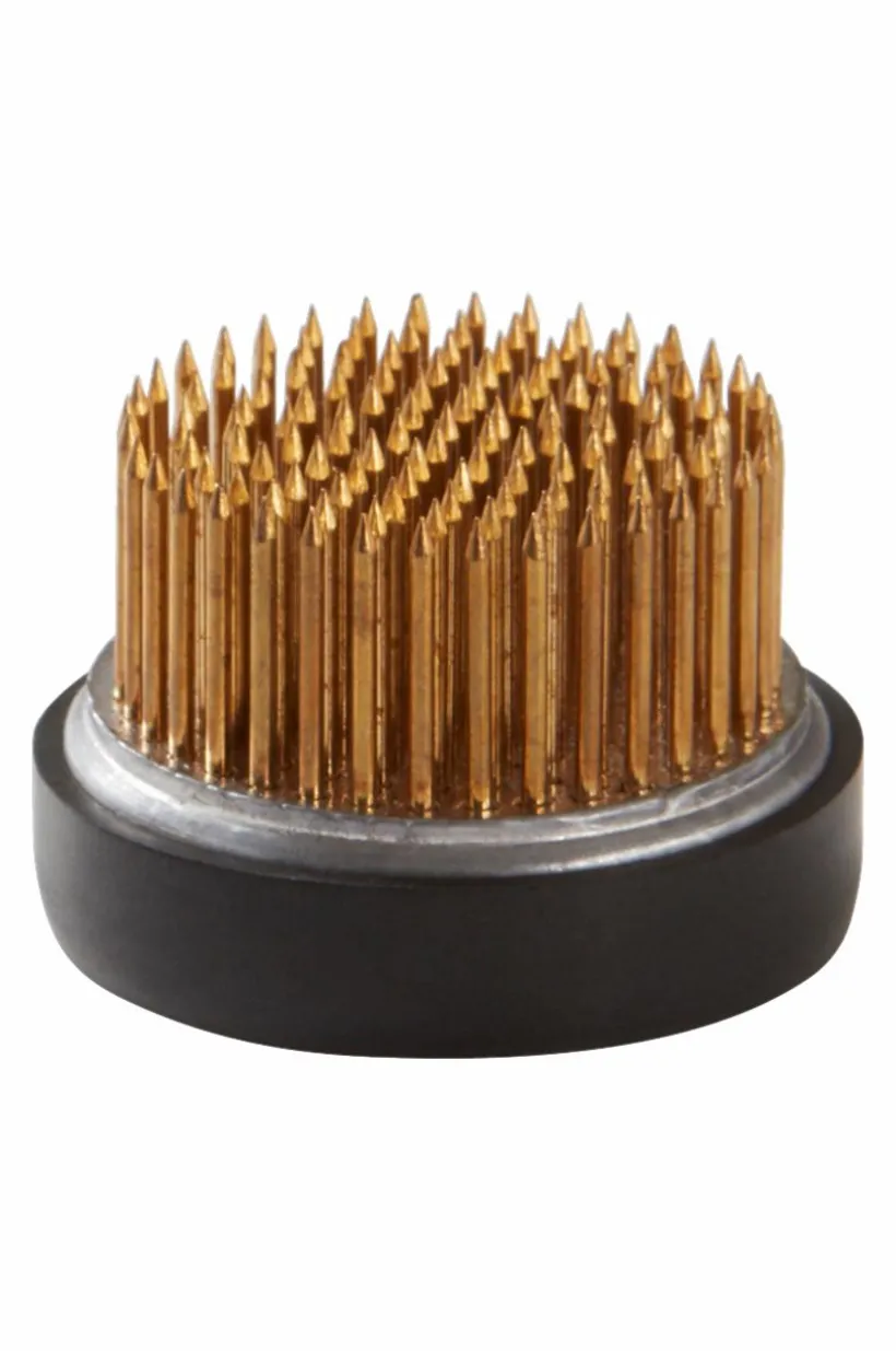 Blomsterfakir med tung metallbotten som har gummisarg och piggar av mässing. Blomsterfakiren är oslagbar när du ska göra fina blomsterarrangemang, med snittblommor eller torkade blommor. Du slipper använda engångsmaterial, FIORE kan du använda om och om igen. Sätt blomsterfakiren i botten av din vas, i en kruka eller på ett fat. Sedan arrangerar du blommorna på de spetsiga piggarna så som du vill ha dem. De färska blommorna vill ju ha vatten men inte de torkade, FIORE fungerar både med och utan vatten. OBS. Gummit kan nötas av med tiden.