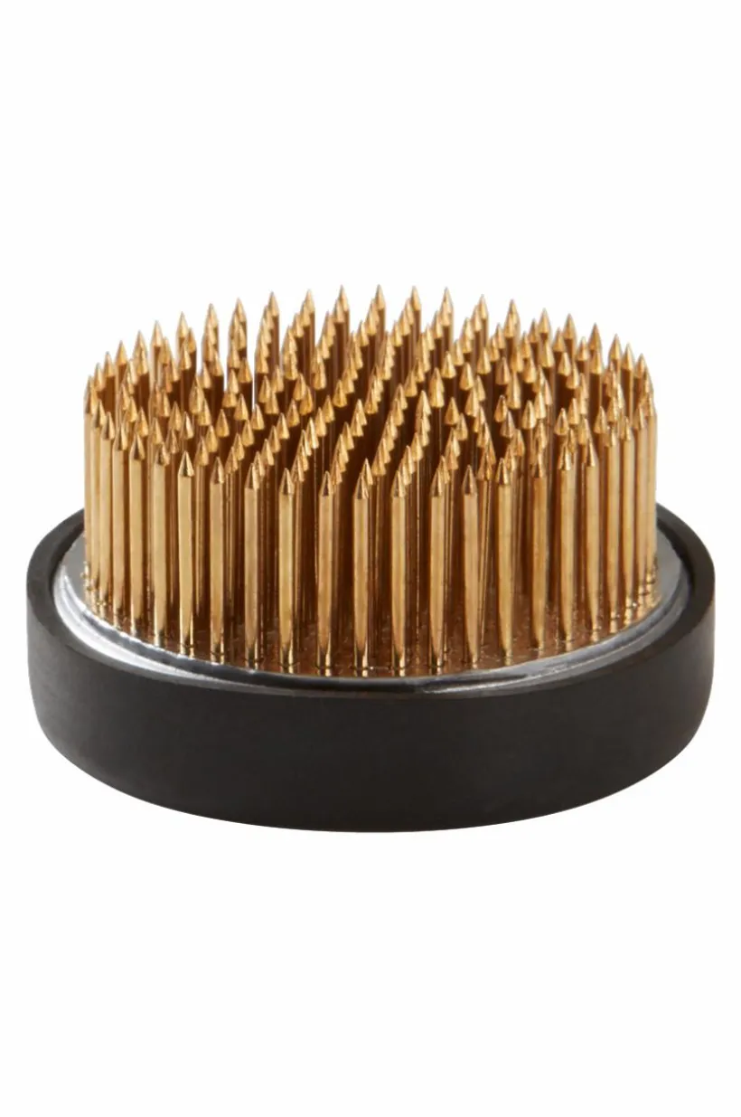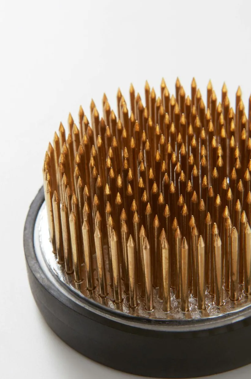 Blomsterfakir med tung metallbotten som har gummisarg och piggar av mässing. Blomsterfakiren är oslagbar när du ska göra fina blomsterarrangemang, med snittblommor eller torkade blommor. Du slipper använda engångsmaterial, FIORE kan du använda om och om igen. Sätt blomsterfakiren i botten av din vas, i en kruka eller på ett fat. Sedan arrangerar du blommorna på de spetsiga piggarna så som du vill ha dem. De färska blommorna vill ju ha vatten men inte de torkade, FIORE fungerar både med och utan vatten. OBS. Gummit kan nötas av med tiden.