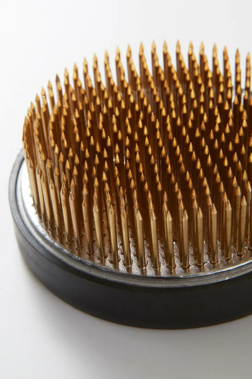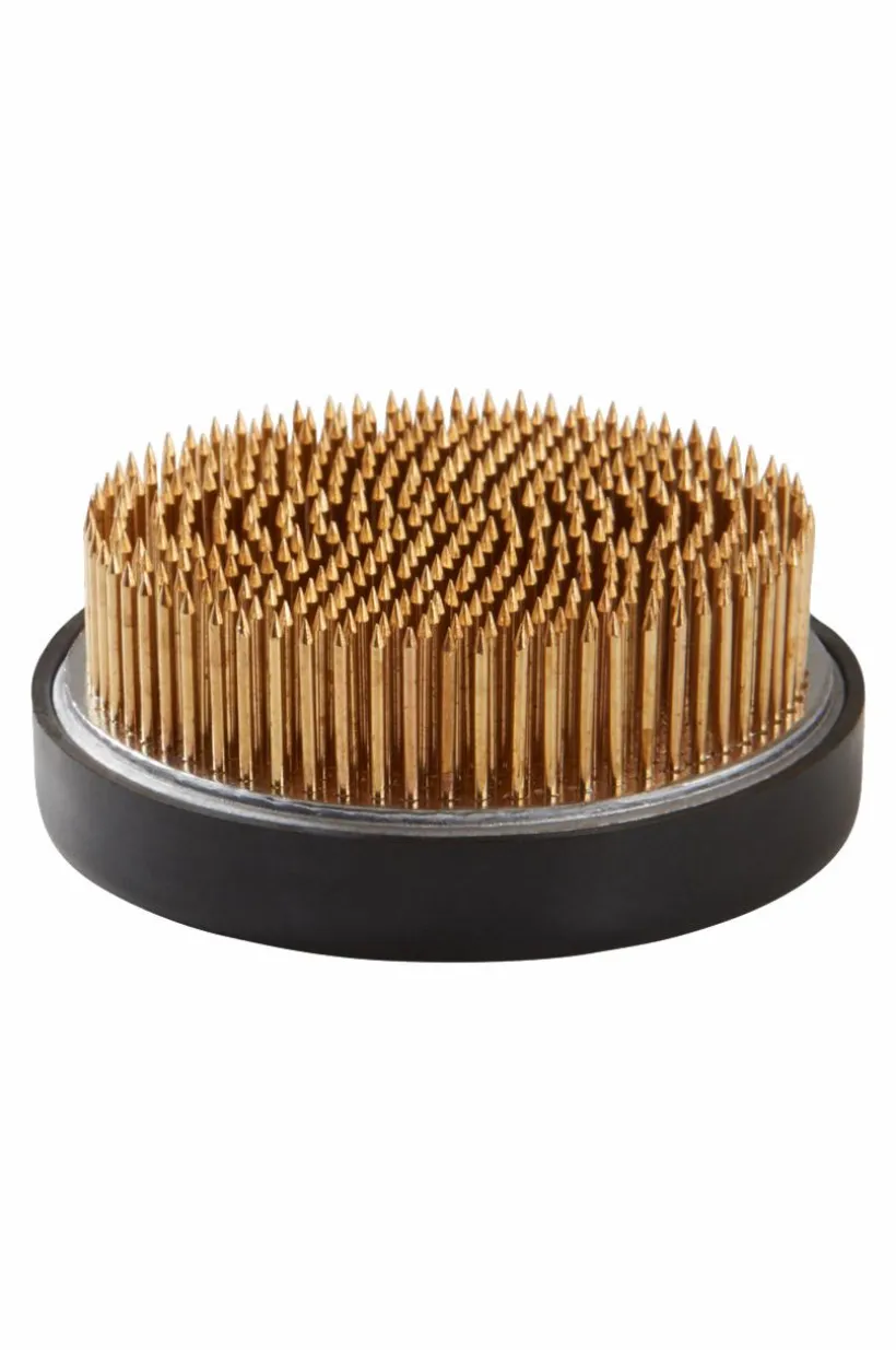 Blomsterfakir med tung metallbotten som har gummisarg och piggar av mässing. Blomsterfakiren är oslagbar när du ska göra fina blomsterarrangemang, med snittblommor eller torkade blommor. Du slipper använda engångsmaterial, FIORE kan du använda om och om igen. Sätt blomsterfakiren i botten av din vas, i en kruka eller på ett fat. Sedan arrangerar du blommorna på de spetsiga piggarna så som du vill ha dem. De färska blommorna vill ju ha vatten men inte de torkade, FIORE fungerar både med och utan vatten. OBS. Gummit kan nötas av med tiden.