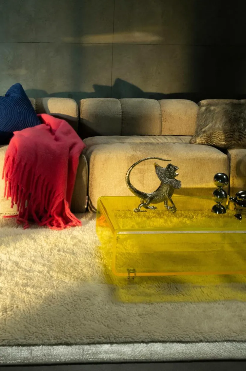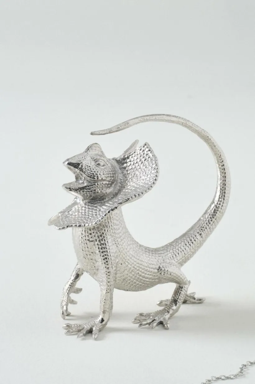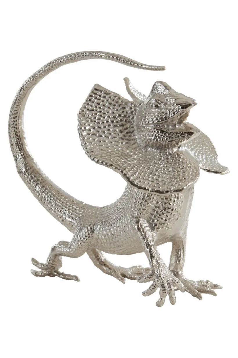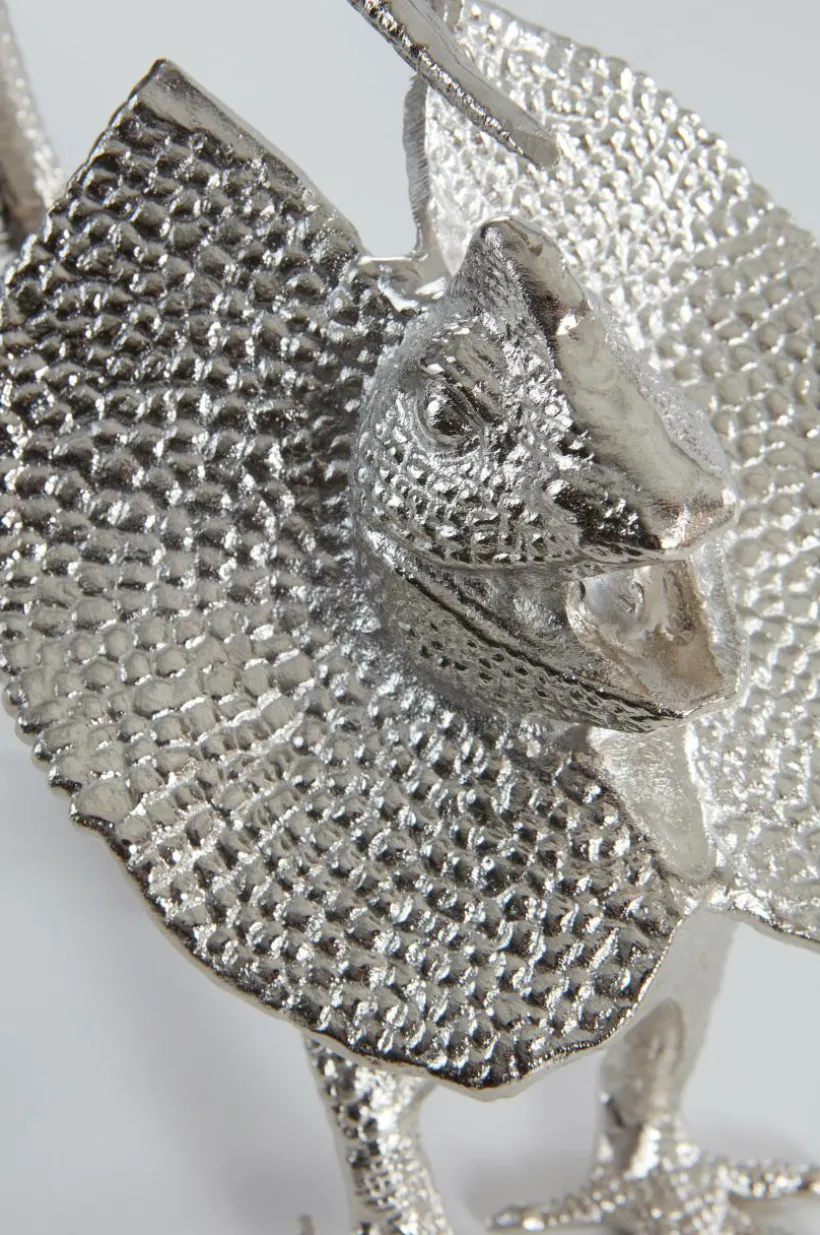 Drake av aluminium i glänsande, reptilmönstrad silverfärg. Draken är stor och dekorativ, en läcker pjäs.