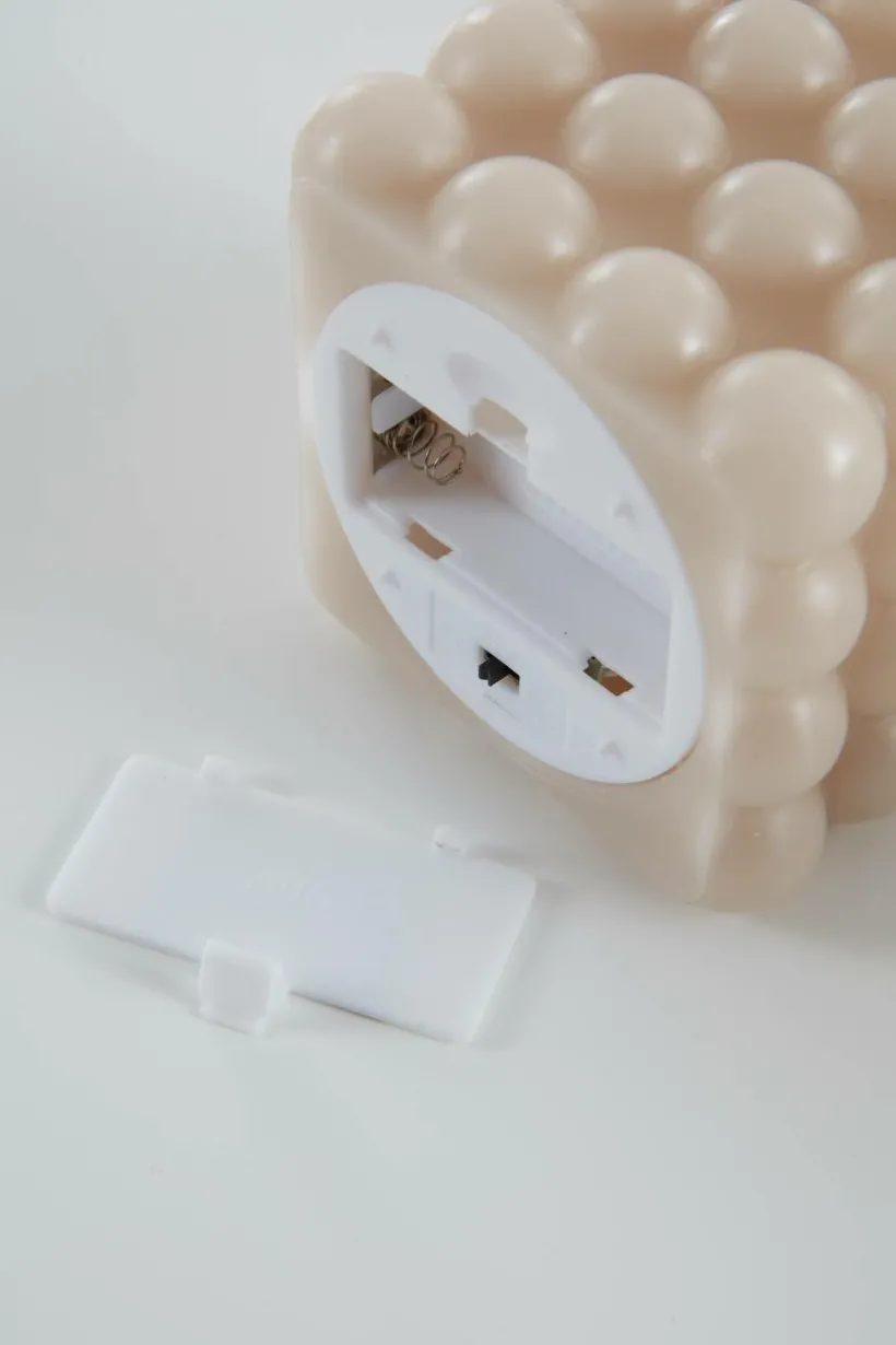 Ljus av vaxliknande plast, uppbyggt av runda klot till en fyrkant. Ljuset är batteridrivet och har LED-belysning, så det är helt brandsäker. Den naturtrogna lågan är av plast och har ett varmvitt sken. Timerfunktion gör det enkelt att ställa in när det ska lysa, intervallet är 6 timmar på och 18 timmar av, repeterande. För inomhusbruk.