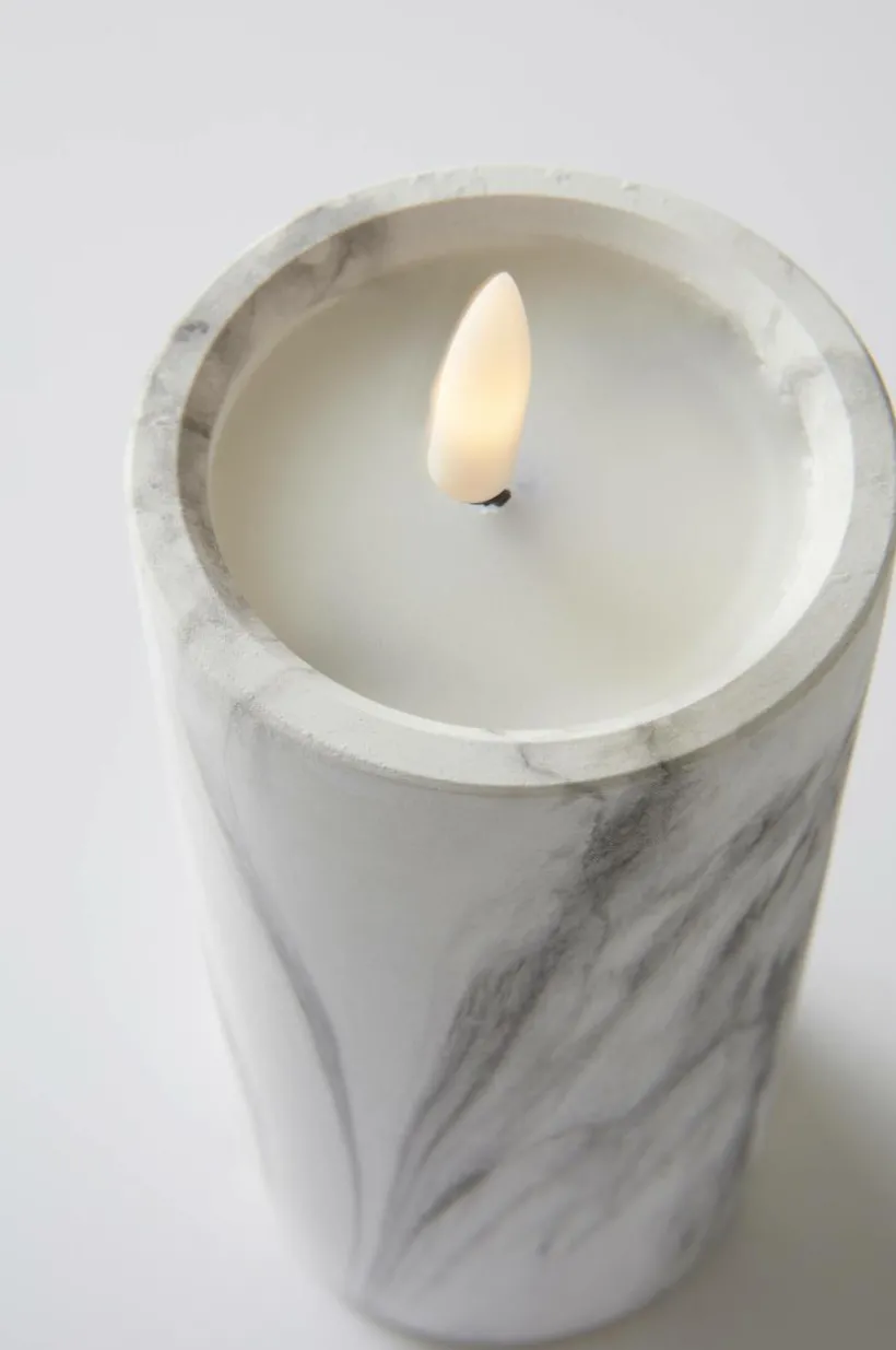 Ljus av betong med naturtroget marmormönster. Ljuset är batteridrivet och har LED-belysning, så det är helt brandsäker. Den naturtrogna lågan har ett varmvitt sken. Timerfunktion gör det enkelt att ställa in när det ska lysa, intervallet är 6 timmar på och 18 timmar av, repeterande. Batterifack och låga är av plast. För inomhusbruk.