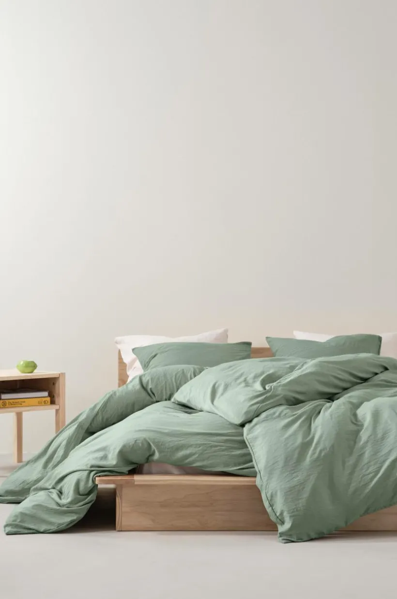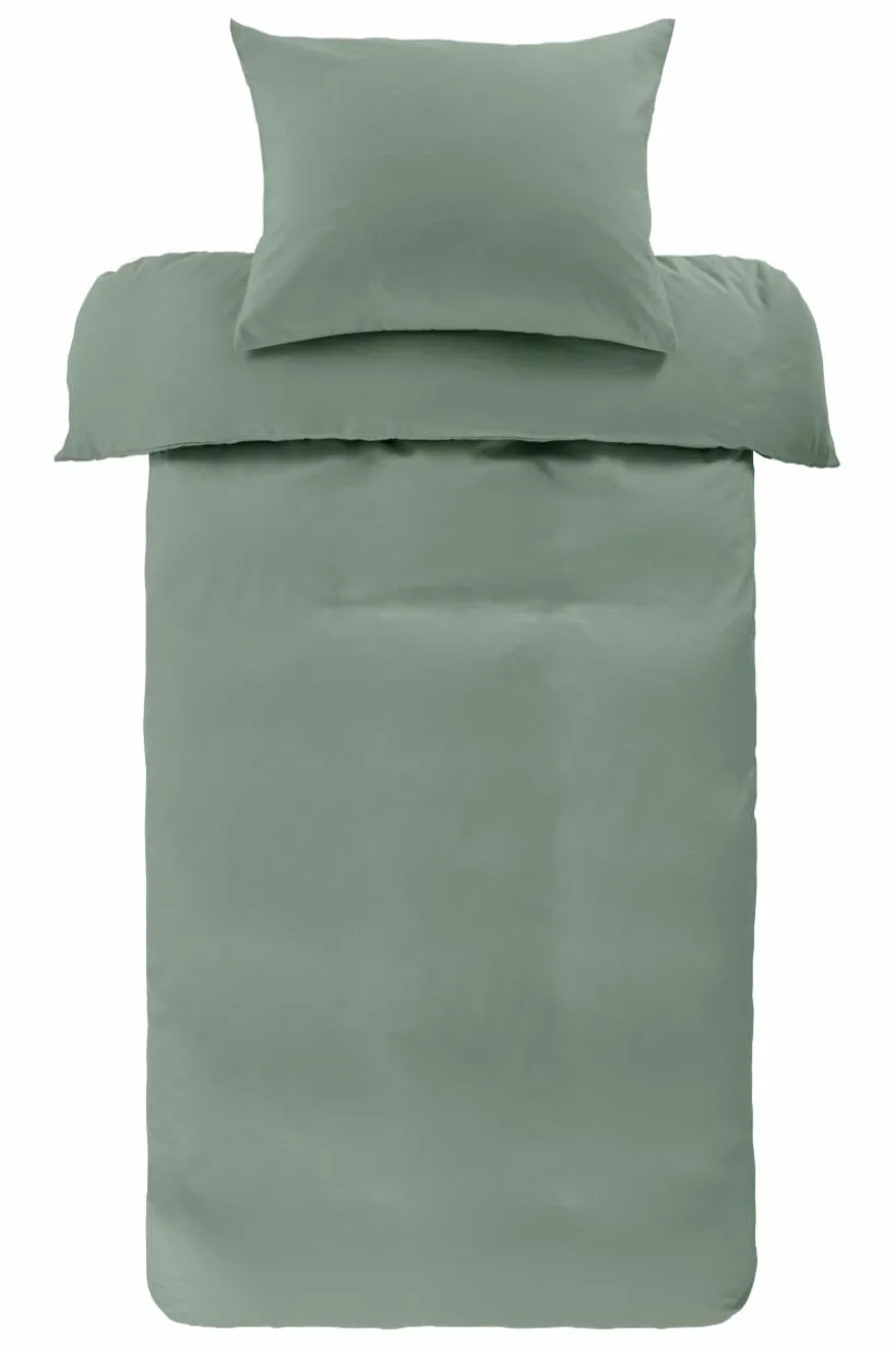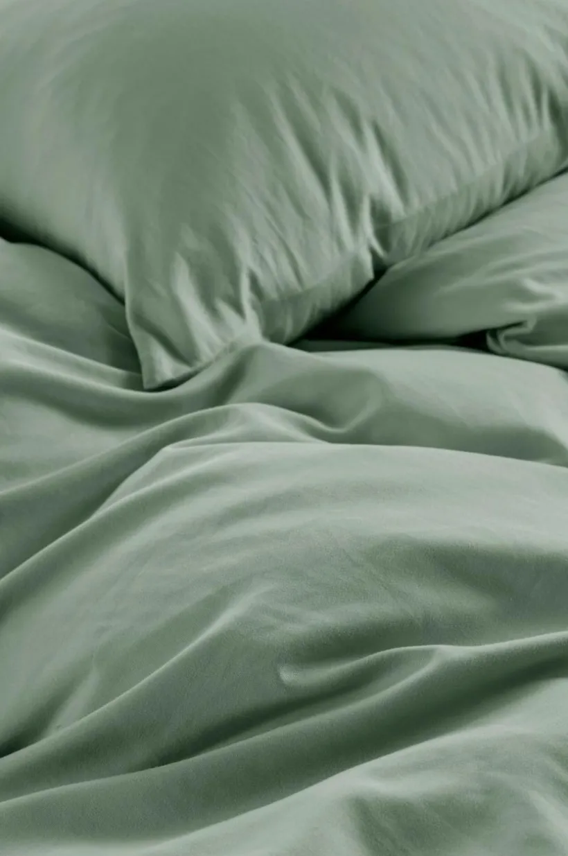 Påslakanset i två delar, ett påslakan och ett örngott, i supermjuk, tvättad kvalité. Tyget är en mikrofiber av polyester som är lätt och snabbtorkande. Öppning i övre hörnen på påslakanet, som underlättar att trä påslakanet över täcket. Tygets gramvikt 90 g/m².