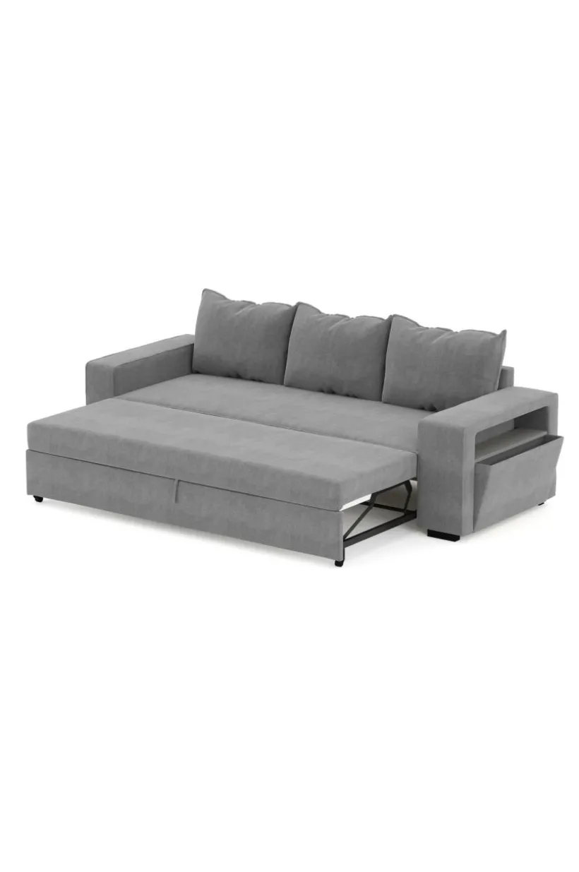 Storlek: Höjd 89 cm, bredd 239 cm, djup 86 cm, sitthöjd 42,5 cm, sittdjup 57 cm, benens höjd 4,5 cm. Bäddmått 192×131 cm.