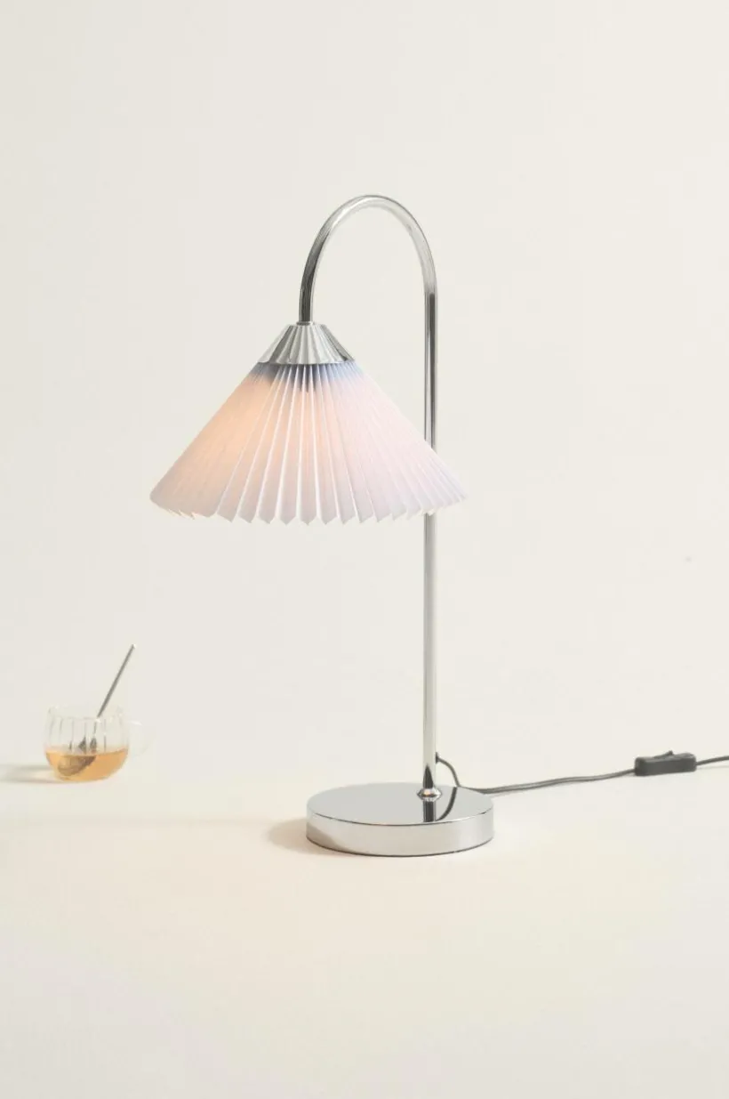 Bordslampa FLORENCE har kromad, stilren metallfot som matchas fint av en veckad textilskärm. Böjningen upptill på foten ger lampan en mjukare känsla som står i snygg kontrast till kromfärgen. Skärmen har diskret metallstomme och kromad topp. Svart sladd med strömbrytare på sladden.