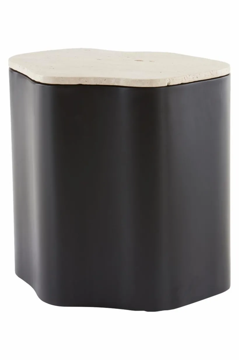 FOSSI är ett oregelbundet och mjukt format sidobord med bordsskiva av kalksten och underrede av järn. Bordsskivan är av Travertin och det är en naturlig stenskiva där små håligheter kan uppstå, den är vackert marmorerad i färgen. Det svarta underredet är ihåligt och har tack vare det låg vikt.