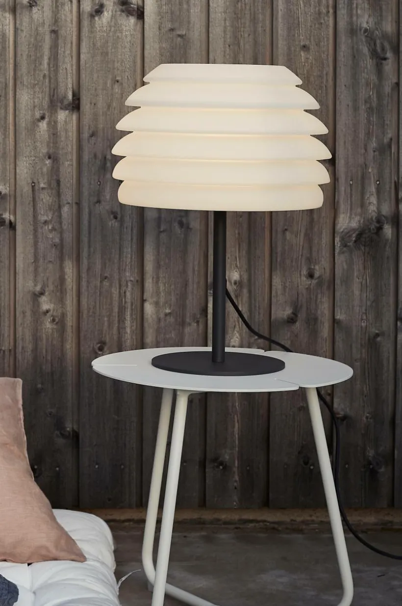 Bordslampa med stativ av metall och veckad skärm av plast. Lampan är avsedd att användas på uteplatsen, altanen eller balkongen. Förändra ljusskenet genom att prova olika typer av ljuskällor.