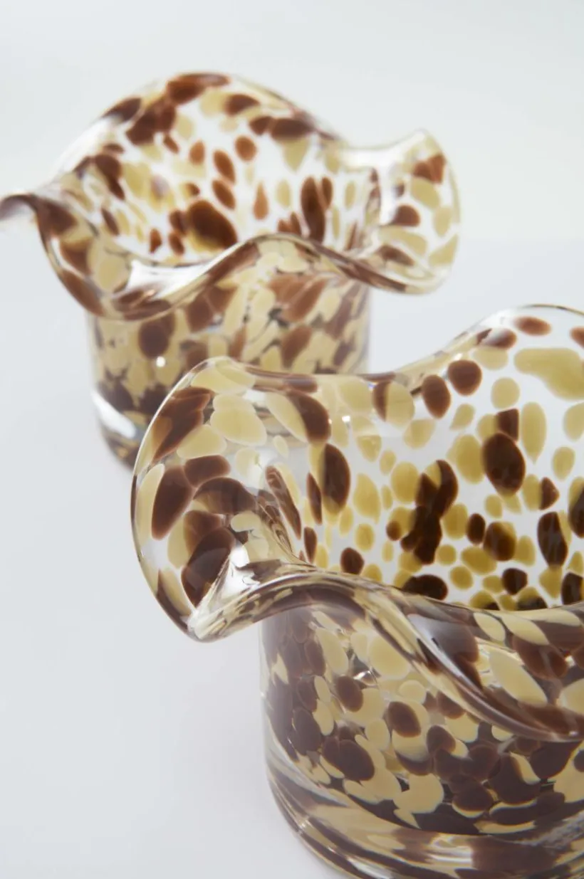FREESIA är en vacker ljusstake i klarglas med ett oregelbundet stänkmönster. Designen för tankarna till en blomma. Varje handgjort föremål är unikt med olika mönsterdesign.