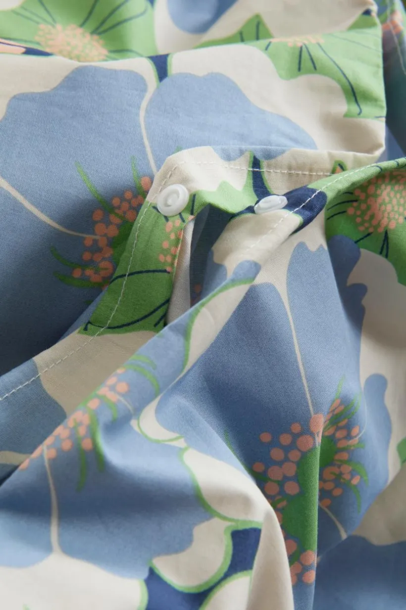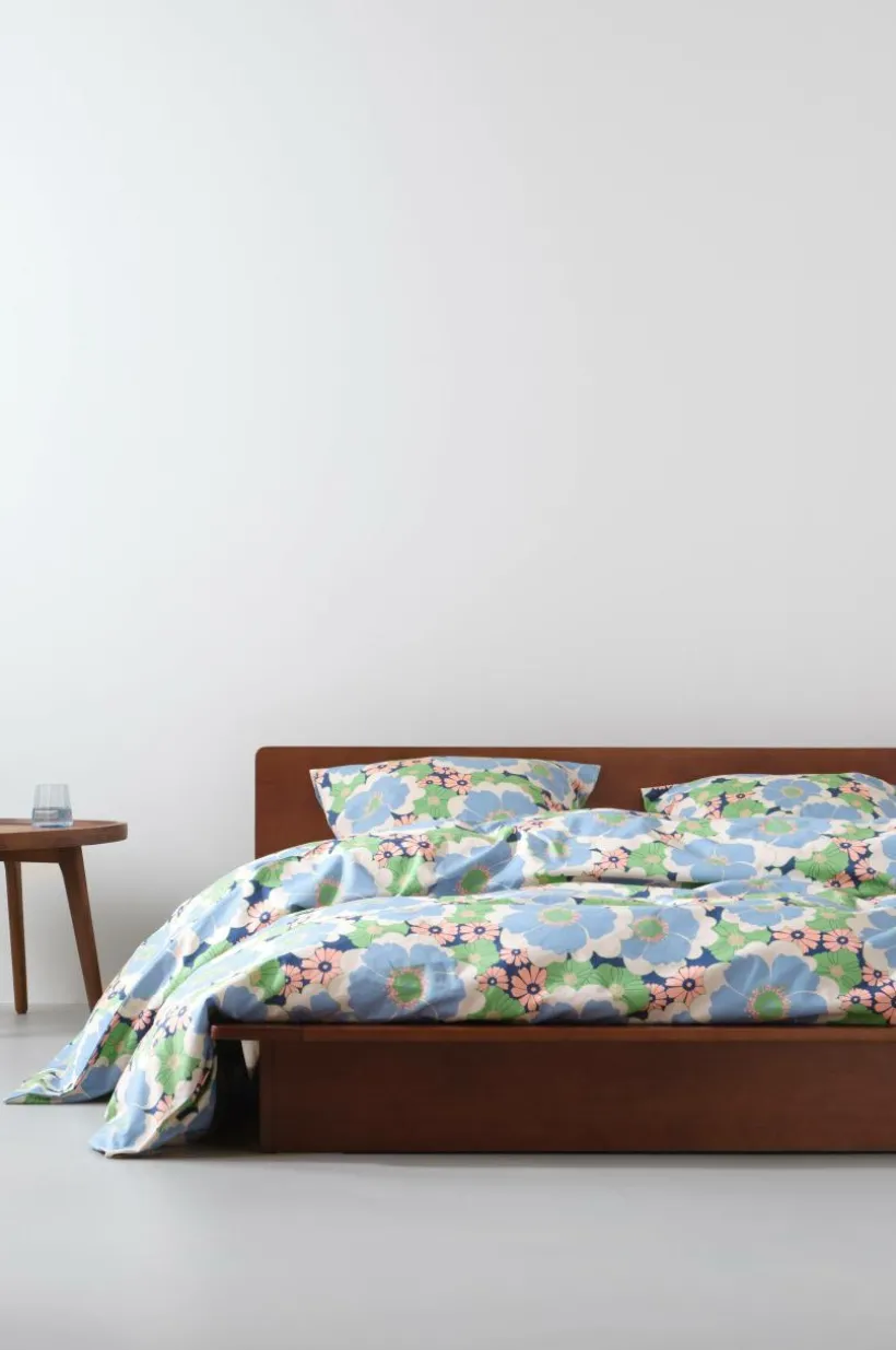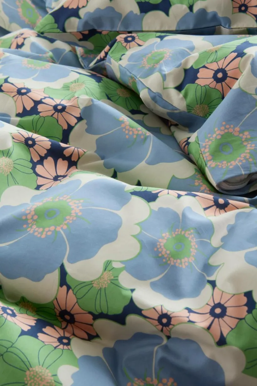 Påslakansetet FRIDA charmar med ett retromönster, reaktivt tryckt på ekologisk bomullspercale. Mönstret är designat av Maria Carlberg. Innehåller ett påslakan och två örngott, med dolda tryckknappar och flikstängning för enkel användning. Njut av tidlös design och komfort i ditt sovrum.