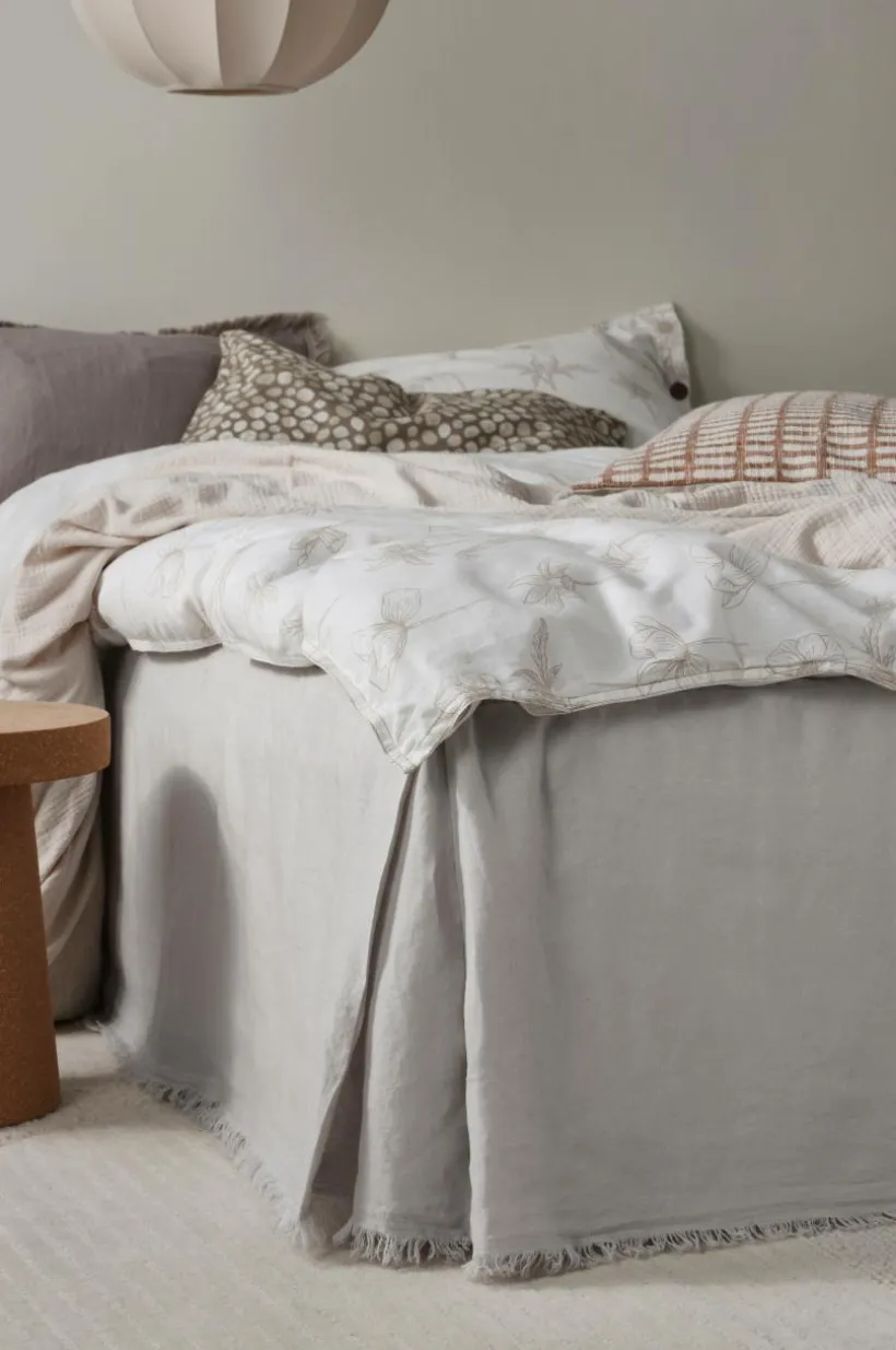 Sängkappa av tvättad lin med rå franskant nertill och platta (ovansida) av bomull. Lin är ett fint naturmaterial med speciella egenskaper och härlig känsla. FRINNY är lika snyggt som mjukt och skönt, det enfärgade linneprogrammet är helt tidlöst. När linet tvättas får det ännu mjukare struktur. I serien FRINNY har alla delar råa kanter med liten frans.