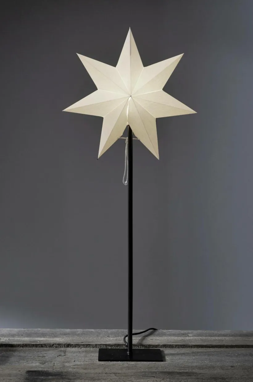 Stjärna på fot med svart textilkabel. Elegant stjärna att dekorera med i hemmet. Stjärnan har plats för en ljuskälla. Ljuskällan ingår ej. E14 sockel. Djup:15cm, höjd:85cm, bredd:35cm.