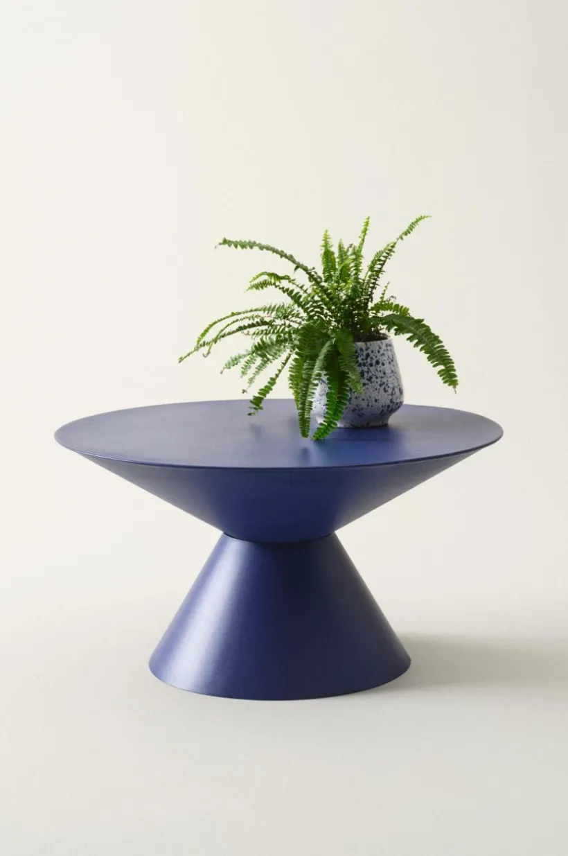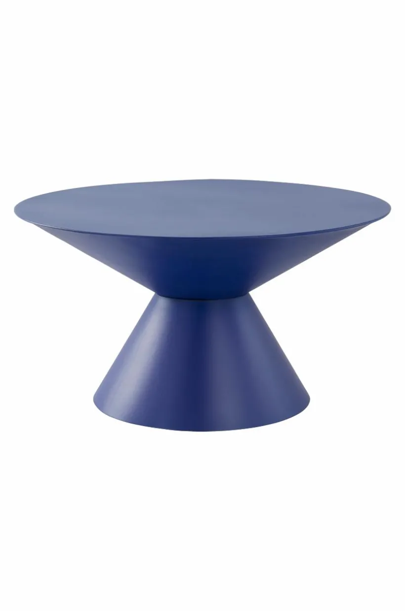 Runt soffbord av järn i uppiggande form som sticker ut. Bordet består av två koner som möts på en avsmalnande mitt. Den matta ytan är målad och har lätt struktur.