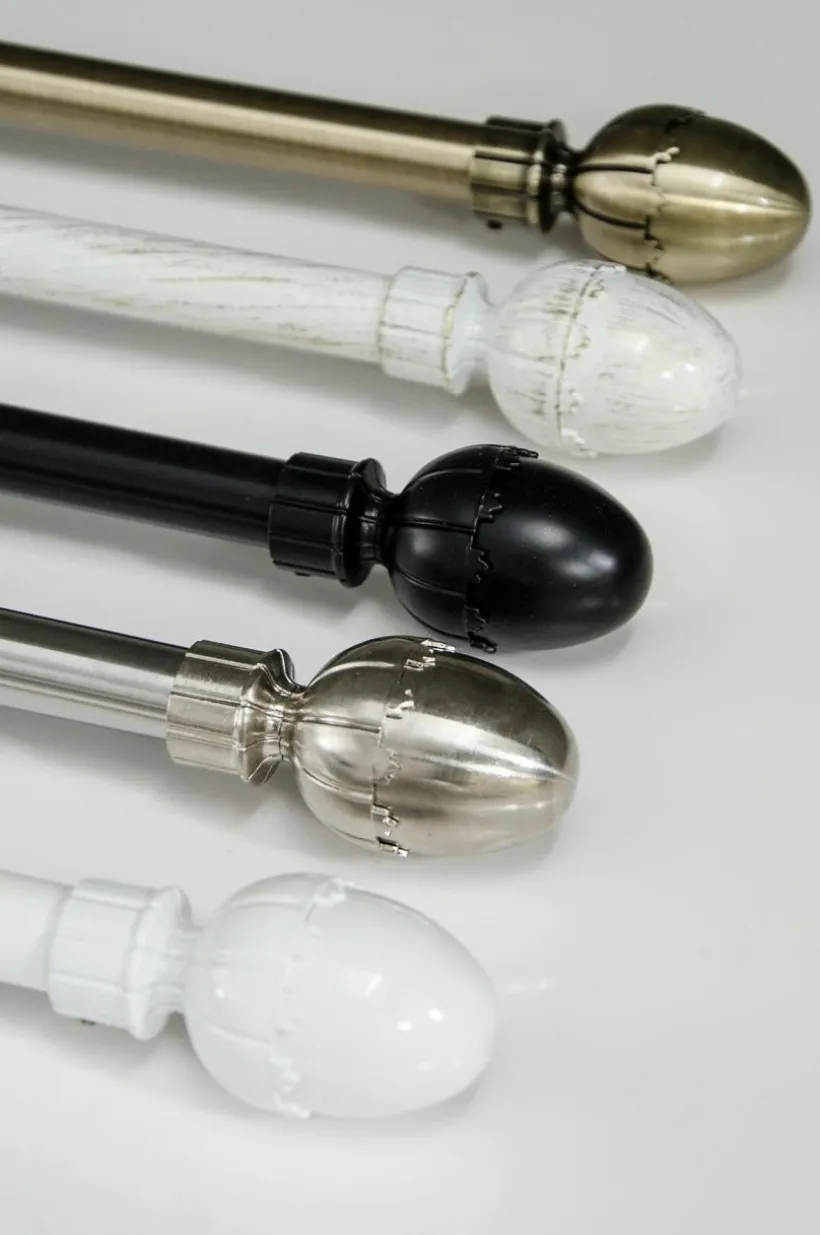 Komplett klassiskt gardinstångset i metall, 16/19 mm. Setet innehåller justerbara stänger 130-240 cm, 2 st ändknoppar och 3 st väggfästen (8 cm).