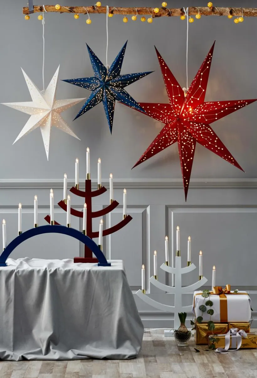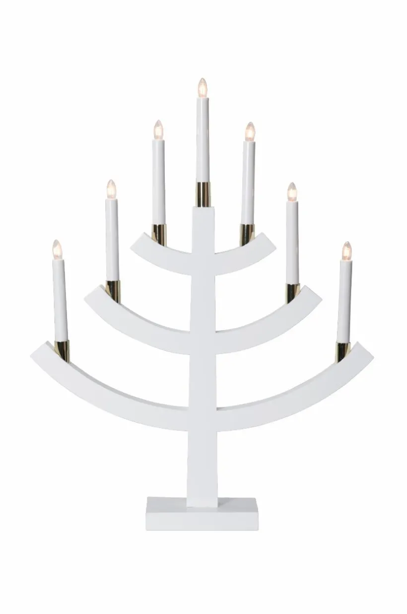 Sjuarmad elljusstake i trä med mässingbelagda ljushållare. Glödlampor medföljer.