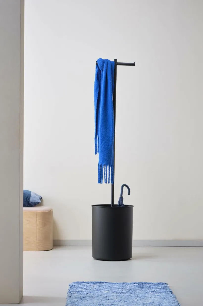 GLAZE är en minimalistisk hallserie för stilren förvaring vid din entré. Paraplystället är tillverkat av järn med svart pulverlackerad yta. Paraplystället förvarar dina paraplyer på ett praktiskt sätt. Den runda förvaringen har indelning i fyra fack så paraplyerna står separerat och torkar lättare. Upptill finns två hängare för väskor eller ytterkläder.