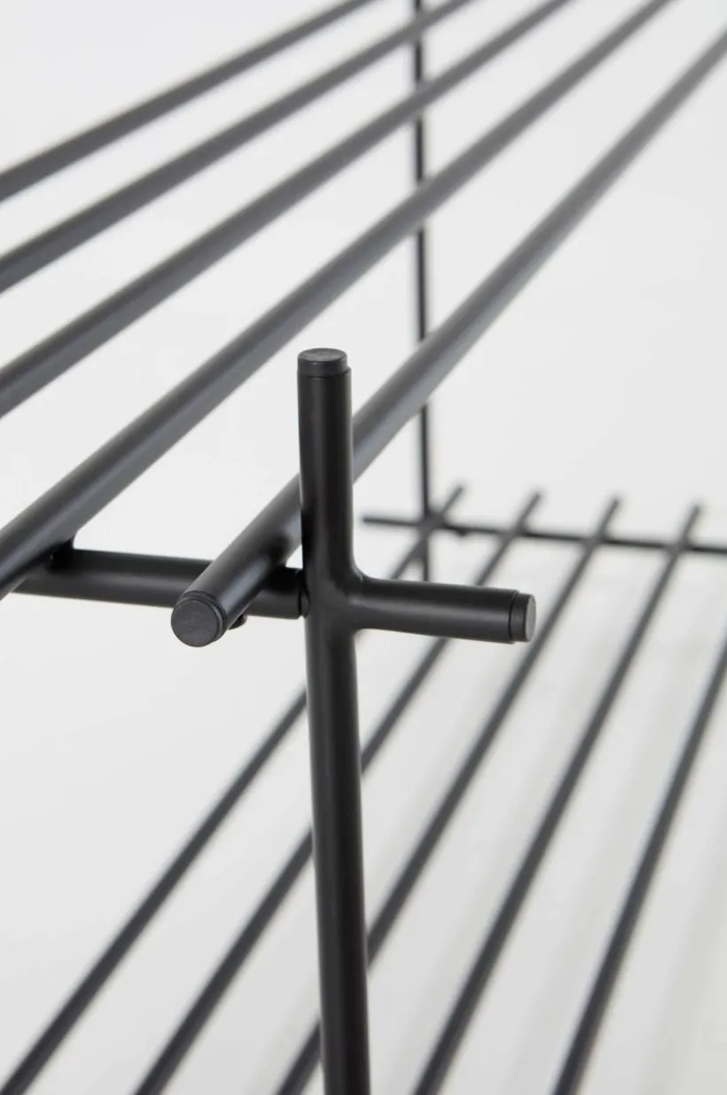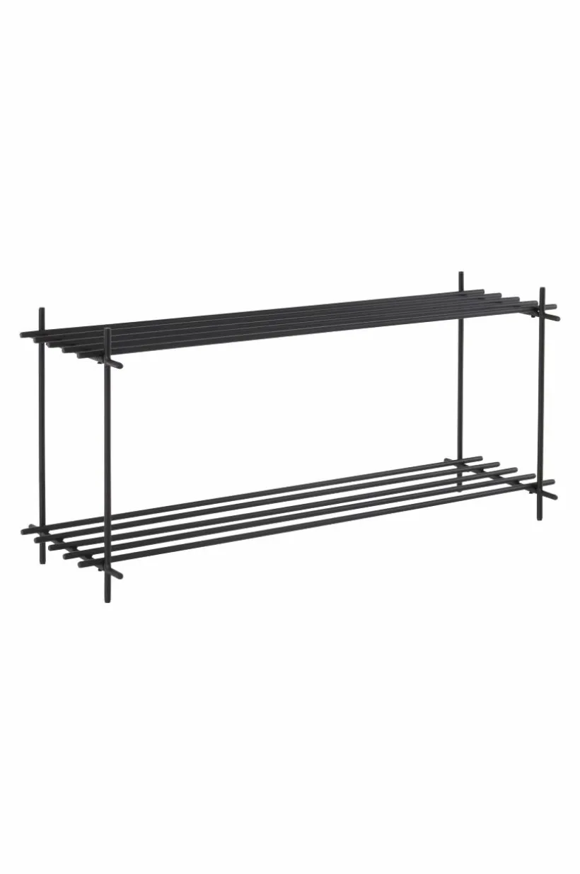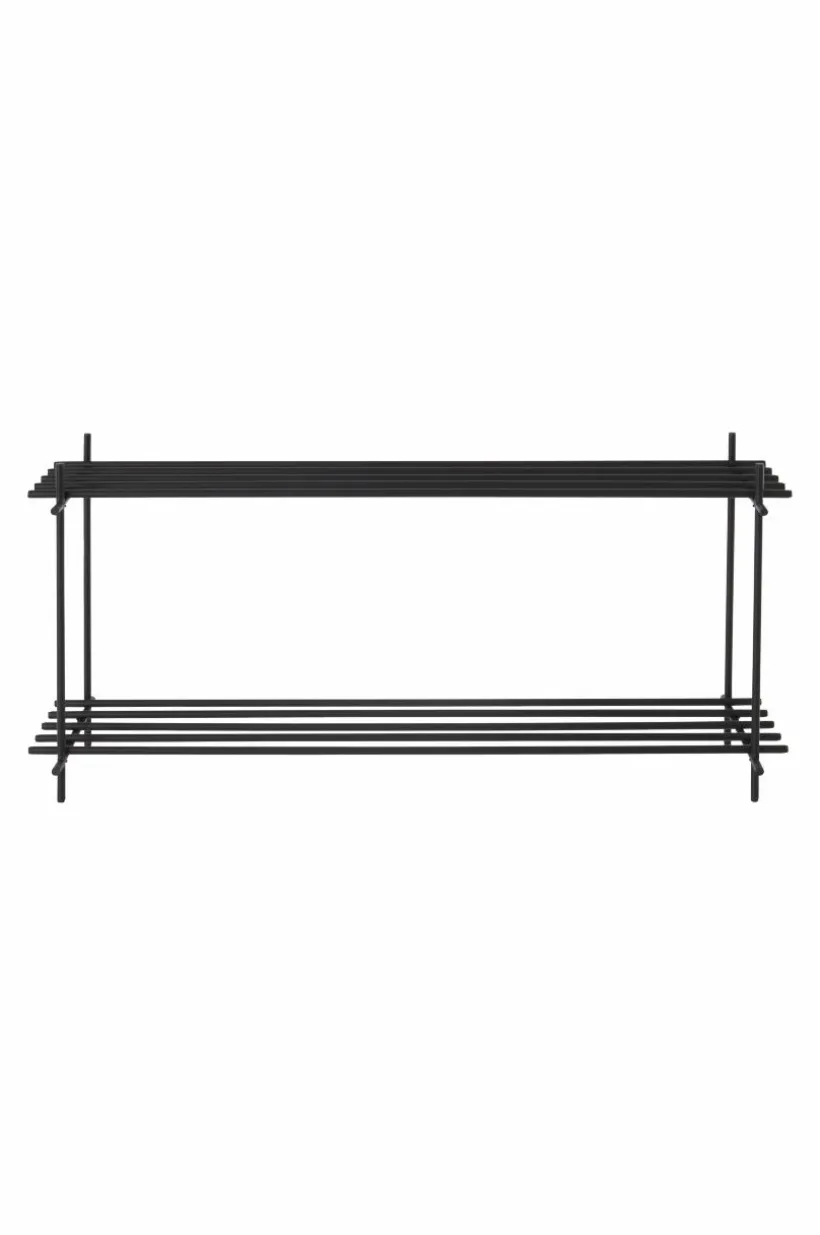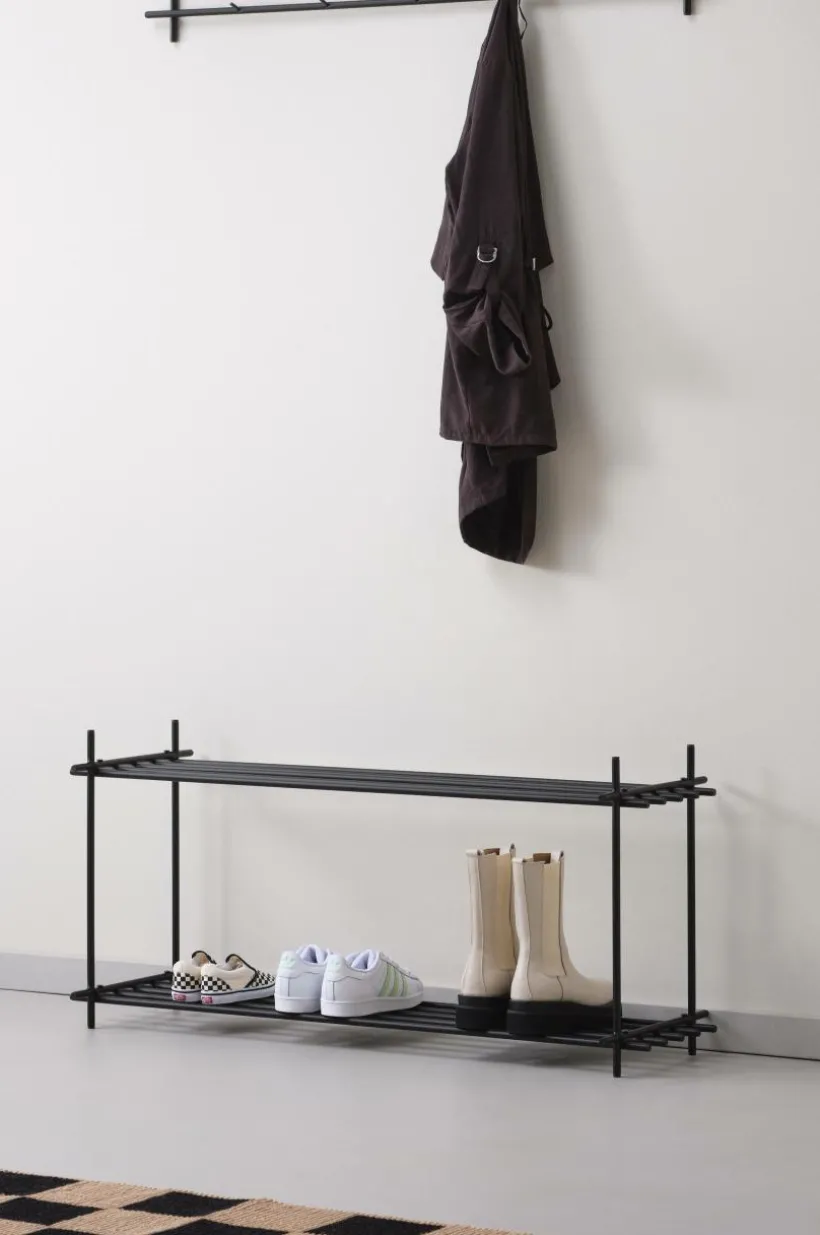 GLAZE är en minimalistisk hallserie för stilren förvaring vid din entré. Skohyllan är tillverkad av järnrör med svart pulverlackerad yta. Skohyllan har två hyllor för skor.