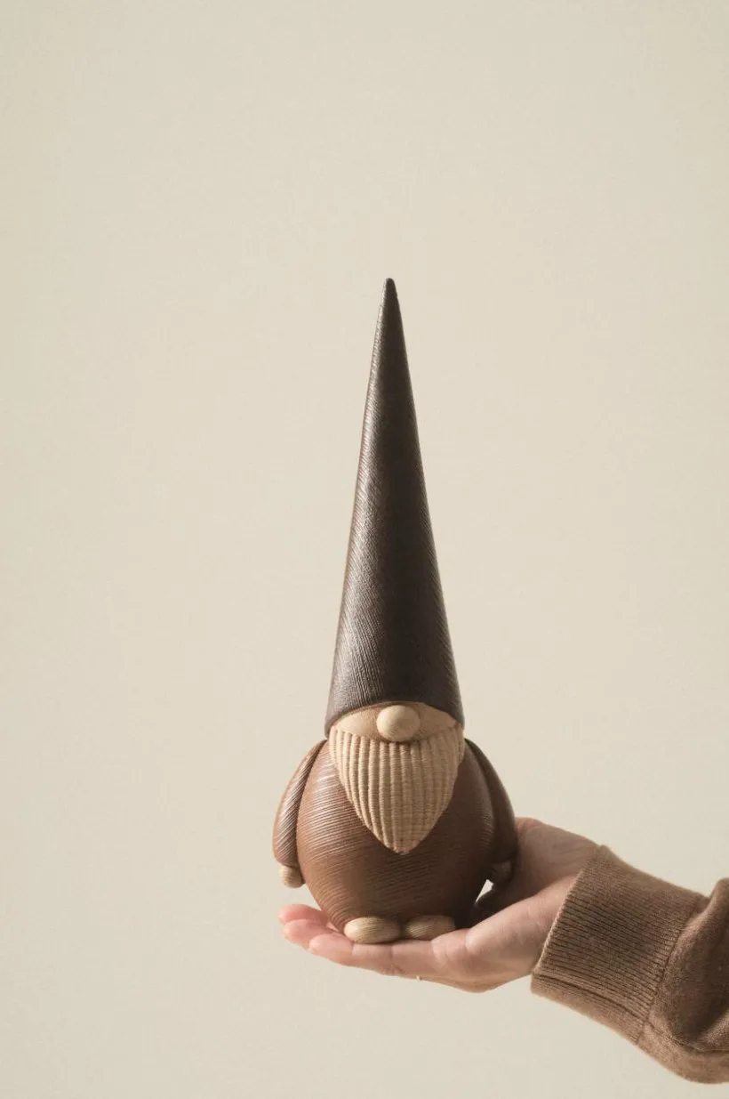 Jultomte av polyresin med trälook. Den söta tomten med hög tomteluva som åkt ner över ögonen skapar mysig julstämning.