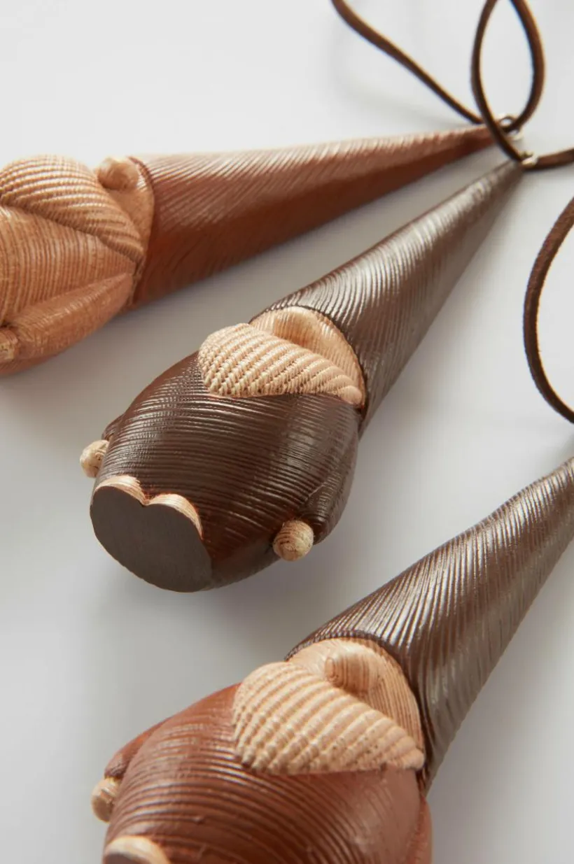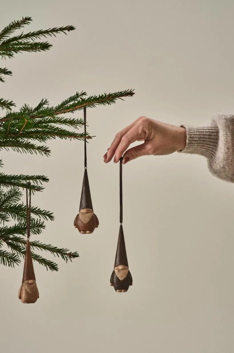 3-pack hängande tomtar av polyresin, som ser ut som trä. Tomtarna är målade i dova, fina färger. Snöre för upphängning i luvans topp.