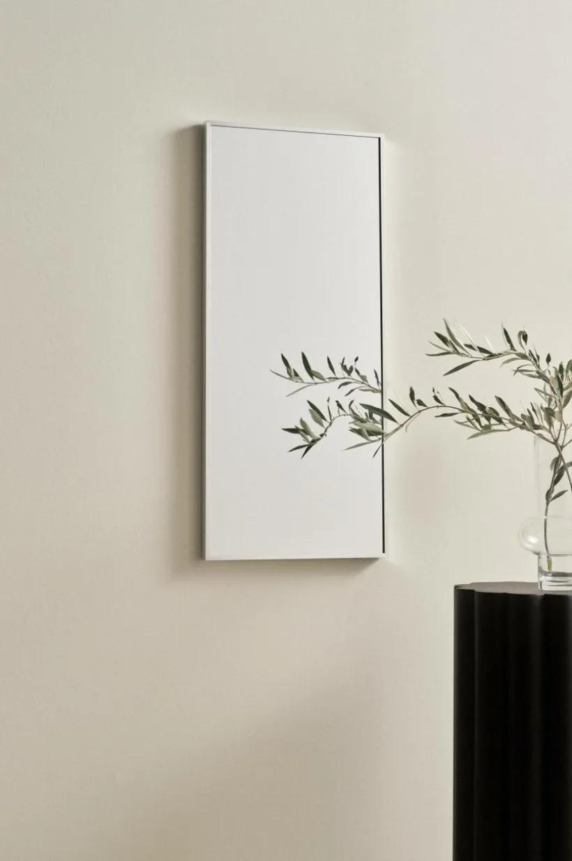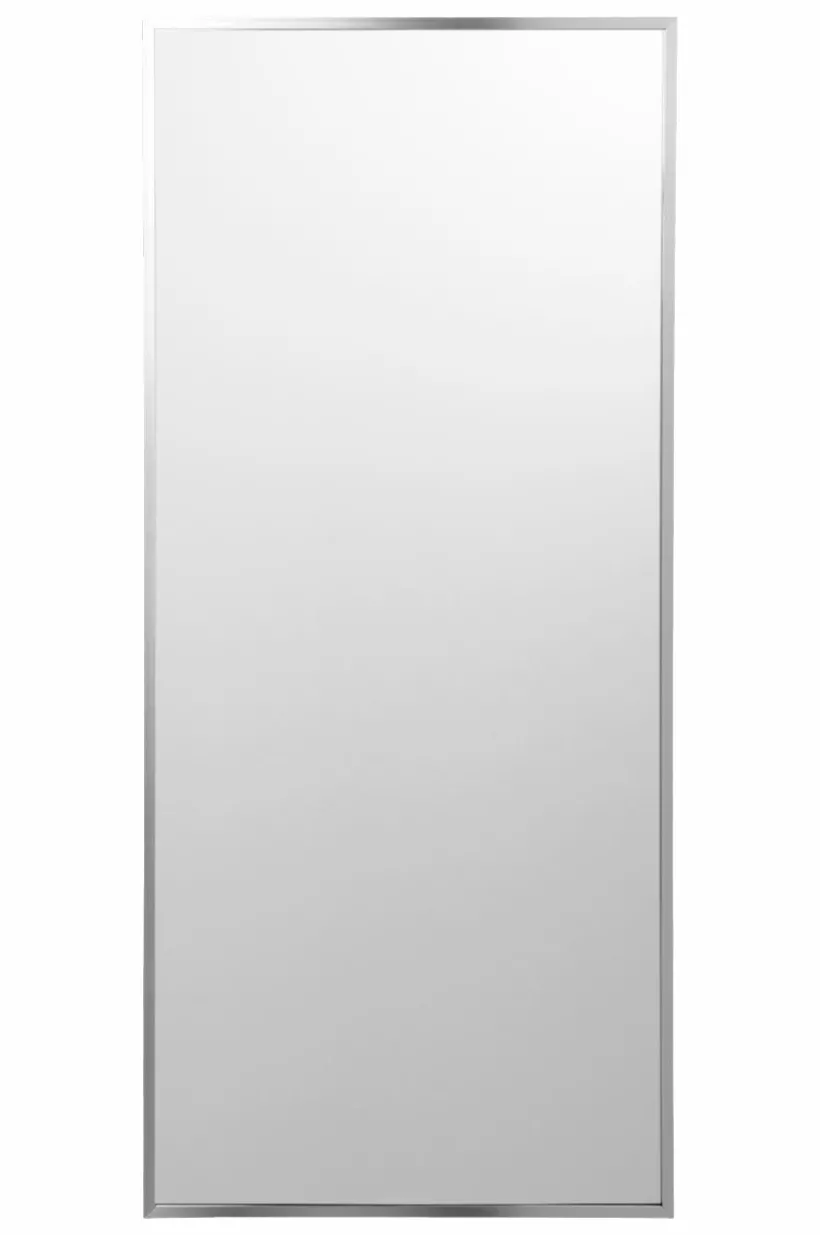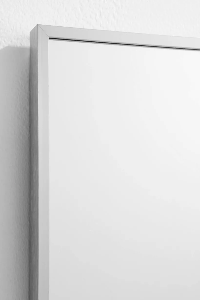 Rektangulär spegel med smäcker aluminiumram. Ramen har dold förstärkning av MDF. Tre dolda hängare på baksidan, så spegeln kan hängas både vågrät och lodrät.