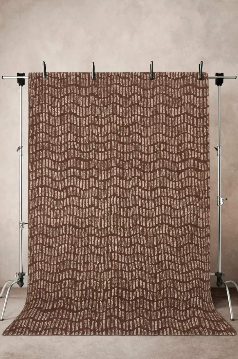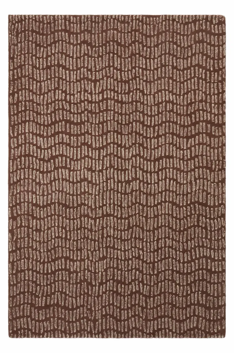 Handtuftad ullmatta med effektfullt mönster som skapas av olika vävteknik och färg på garnet. Den mörkare grundfärgen är kort, klippt, tät lugg medan de ljusa dekorränderna är lugg i öglor som skapar mönstret. Ull ger en naturligt varm och praktiskt smutsavvisande matta. Lugghöjd 1-1,1 cm. Tjocklek 1,2-1,4 cm. 3800-4000 g/m².