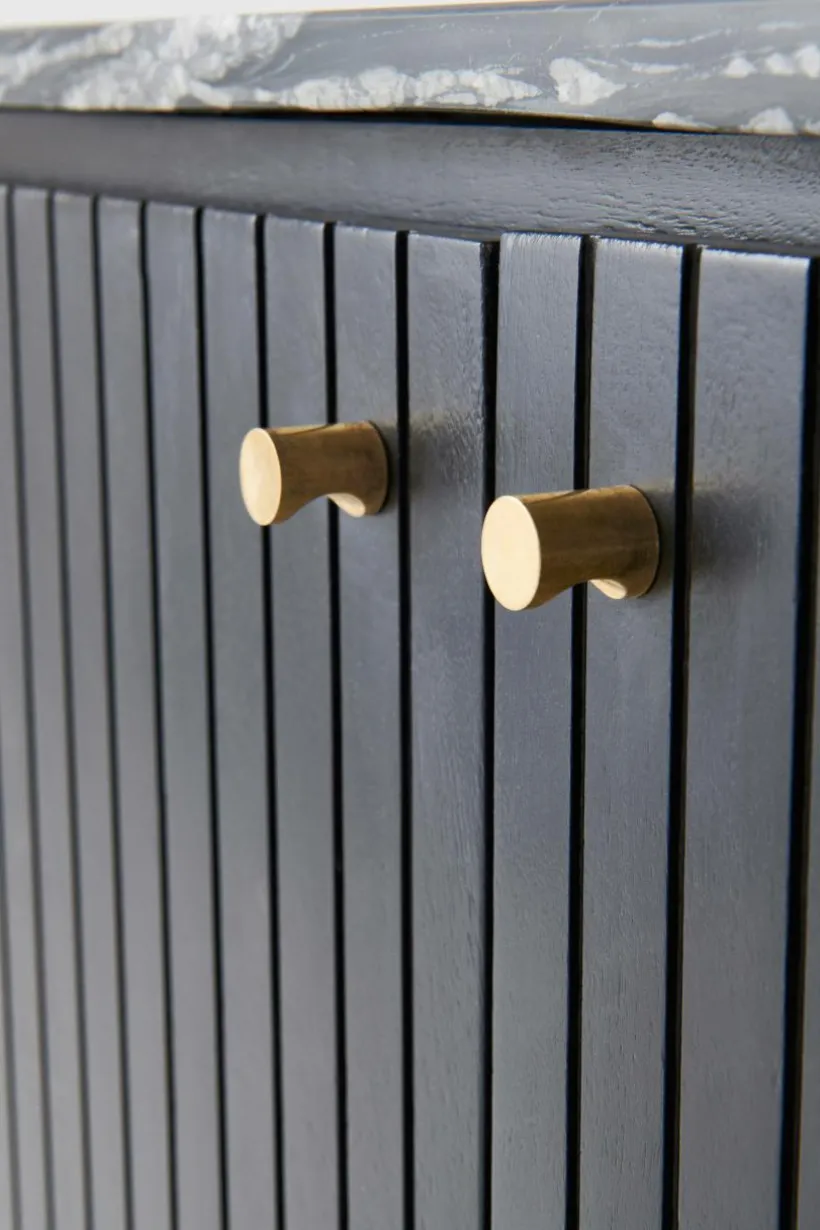 Sideboard av metall med bordsskiva av mörk marmor. Bordet har två praktiska skåpdörrar av acaciaträ med guldfärgade knoppar. Marmor är en natursten och mönstret varierar alltid lite beroende på bergartens sammansättning, vilket gör varje möbel unik.