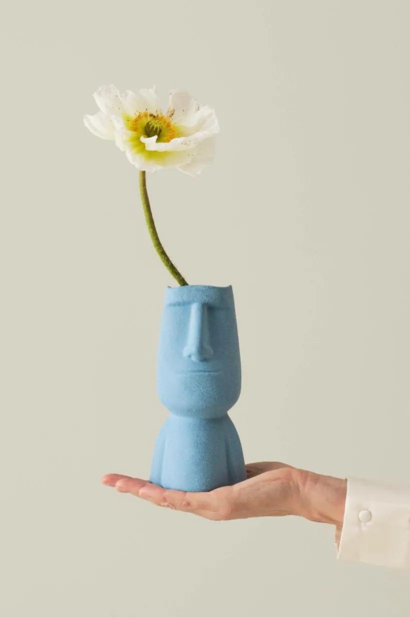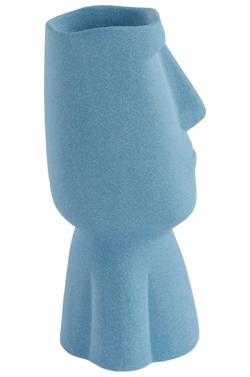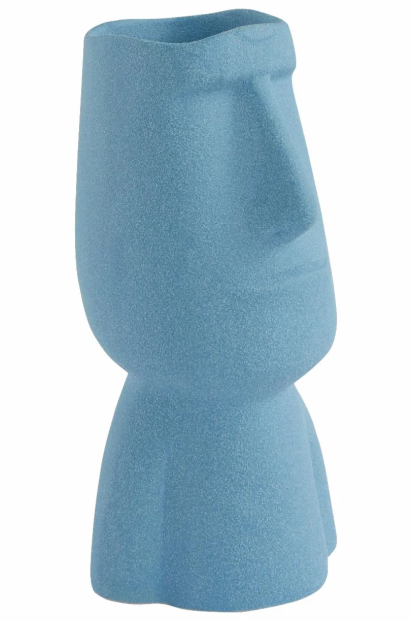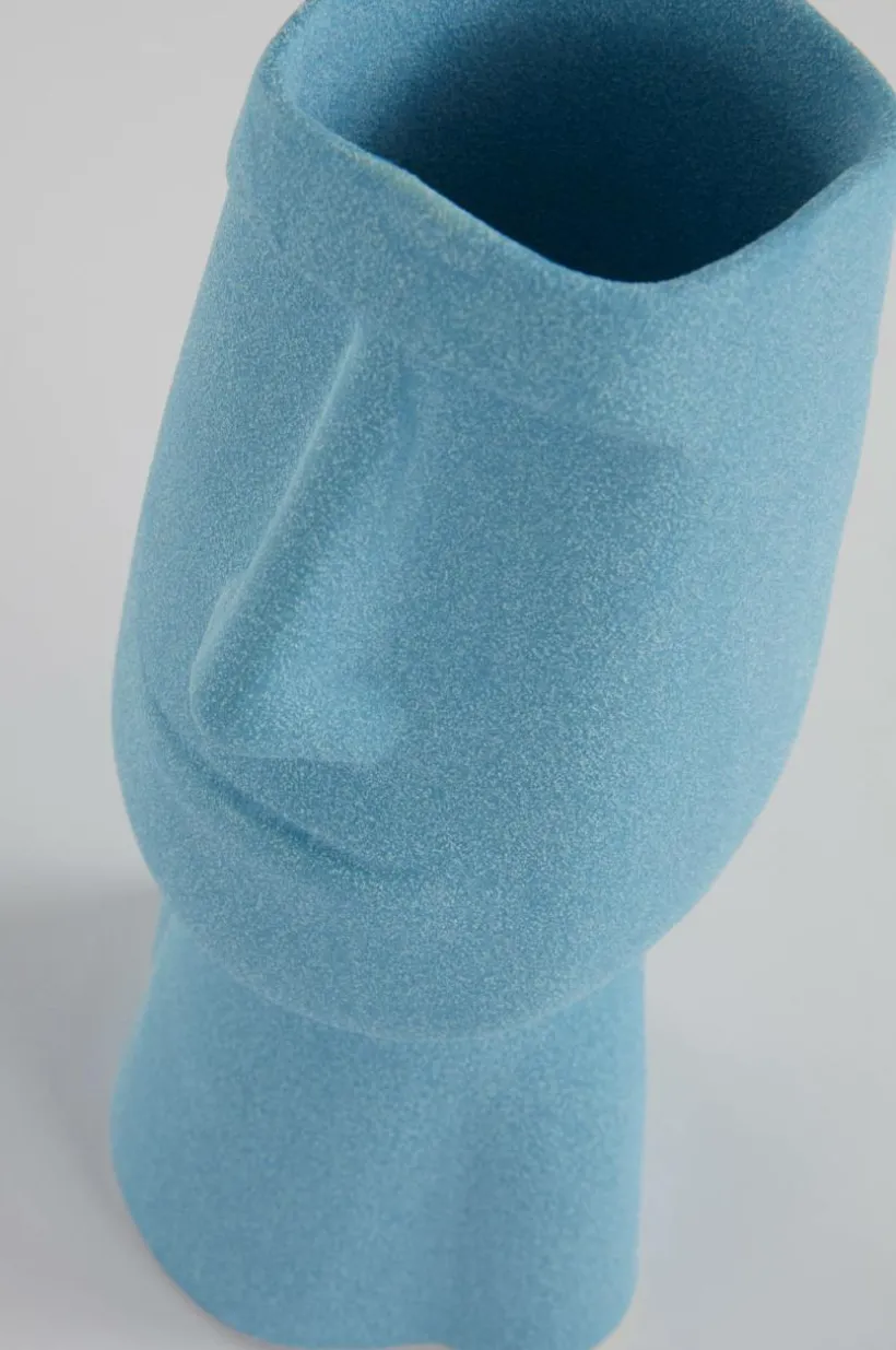 Vas av keramik, formad som en skulptur, GRUMPY kan användas både som dekoration och som vas. Vasen har glacerats för hand i mjuk blå nyans och ytan har sandfinish. Även insidan är glacerad. Det fina hantverket gör att varje vas är unik. Keramik kan släppa igenom fukt.