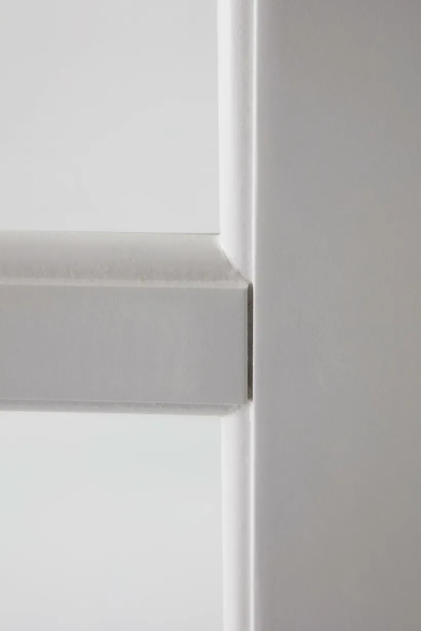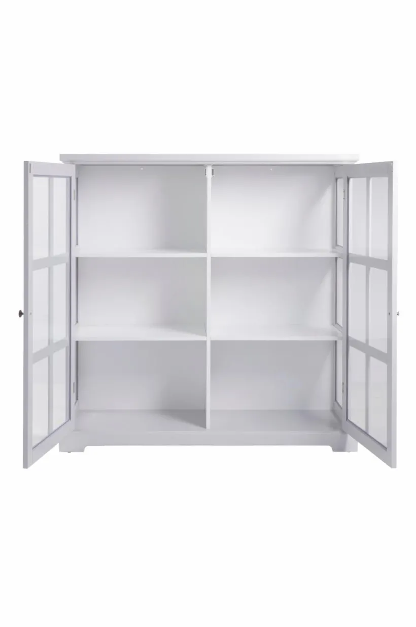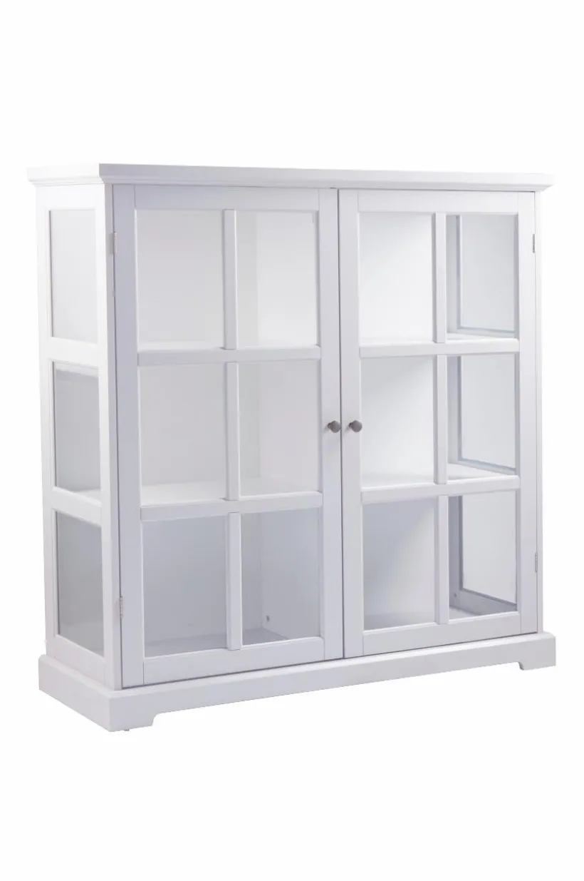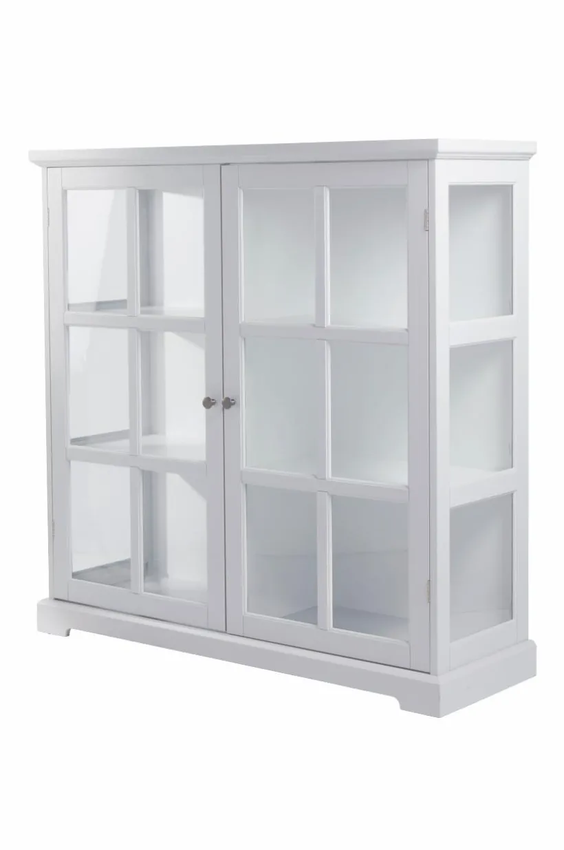 Vitrinskåp i MDF med dörrar i glas och silverknoppar. Djupa hyllor som gör att du får plats med mycket. Skåpet har lackad yta. Maxbelastning hyllplan: 20 kg. Levereras omonterat. Monteringsanvisning medföljer.