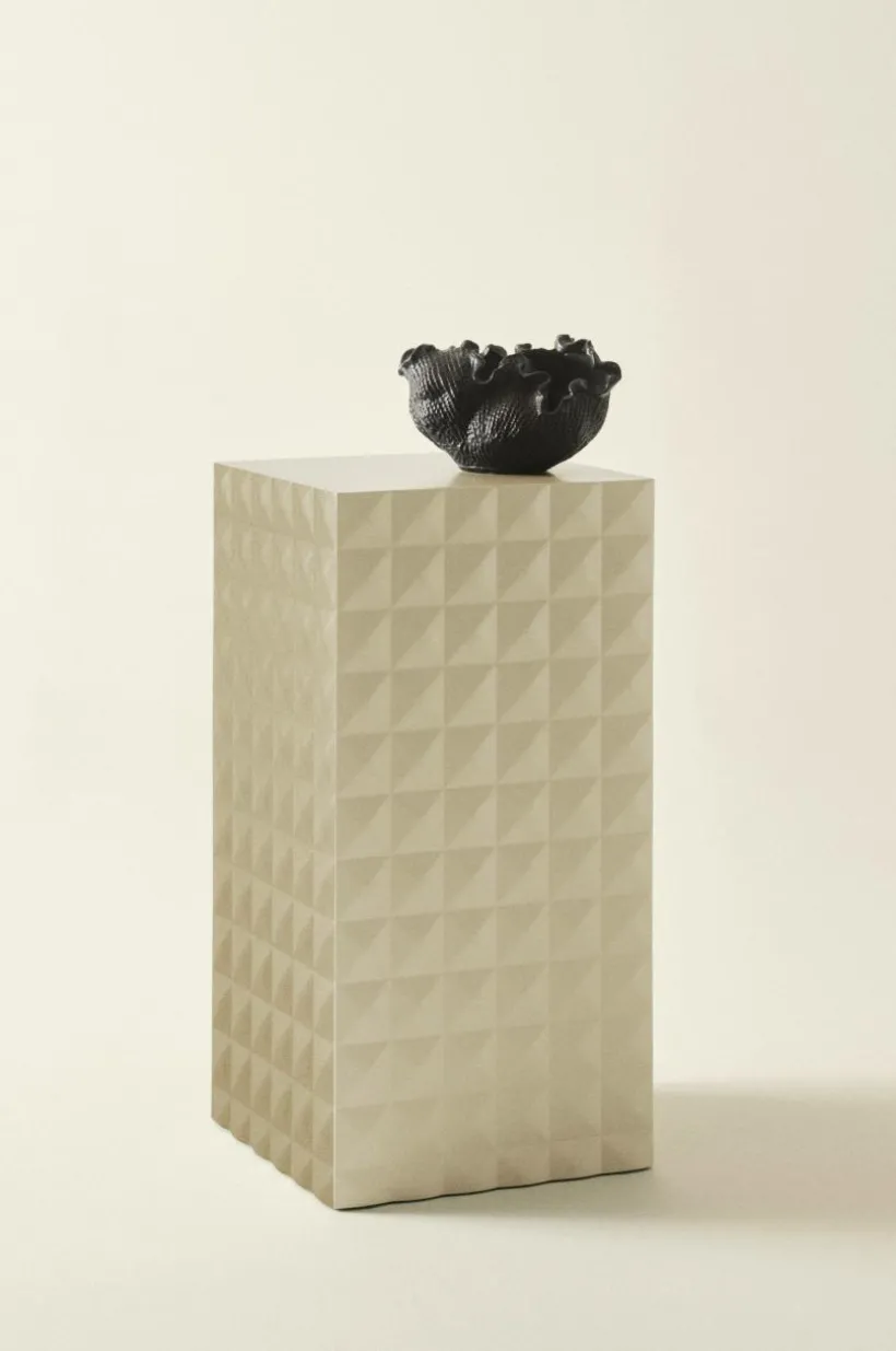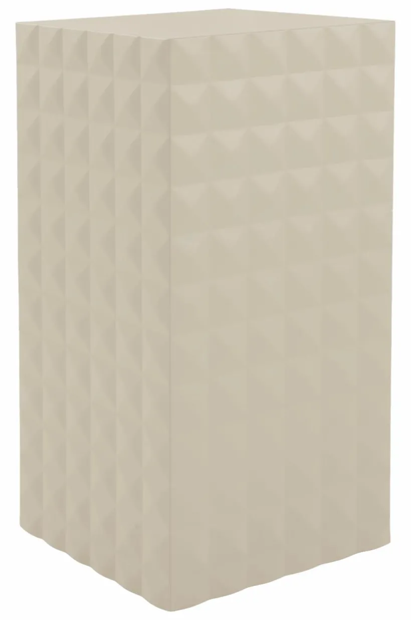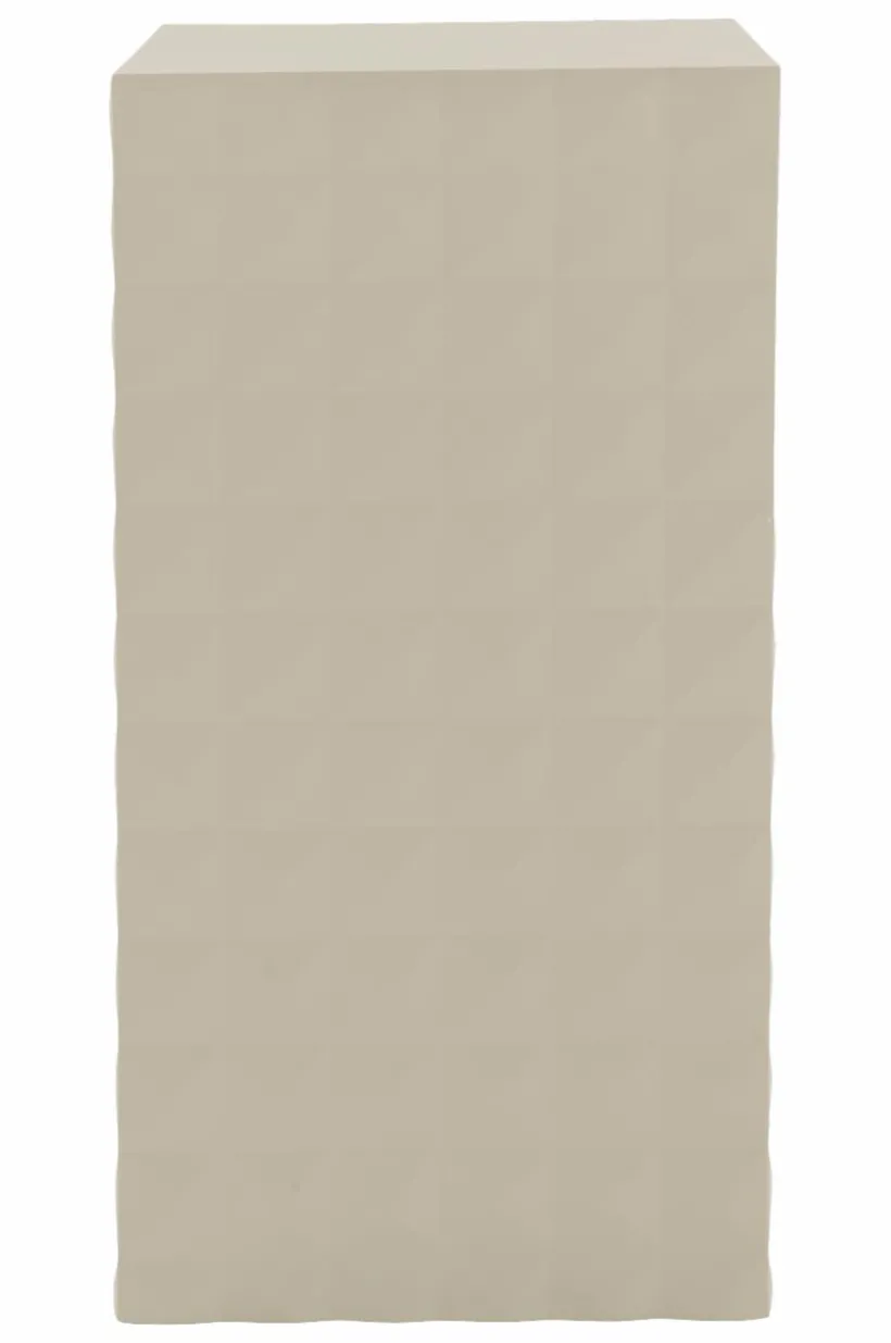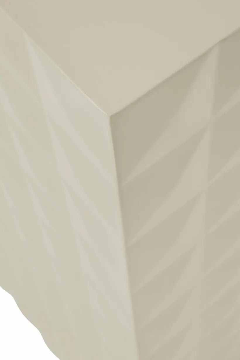 Kvadratiskt sidobord av FSC-märkt MDF som lackerats med matt färg. Bordsskivan är slät medan sidorna har effektfullt geometriskt mönster med läcker 3D-effekt. Bordet är lite högre och gör sig fint som piedestal till gröna växter eller vacker dekoration.