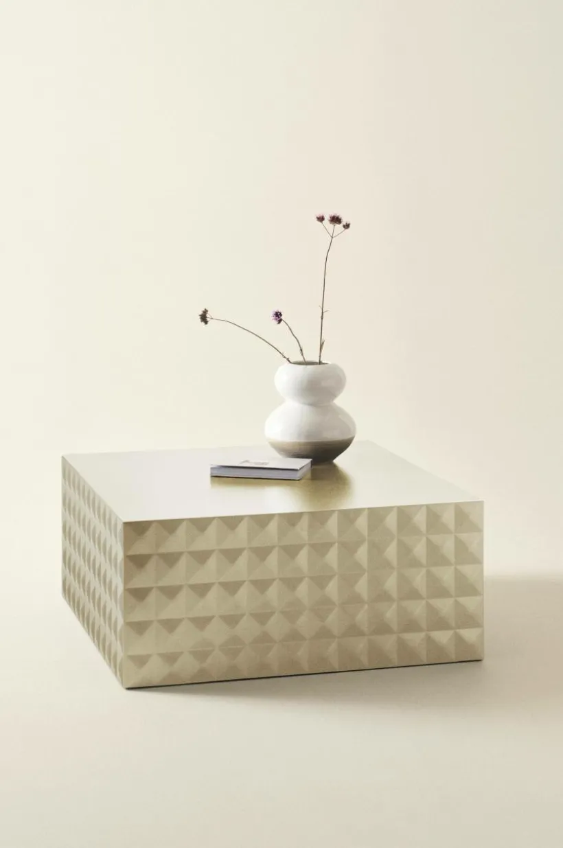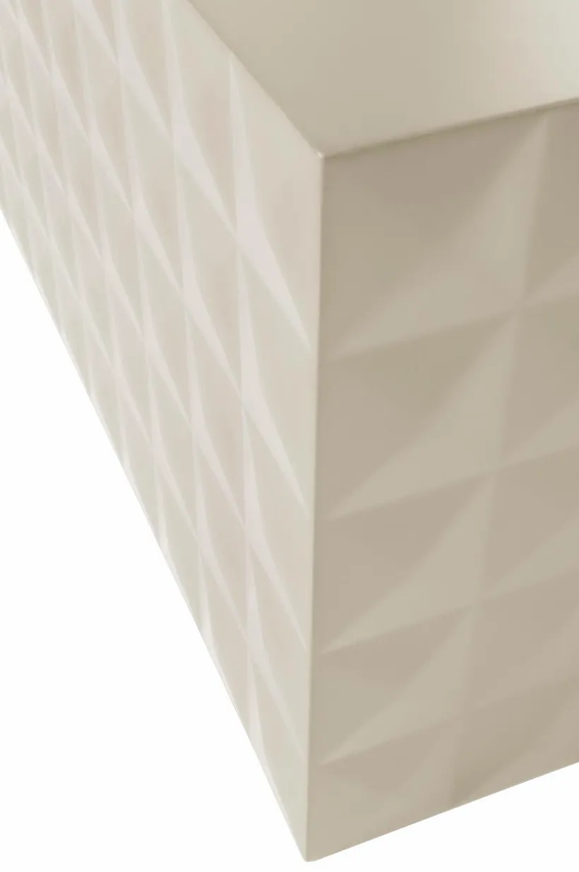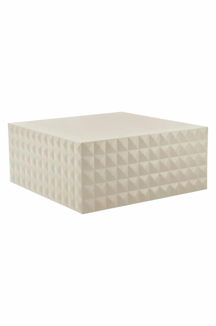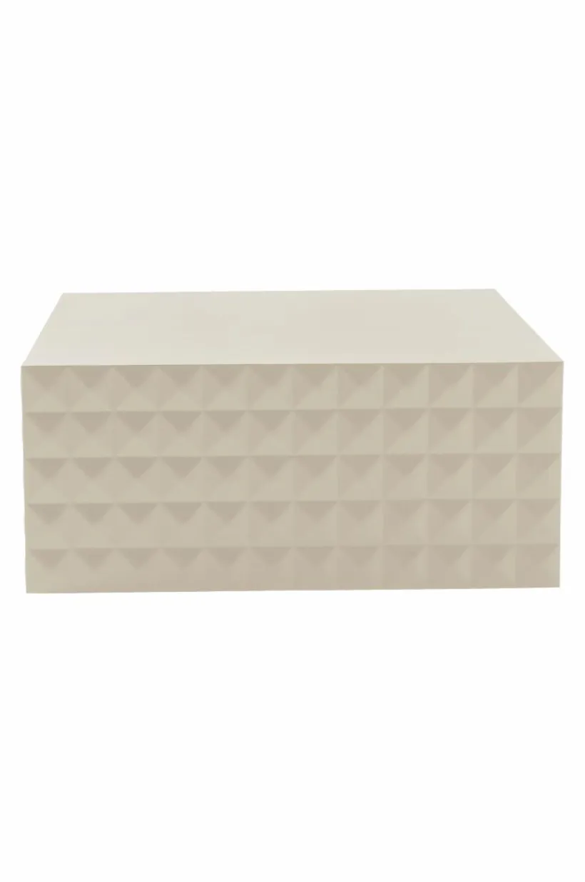 Kvadratiskt soffbord av FSC-märkt MDF som lackerats med matt färg. Bordsskivan är slät medan sidorna har effektfullt geometriskt mönster med läcker 3D-effekt.