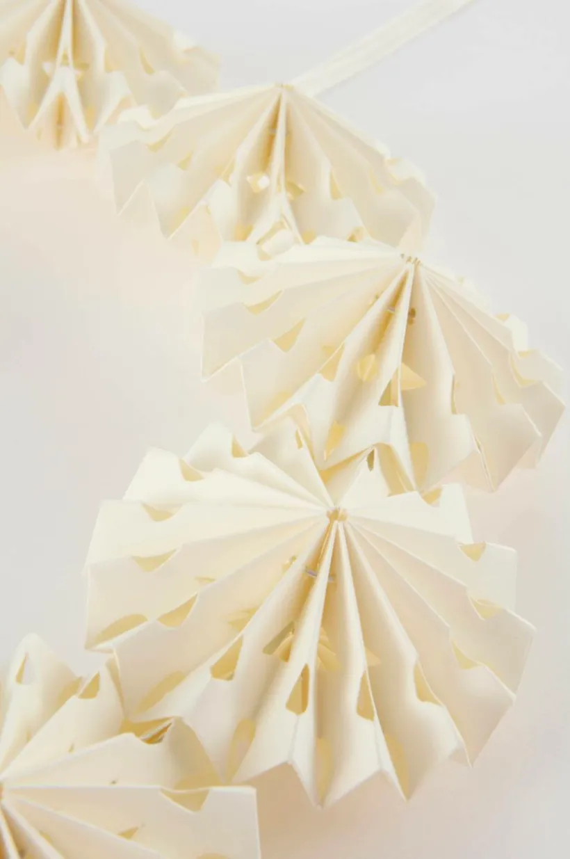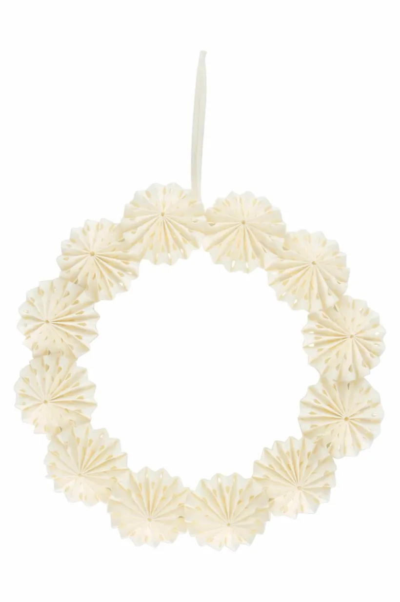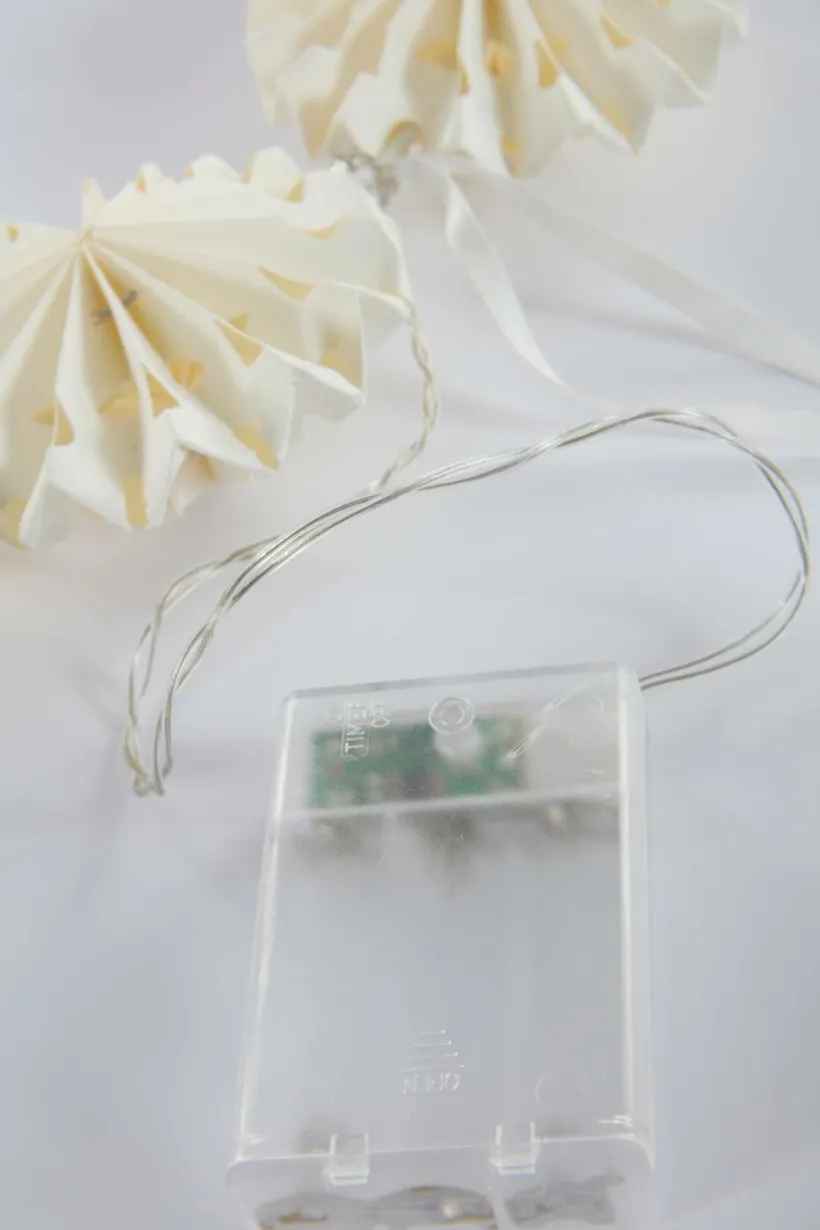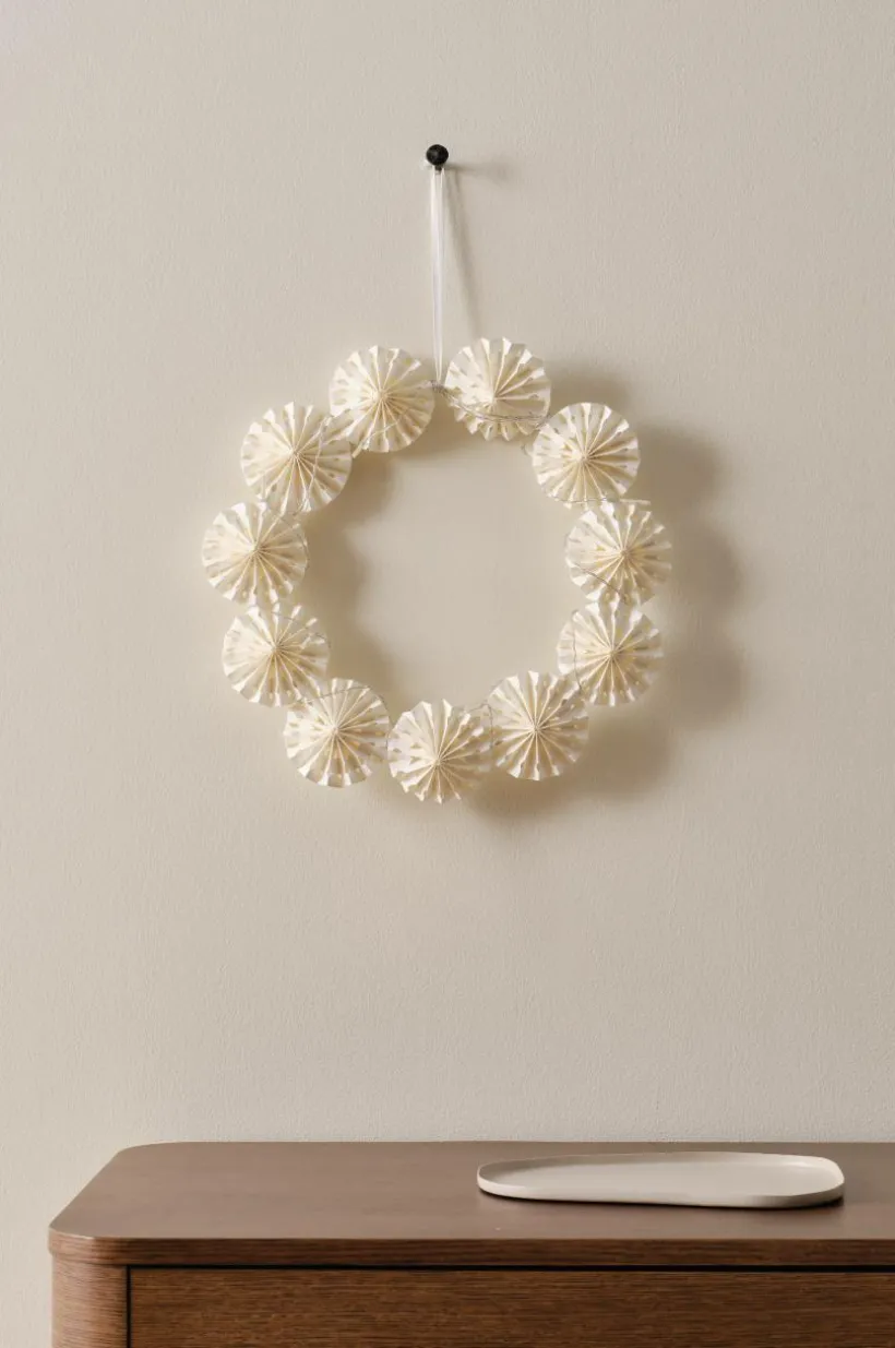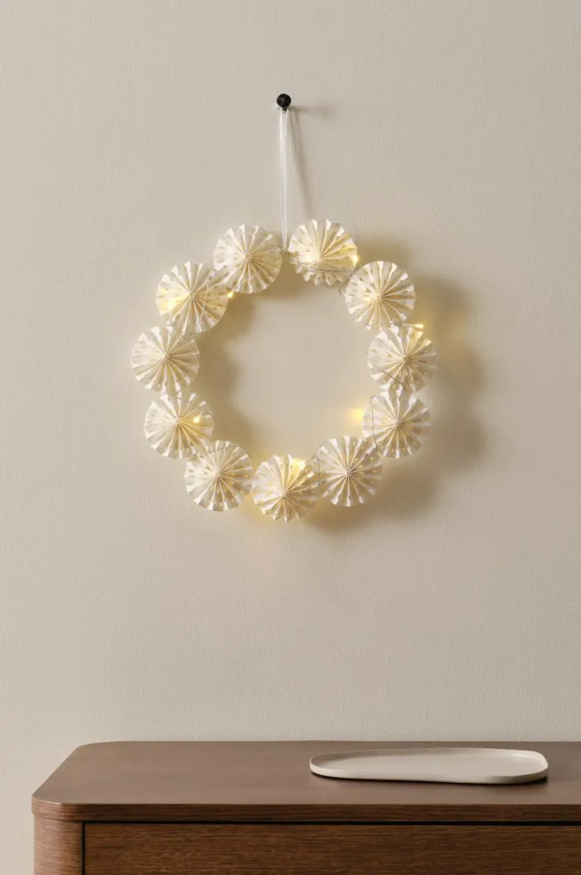 Krans av fint papper med ljusslinga. HALO gör det mysigare i hallen, köket eller sovrummet. Den batteridrivna dekorationen ger ett varmt och inbjudande sken.