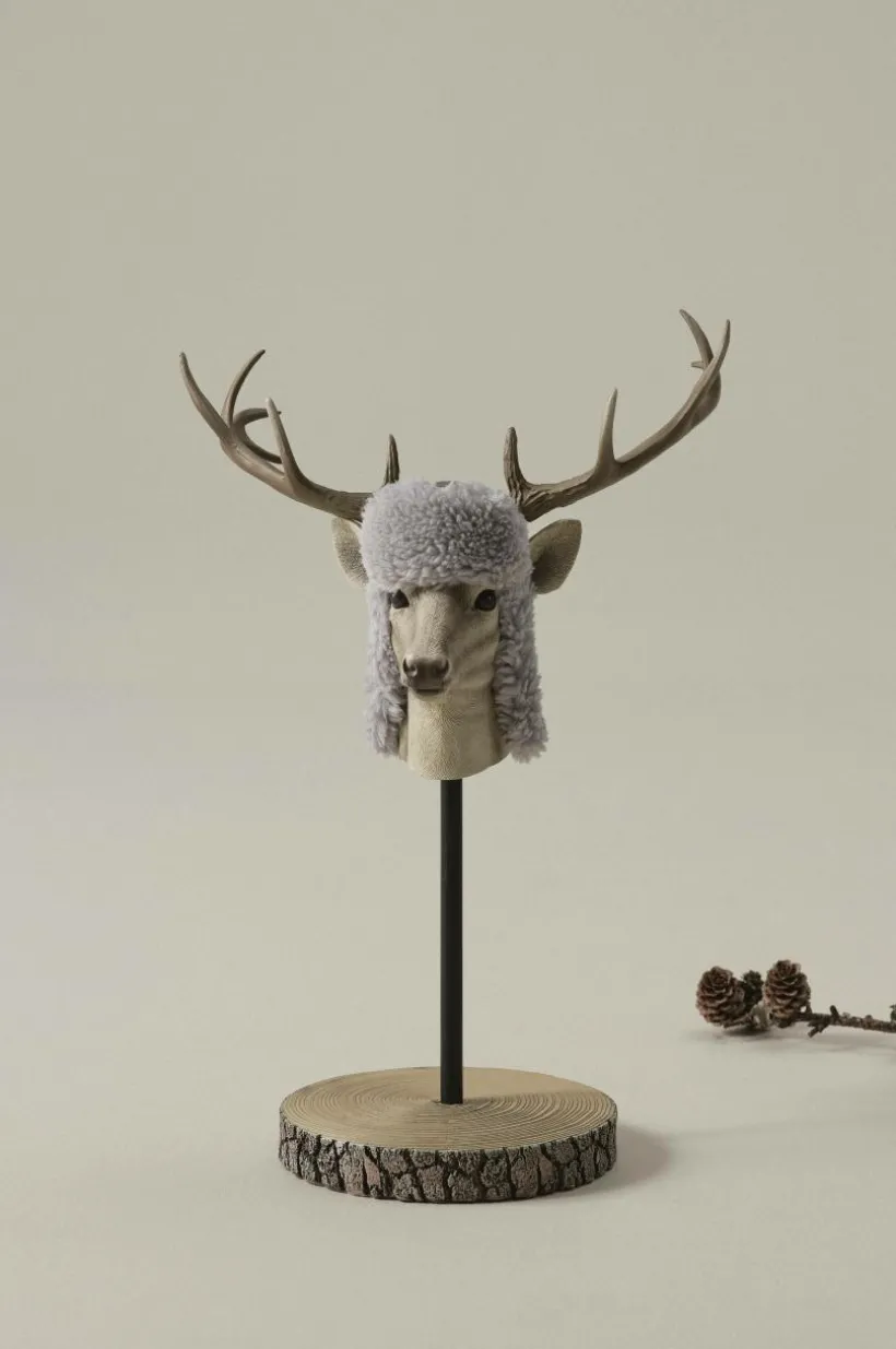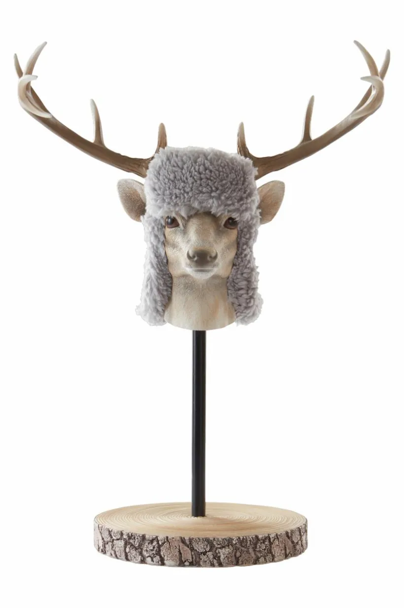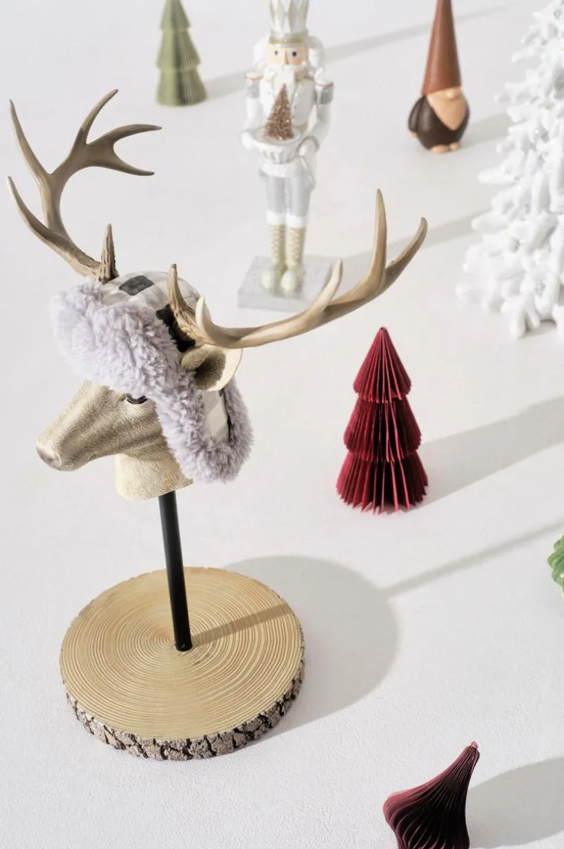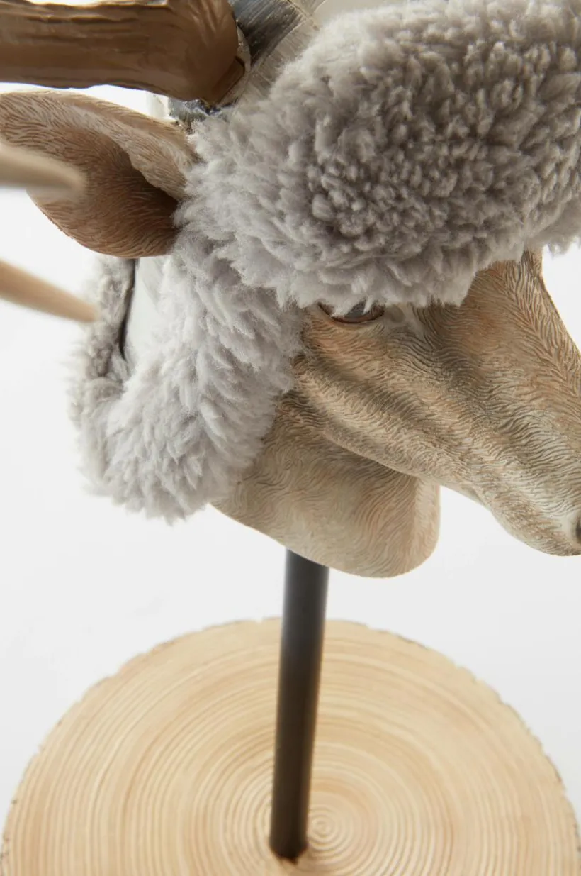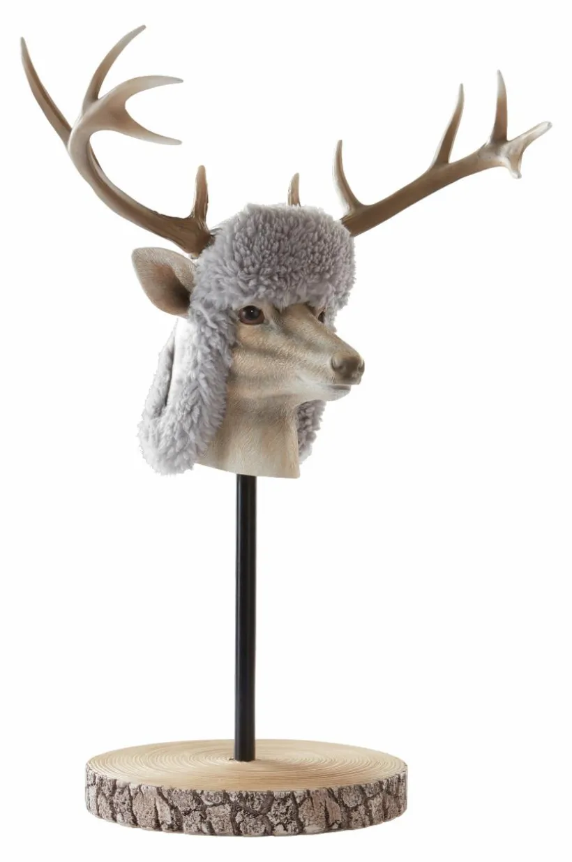 Handgjord dekorationsfigur av dolomitporslin med pälsmössa av polyester. Hjorthuvudet står på en rund platta som ser ut som en träskiva. Det fina hantverket gör varje dekoration unik.
