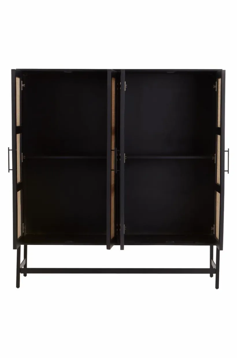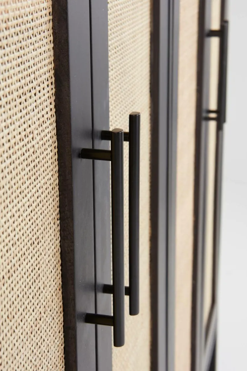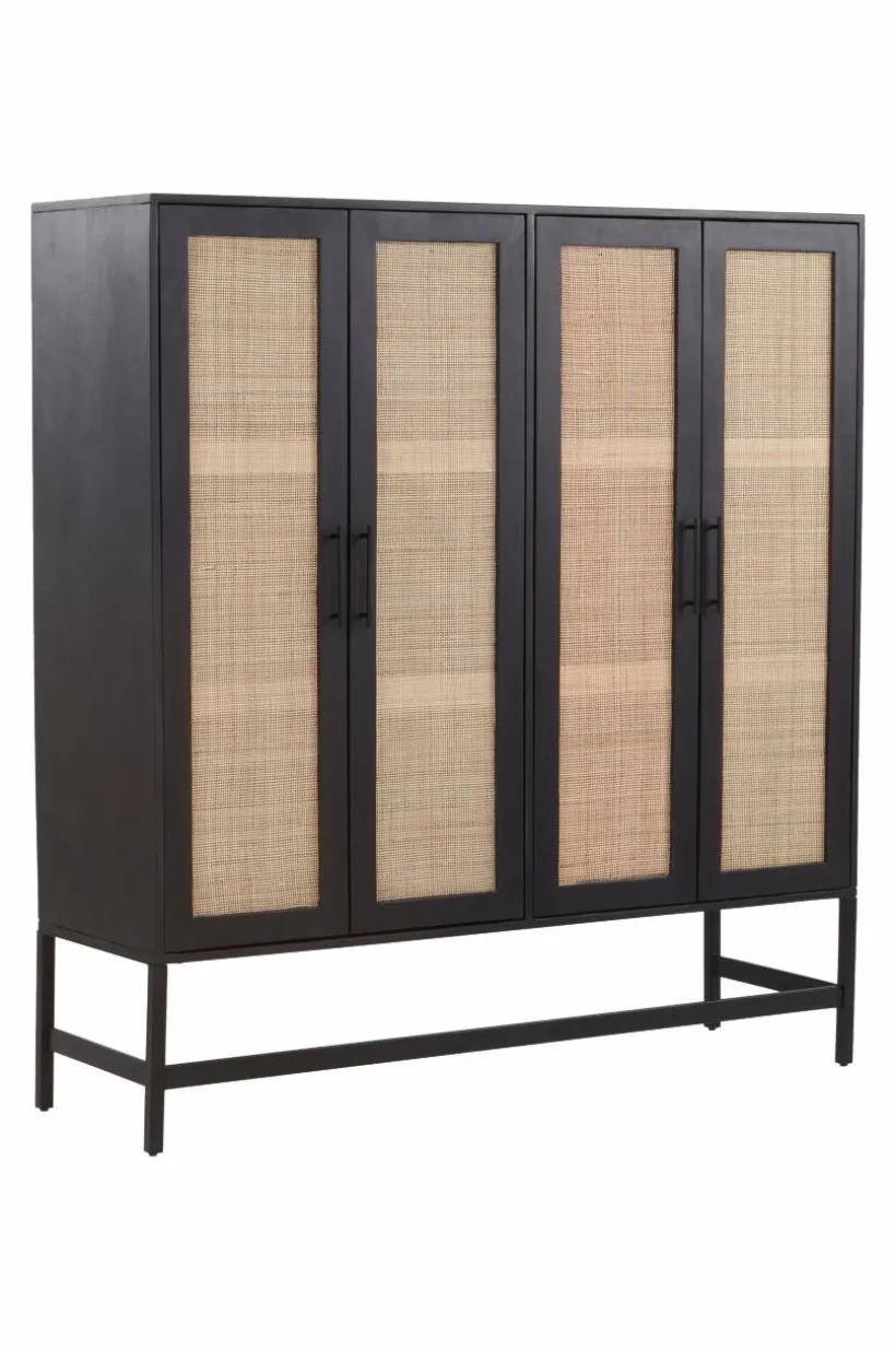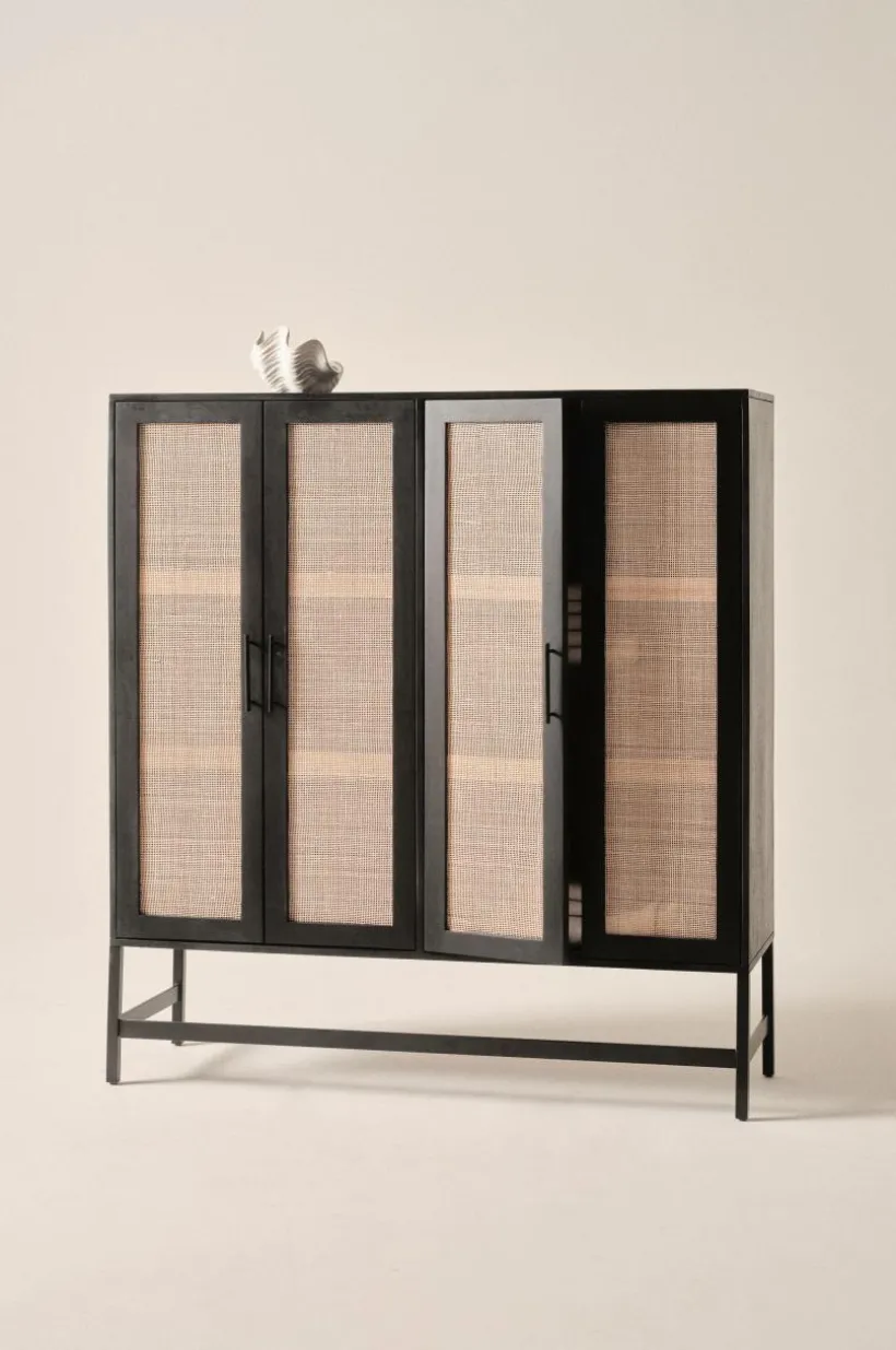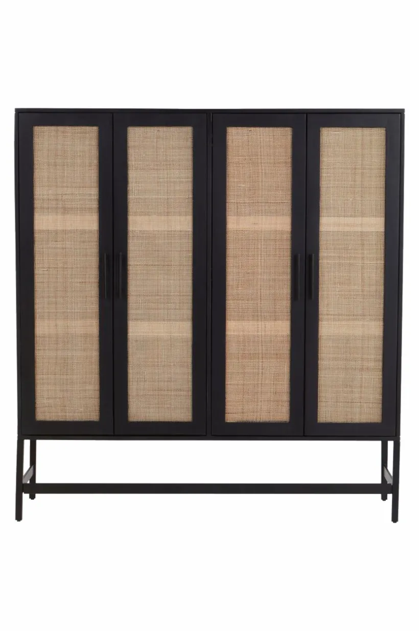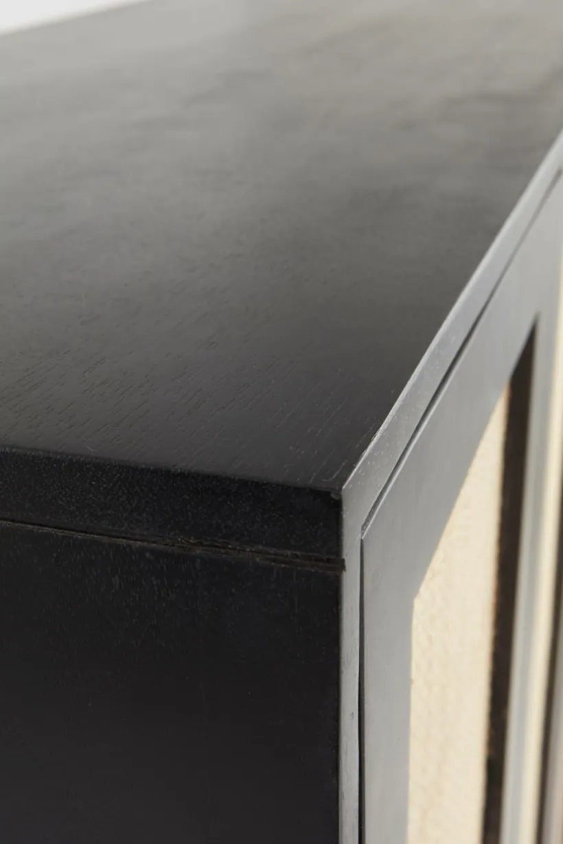 HARRLOW är ett handgjort, rymligt skåp av massivt mangoträ med naturfärgad, flätad rotting i dörrarna. Skåpet har mattlackad charcoal-finish och det smäckra underredet av stål ger en nättare framtoning. Bakom de fyra dörrarna är skåpet delat i två delar och med ett fast hyllplan i varje avdelning ger det praktisk förvaring av saker som behöver lite mer utrymme. Dörrarna har svarta beslag av stål och mjukstängande gångjärn. Det fina hantverket gör varje skåp unikt. Viss montering krävs. Monteringsanvisning medföljer.