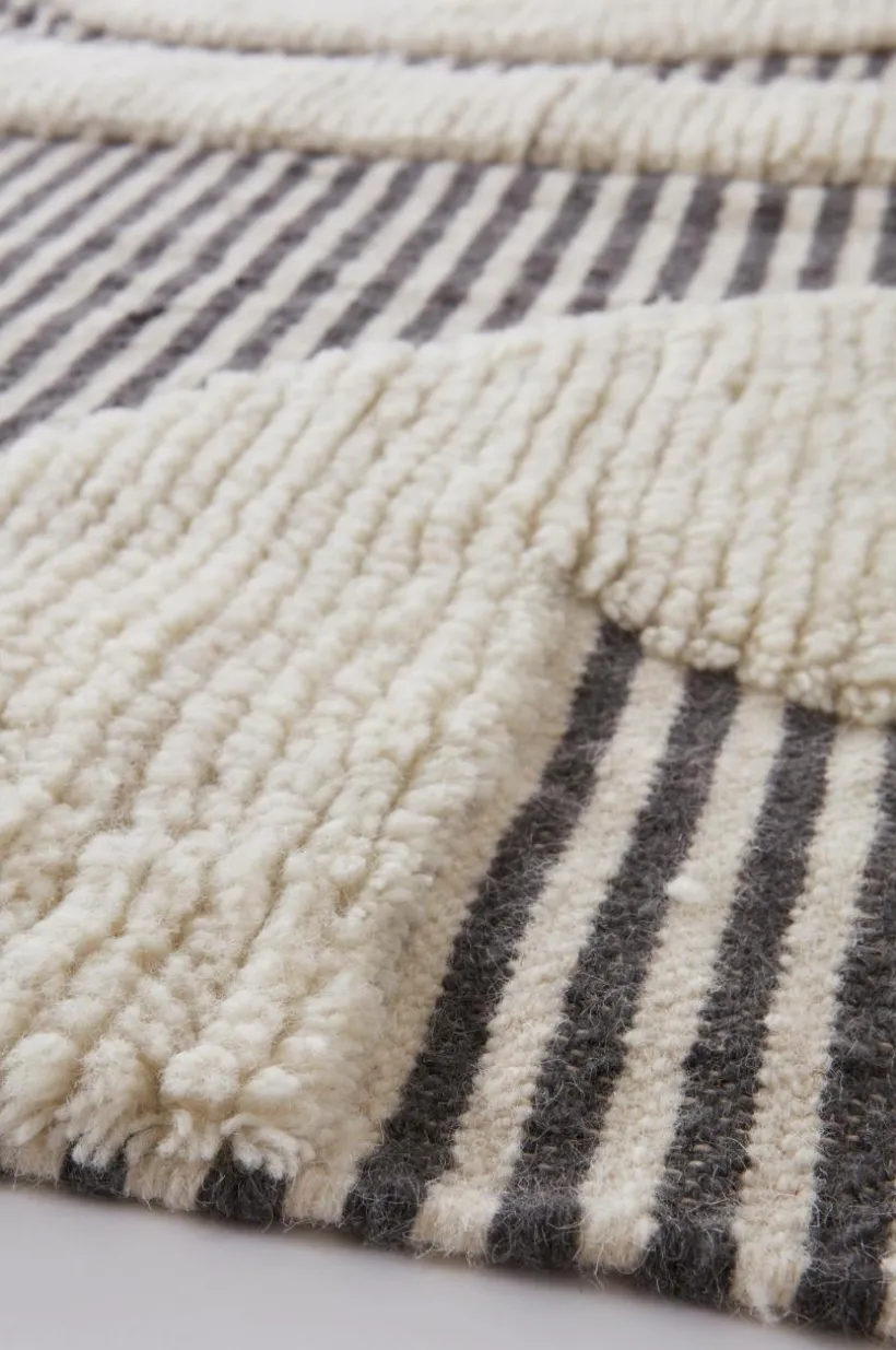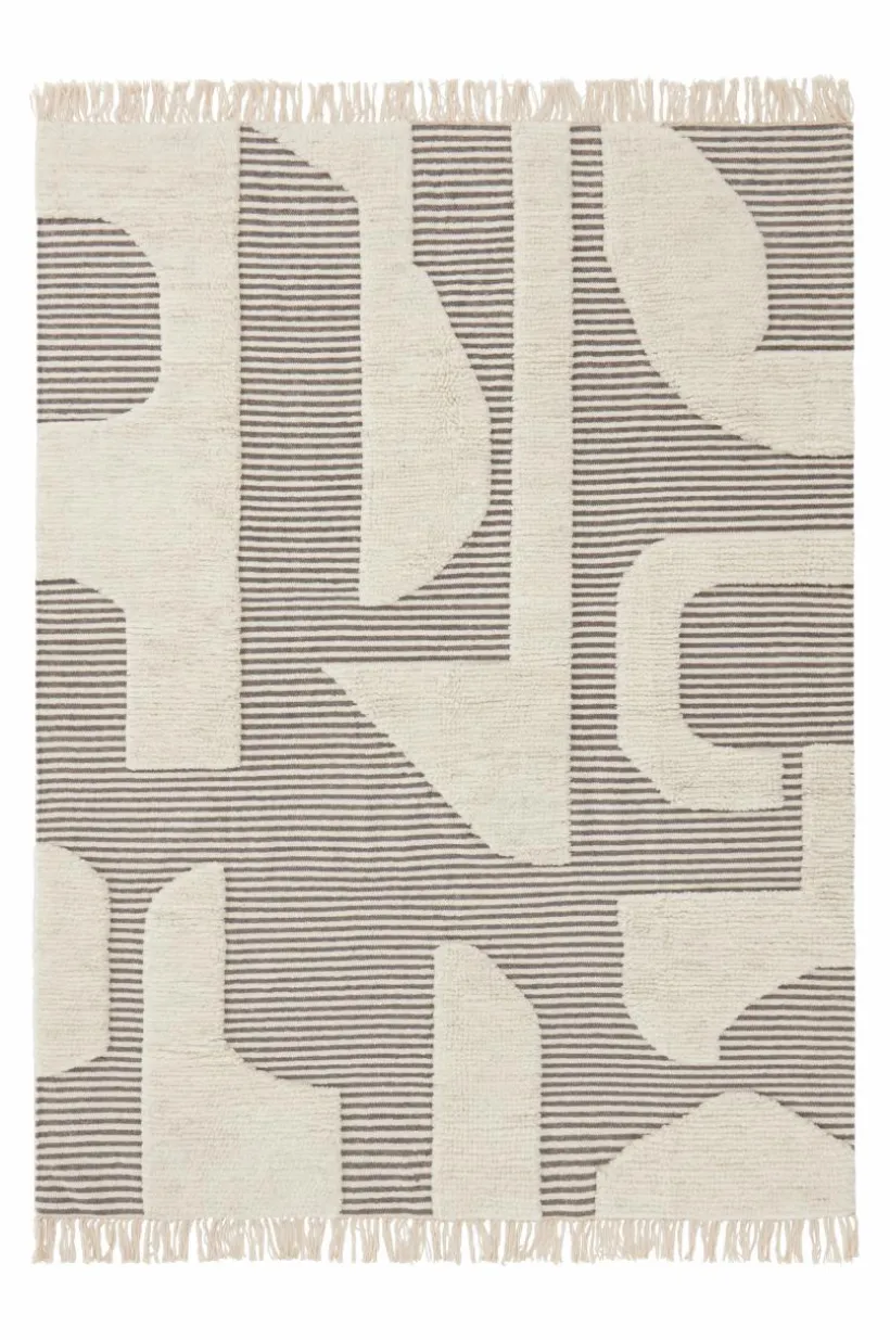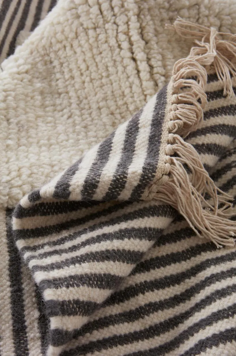 Handvävd matta av ull och bomull. HASSANE är i grunden en kelimmattan, vilket är en slätvävd matta. Vissa partier har sedan tuftats och fått en mjuk lugg. Detta gör mattana HASSANE speciell och den sticker ut från mängden med sina ljusa partier med lugg på en slätvävd, randvävd botten. Kelimmattor vävs ofta i naturliga material och HASSANE är av ull och bomull. Ull är ett praktiskt val då ullen är naturligt smutsavvisande. Mattan har fransar längs kortsidorna. Franslängd 10 cm. Lugghöjd 1,4-1,5 cm. Tjocklek 1,6-1,7 cm. 1500-1700 g/m².