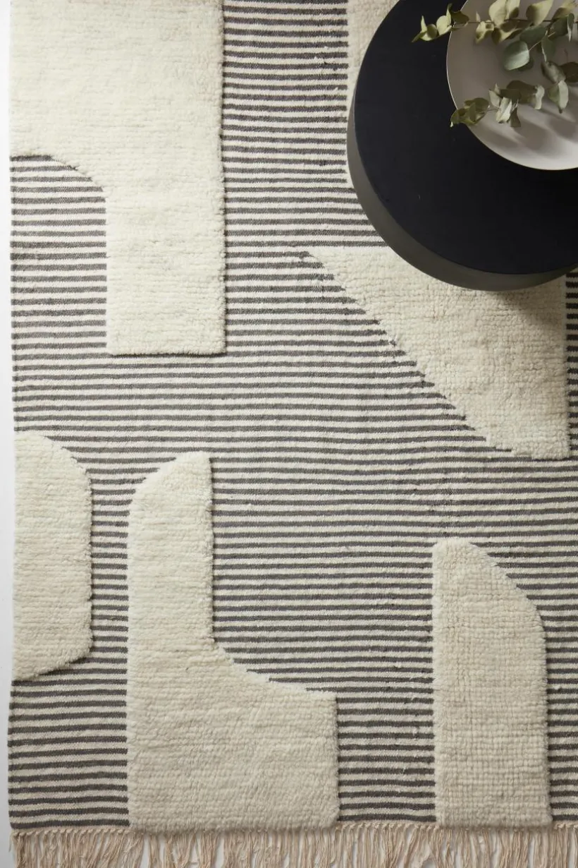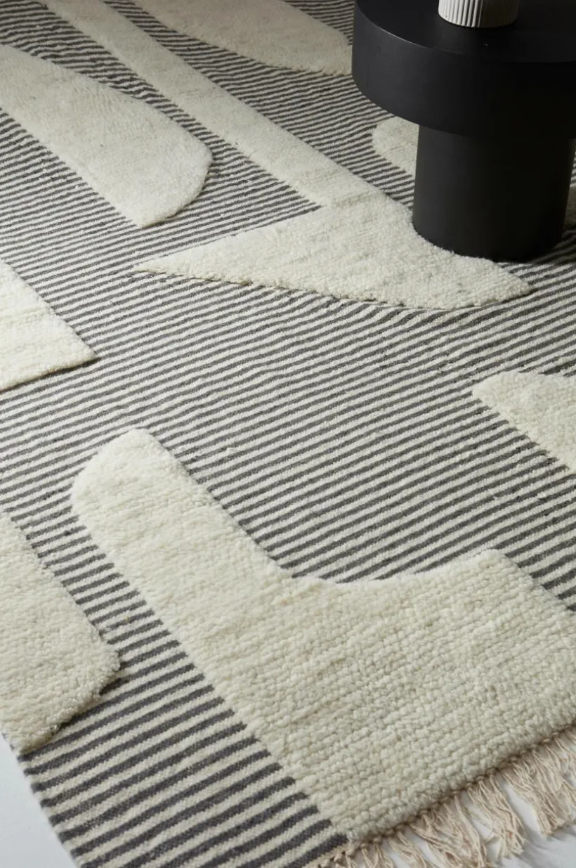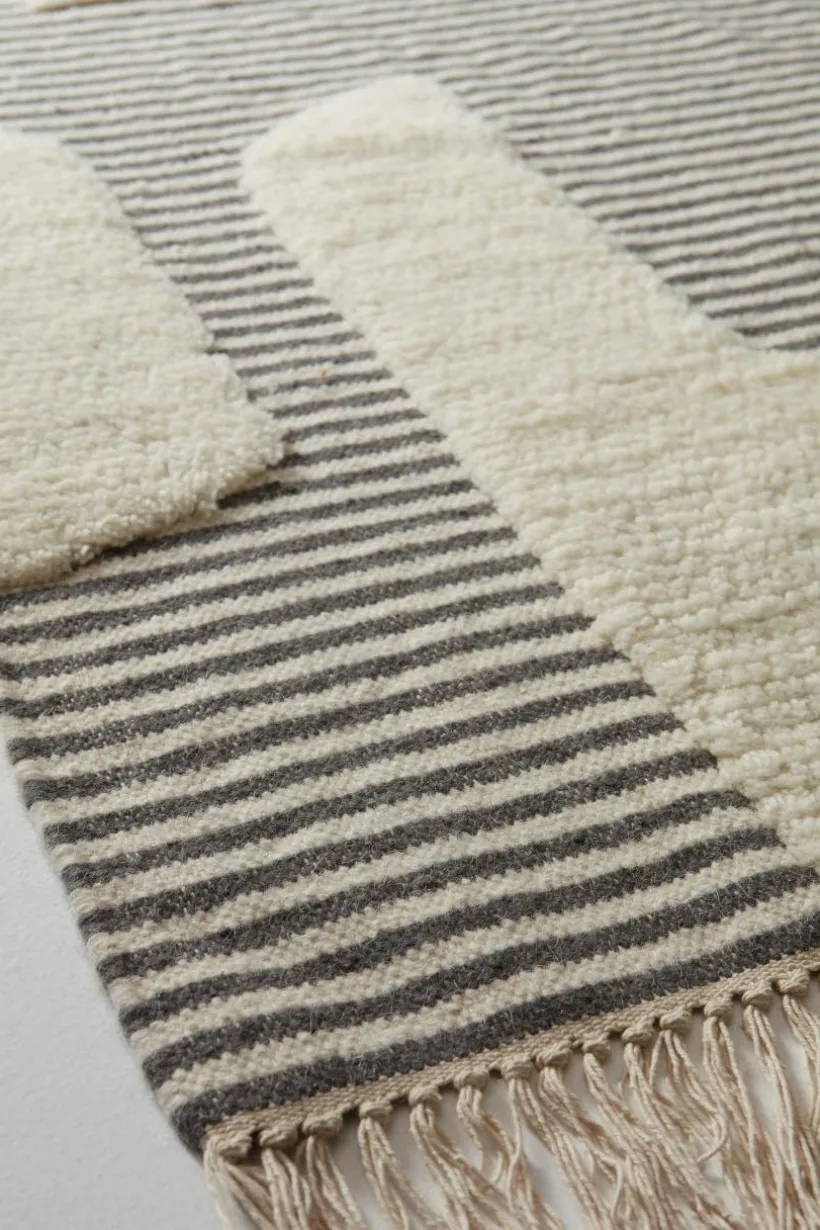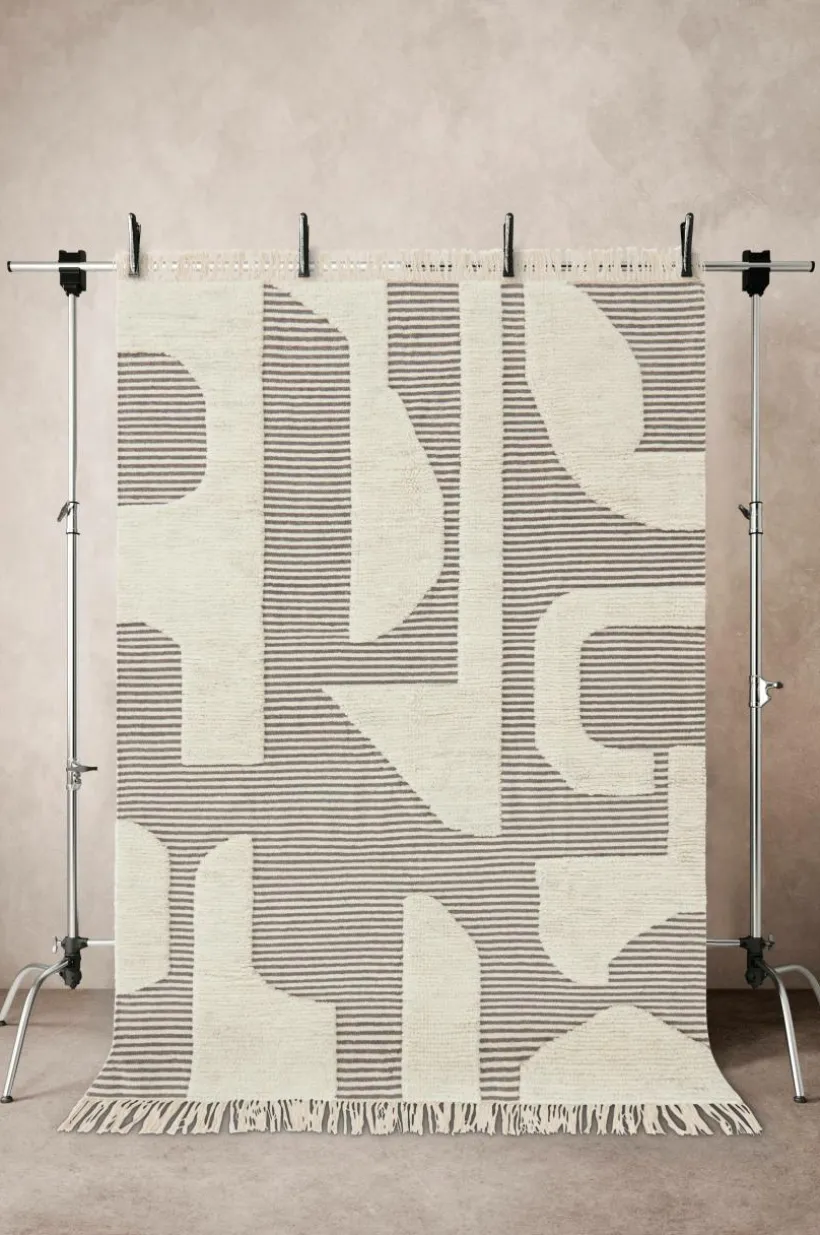 Handvävd matta av ull och bomull. HASSANE är i grunden en kelimmattan, vilket är en slätvävd matta. Vissa partier har sedan tuftats och fått en mjuk lugg. Detta gör mattana HASSANE speciell och den sticker ut från mängden med sina ljusa partier med lugg på en slätvävd, randvävd botten. Kelimmattor vävs ofta i naturliga material och HASSANE är av ull och bomull. Ull är ett praktiskt val då ullen är naturligt smutsavvisande. Mattan har fransar längs kortsidorna. Franslängd 10 cm. Lugghöjd 1,4-1,5 cm. Tjocklek 1,6-1,7 cm. 1500-1700 g/m².