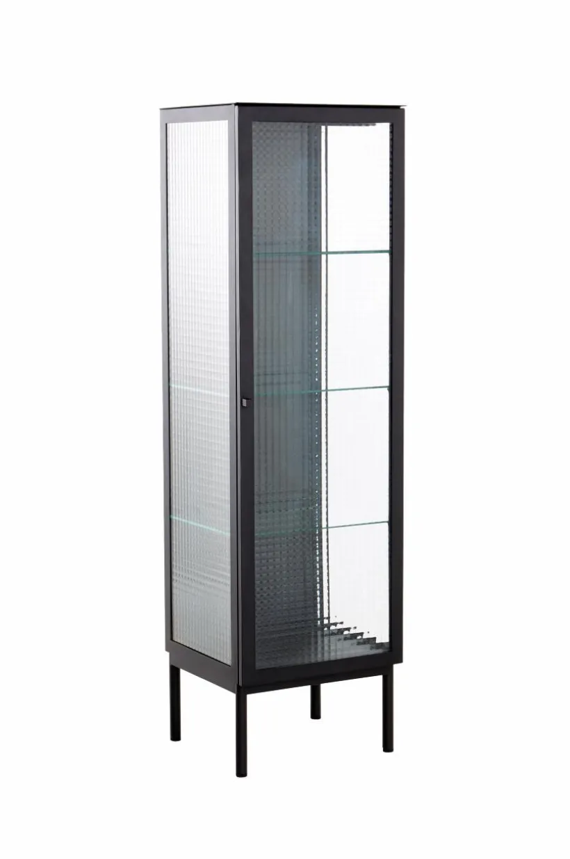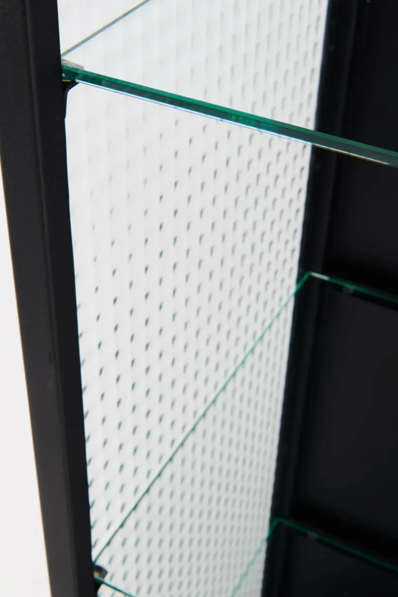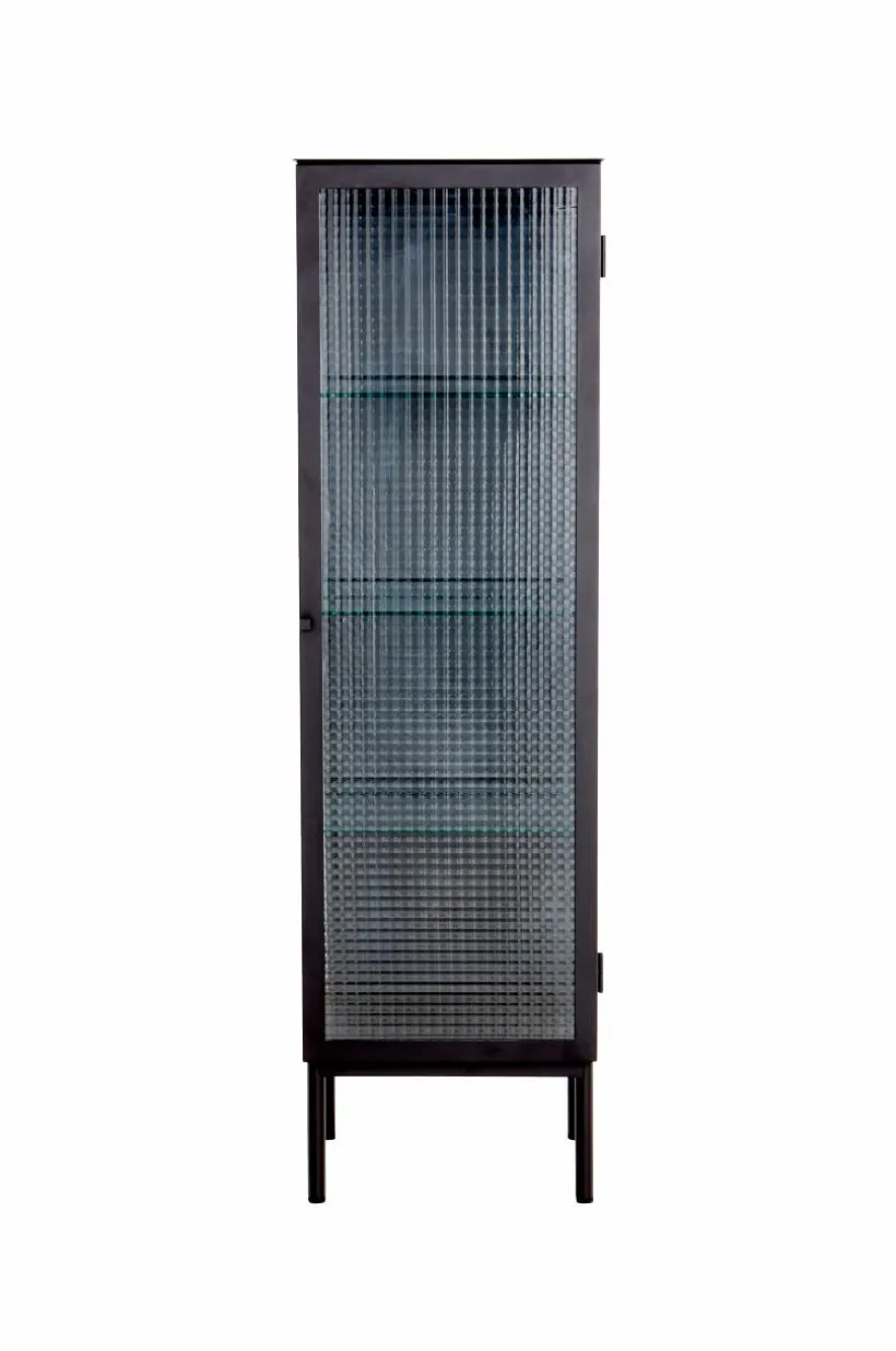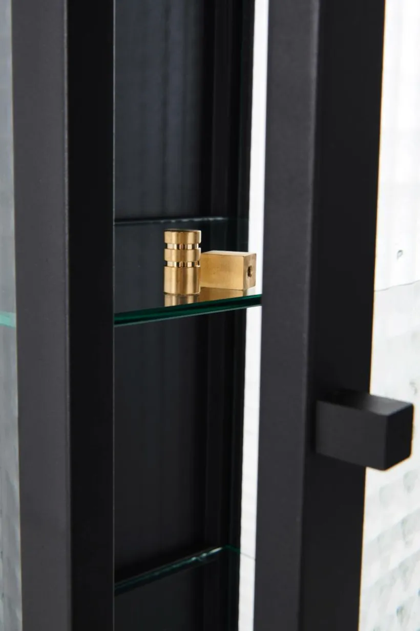 Skåp av stål med glasdörr. Skåpet har en svart, pulverlackad finish och dekorativt trådglas med effektfullt mönster i dörren och på sidorna. Du kan förända ditt skåp genom att byta knoppen i dörren. Tre knoppar följer med – en kantig metallknopp i matchande färg, en kantig mässingsknopp och en rund mässingsknopp. De tre hyllplanen är av klarglas och baksidan är av pulverlackerad stål. Hyllplanen är urtagbara.