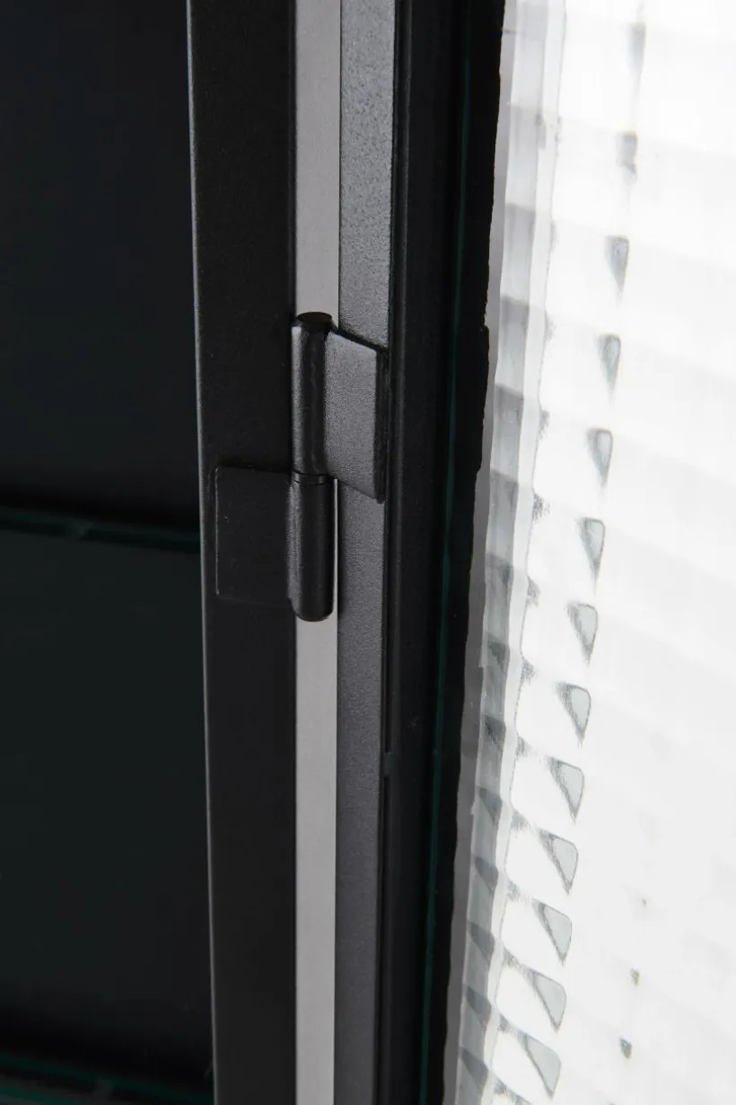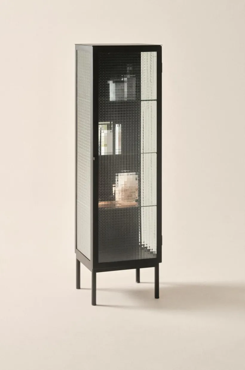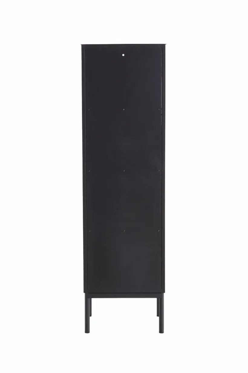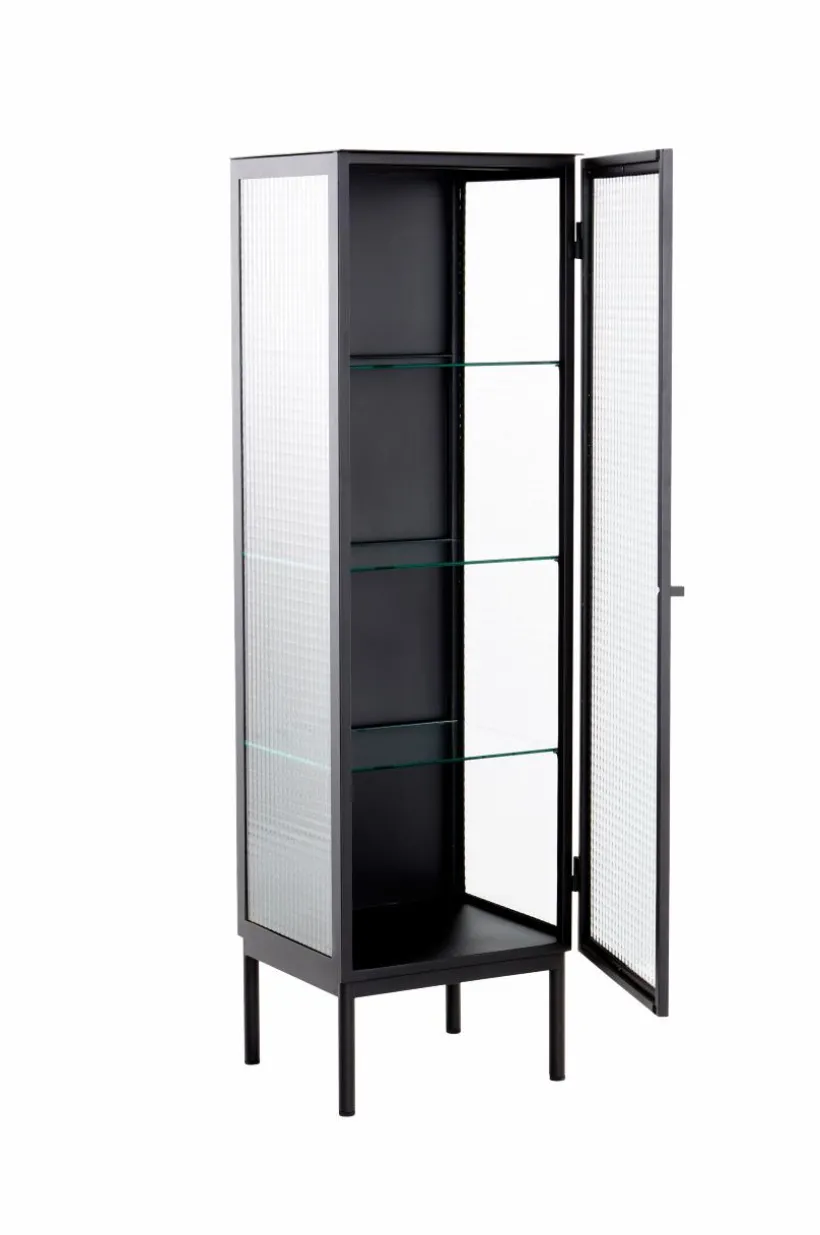 Skåp av stål med glasdörr. Skåpet har en svart, pulverlackad finish och dekorativt trådglas med effektfullt mönster i dörren och på sidorna. Du kan förända ditt skåp genom att byta knoppen i dörren. Tre knoppar följer med – en kantig metallknopp i matchande färg, en kantig mässingsknopp och en rund mässingsknopp. De tre hyllplanen är av klarglas och baksidan är av pulverlackerad stål. Hyllplanen är urtagbara.