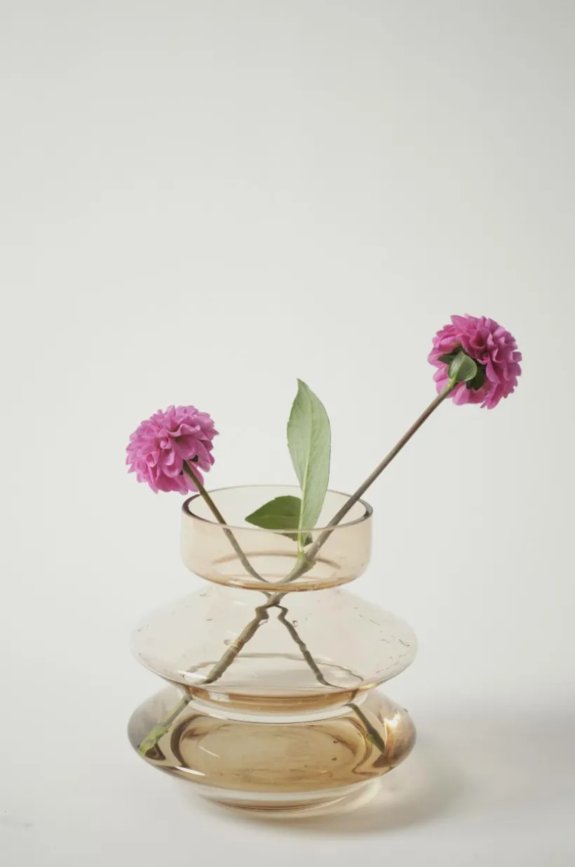 Glasvas med stilren och retroinspirerad form. HAZE är en lika snygg dekoration utan, som med blommor.