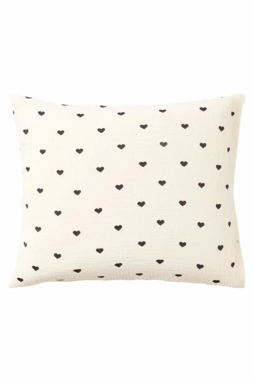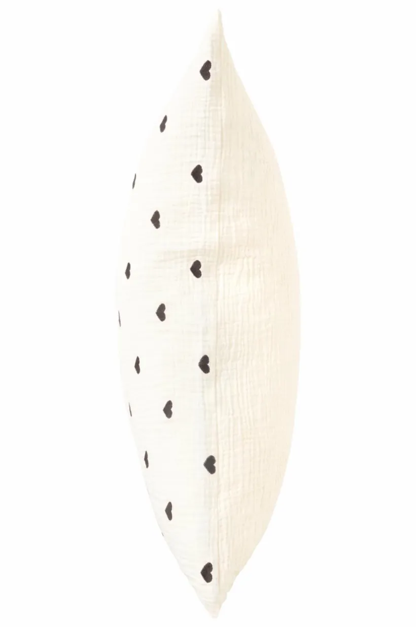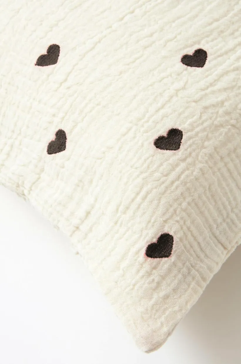 1-pack örngott i härlig, ekologisk bomullsmuslin med broderade hjärtan. Muslin är ett mjukt, tunt tyg i två lager, vävt med lite bubblig effekt, vilket gör tyget mjukt och extra lättskött. Du behöver inte stryka eller mangla. Det behagliga muslintyget är skönt att sova i. Baksidan är enfärgad. Trådtäthet på 178 tc. (Trådtätheten talar om antalet trådar, thread counts, per kvadrattum i ett tyg. Ju högre trådtäthet desto högre kvalité.)