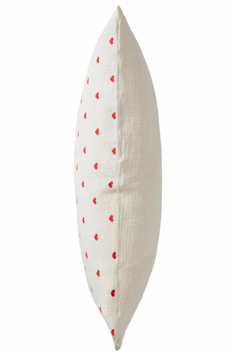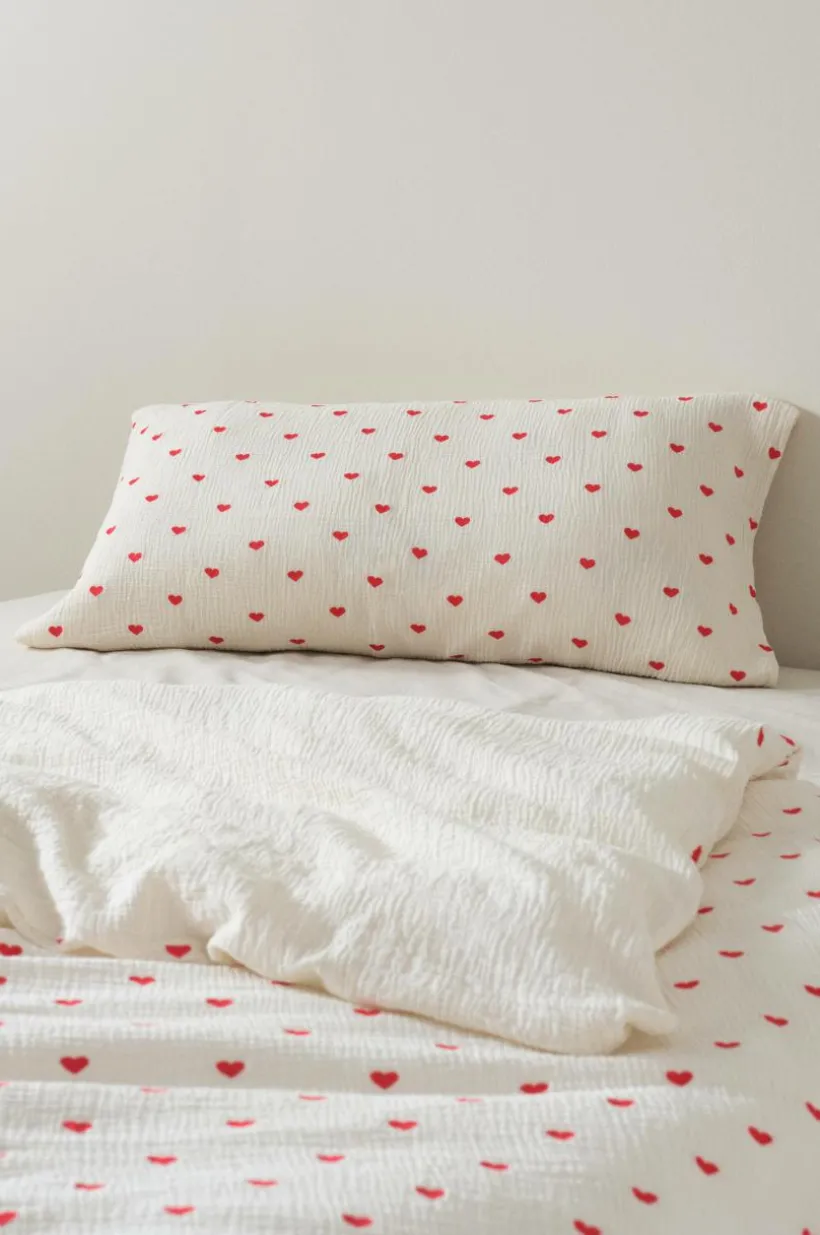 1-pack örngott i härlig, ekologisk bomullsmuslin med broderade hjärtan. Muslin är ett mjukt, tunt tyg i två lager, vävt med lite bubblig effekt, vilket gör tyget mjukt och extra lättskött. Du behöver inte stryka eller mangla. Det behagliga muslintyget är skönt att sova i. Baksidan är enfärgad. Trådtäthet på 178 tc. (Trådtätheten talar om antalet trådar, thread counts, per kvadrattum i ett tyg. Ju högre trådtäthet desto högre kvalité.)