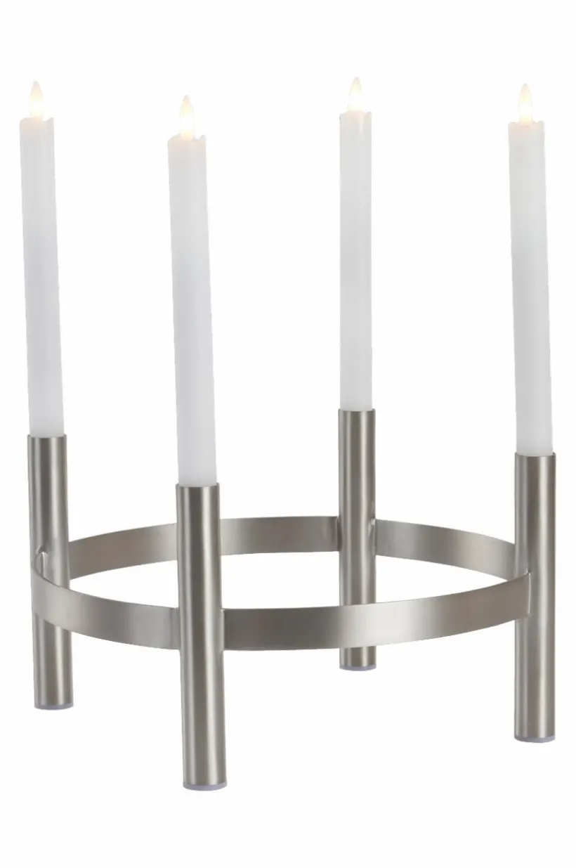 Ljusstake av järn. Den runda ljusstaken är strikt och stilren med fyra ljushållare. Den är vacker i sin enkelhet och du kan dekorera den med någon slingrande kvist eller ett band. Den svarta har matt pulverlack och den silverfärgade har borstad finish. HENRY gör sig fint som adventsljusstake och passar också fint till sommarfestens dukning. Det är en ljusstake som passar året om och den är vacker både till vardag och fest. Ljus medföljer ej.