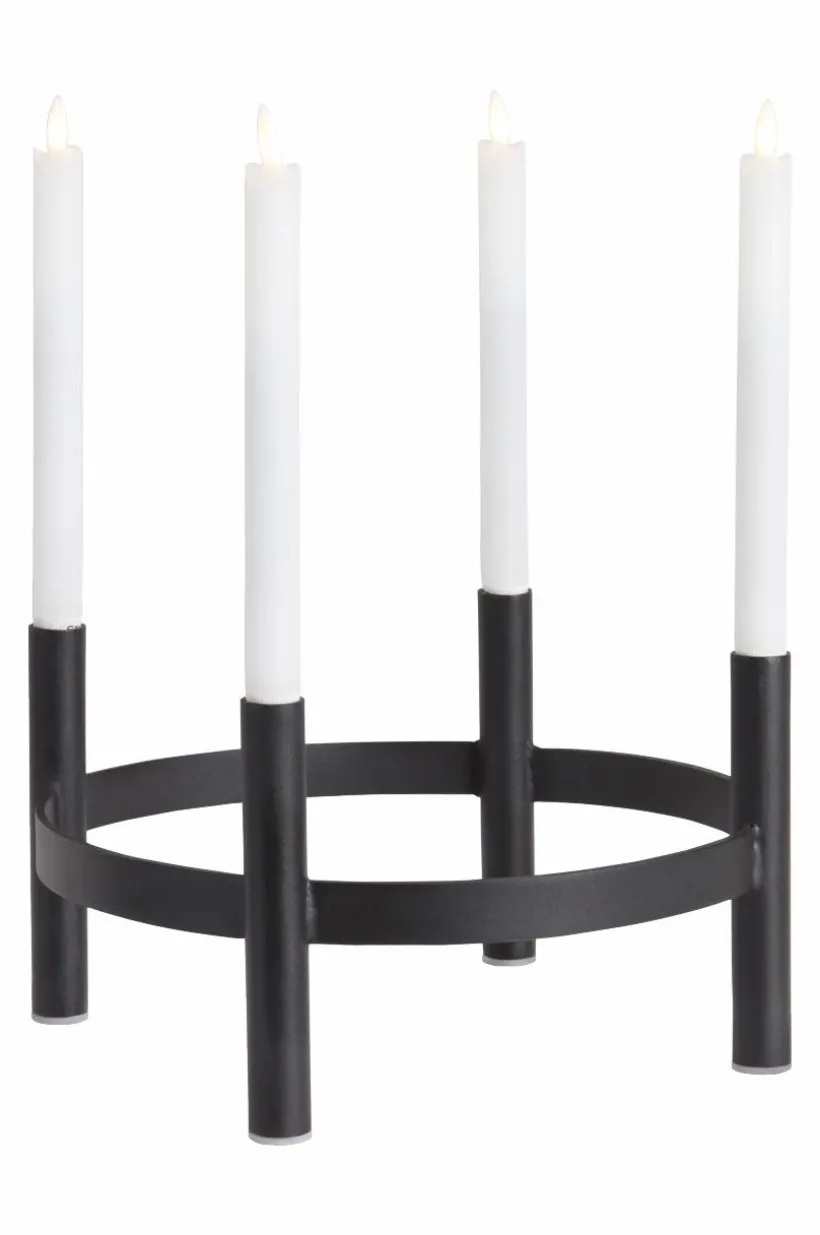 Ljusstake av järn. Den runda ljusstaken är strikt och stilren med fyra ljushållare. Den är vacker i sin enkelhet och du kan dekorera den med någon slingrande kvist eller ett band. Den svarta har matt pulverlack och den silverfärgade har borstad finish. HENRY gör sig fint som adventsljusstake och passar också fint till sommarfestens dukning. Det är en ljusstake som passar året om och den är vacker både till vardag och fest. Ljus medföljer ej.