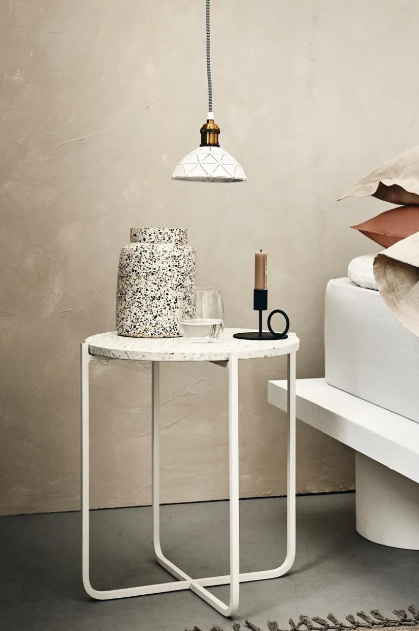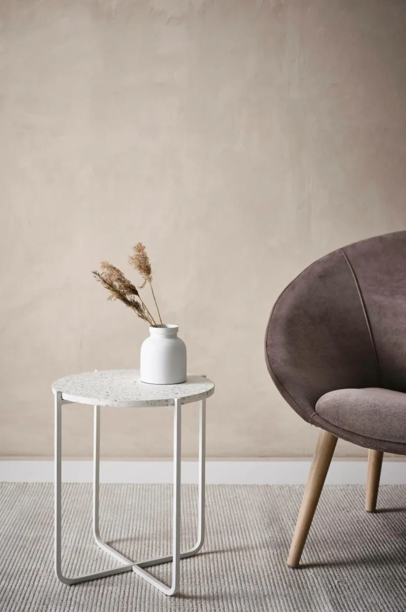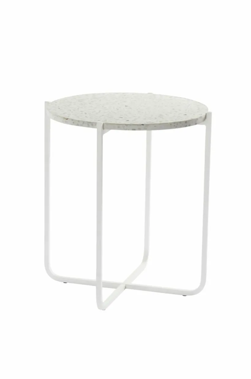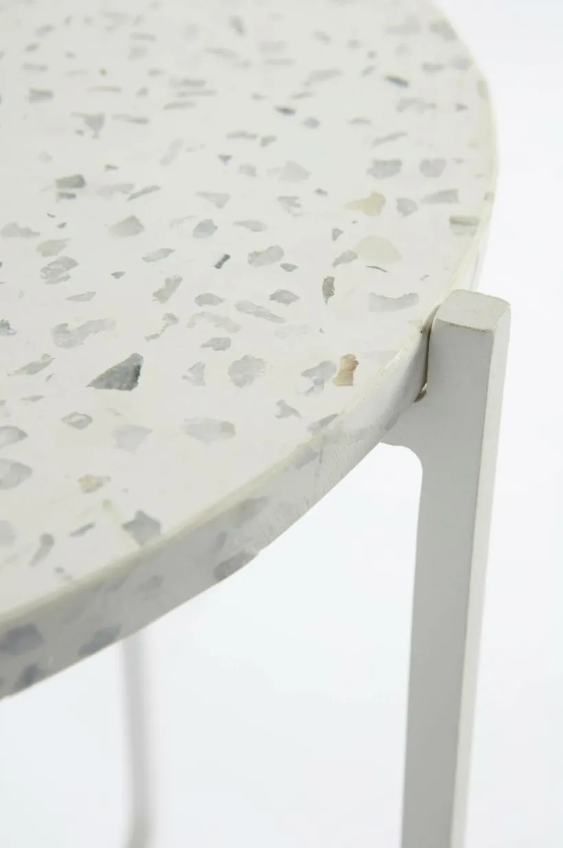 Det runda sidobordet HEYWOOD har en vacker bordsskiva av terrazzo och bordsunderrede av pulverlackerad metall med matt yta. De två materialen står i snygg kontrast till varandra. Terrazzo är en stenskiva med en bas av cement som blandas upp med krossad naturstesten av olika slag. Blandningen av natursten gör varje stenskiva unik och gör att den varierar i utseende från produkt till produkt. Materialet är slitstarkt och har en slät yta. Viss montering krävs.